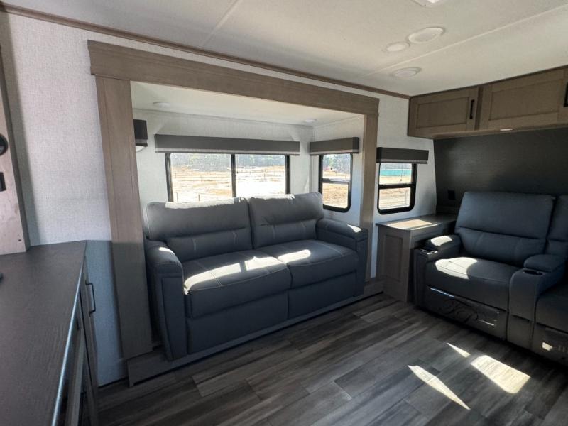 This fifth wheel might be your perfect retreat! The private rear bedroom comes with a standard queen bed, or upgrade to a king for even more room to relax. Up front you'll find a living room perfect for entertaining, with dual tri-fold sofas plus a pair of theater seats. The focal point is the entertainment center which is equipped with a 50" TV on a lift. The central kitchen is well-equipped for cooking, with a 16 cu. ft. refrigerator and a center island. A booth dinette provides great seating, or opt for the swivel dinette.