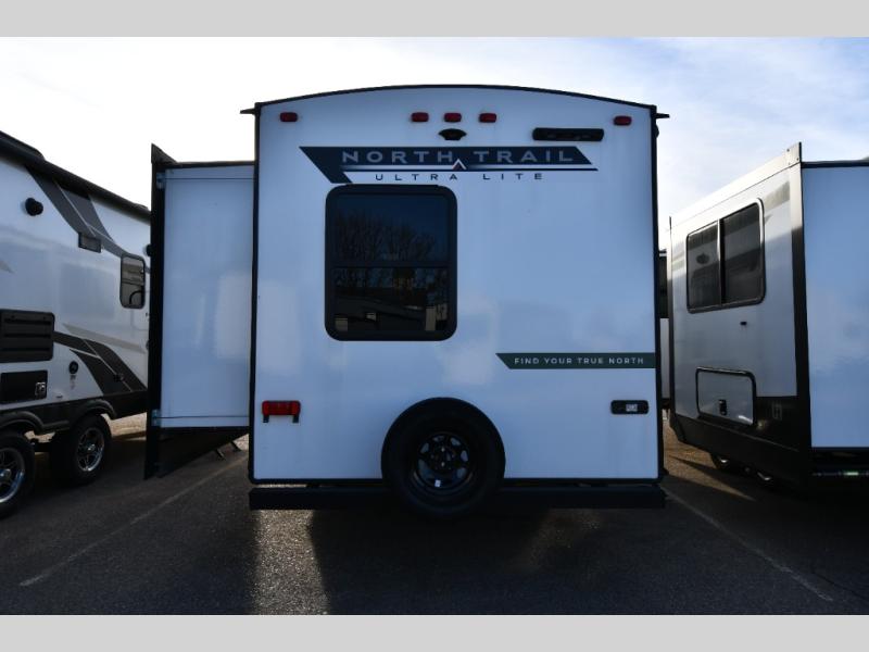 When you choose a North Trail Ultra-Lite travel trailer by Heartland you are choosing comfort, convenience, and quality craftsmanship at its best. The block foam brick insulation, enclosed and heated underbelly, plus Weather Guard thermal protection mean you can camp all year around. Each model features a Wide Trax suspension for a smooth ride, and the backup camera prep and solar prep make camping that much easier if you choose those options. Some of the other exterior features you will appreciate are the outside shower, the power stabilizer jacks and power tongue jack, and the outside speakers to keep the party going. Head inside to find stainless steel appliances, oversized windows, and premium flooring that is tear, slip, mold, mildew and cold crack resistant! You can't beat a North Trail travel trailer. Choose your favorite floorplan today!