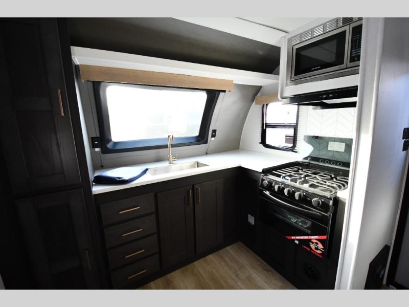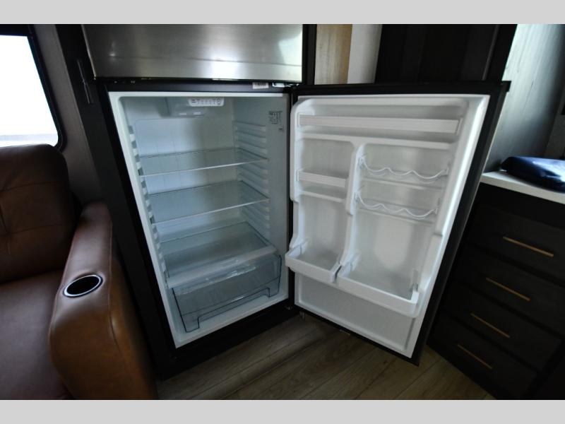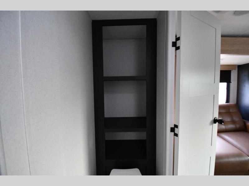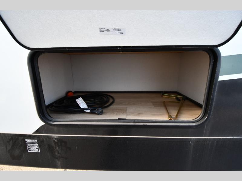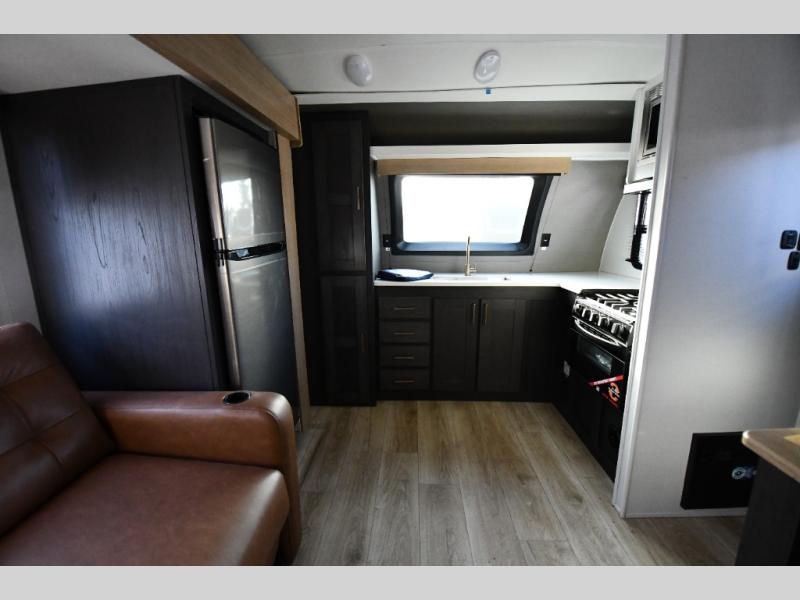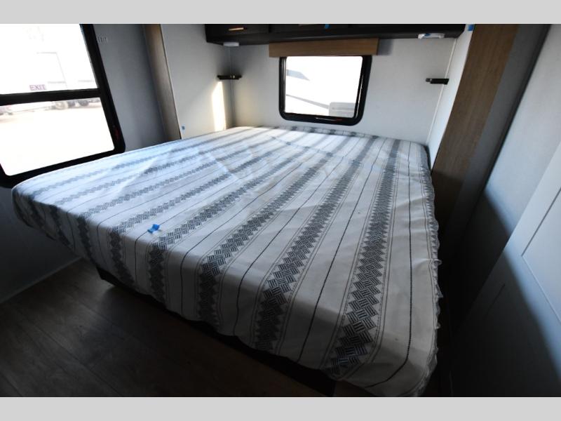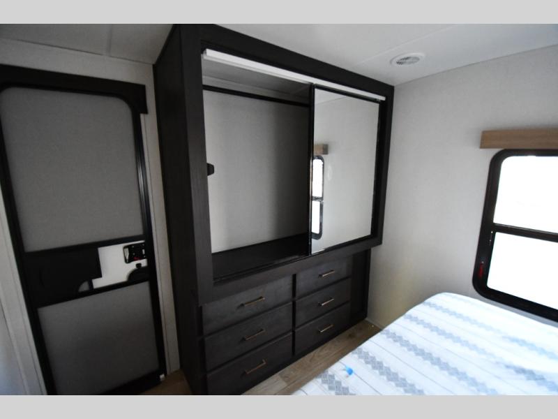 This dual entry travel trailer is perfect for weekend getaways at the campground. You will enjoy the front kitchen with counter space, a large pantry, and a 10.7 cu. ft. 12V refrigerator. Your crew can dine at the convertible sleeper sofa with stowaway table, or you can take your plate outdoors to sit under the 18' power awning with LED lights. This model includes a walk through bath that will create a master bedroom you are sure to love. Here, you'll find a 68" x 76" king bed slide and a large bedroom wardrobe to keep your clothes tidy, plus one of the entrance/exit doors to the unit.