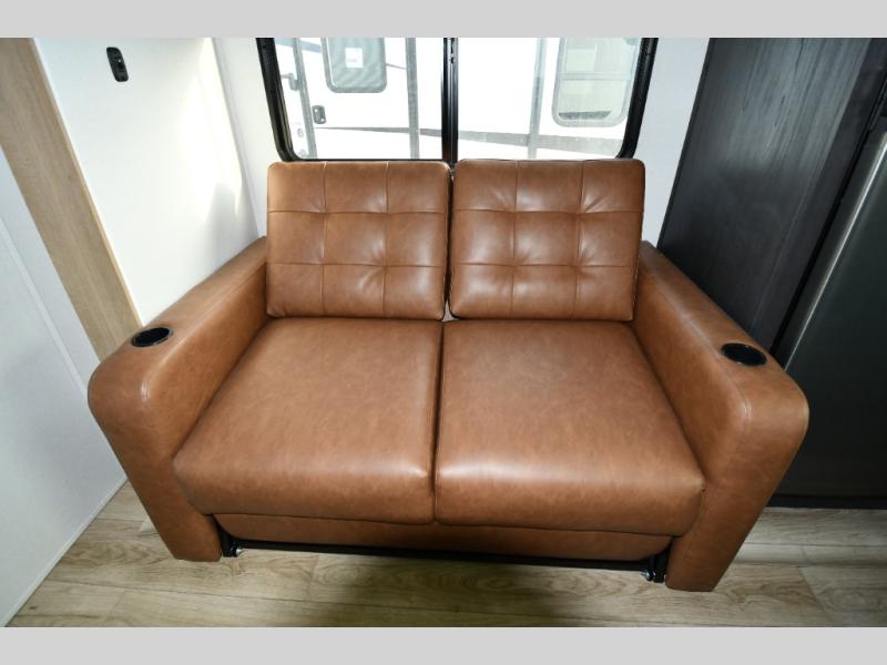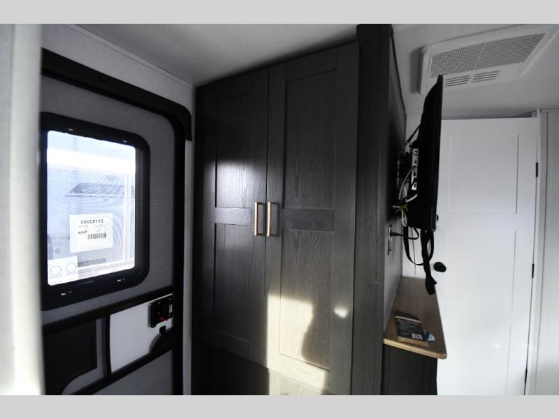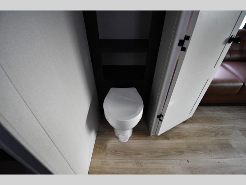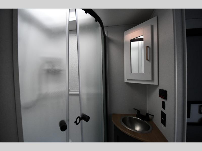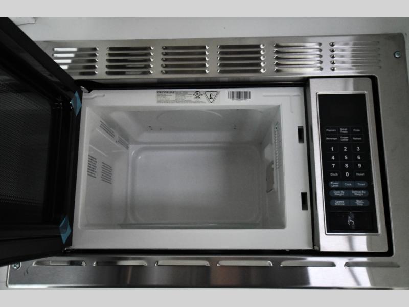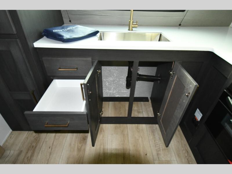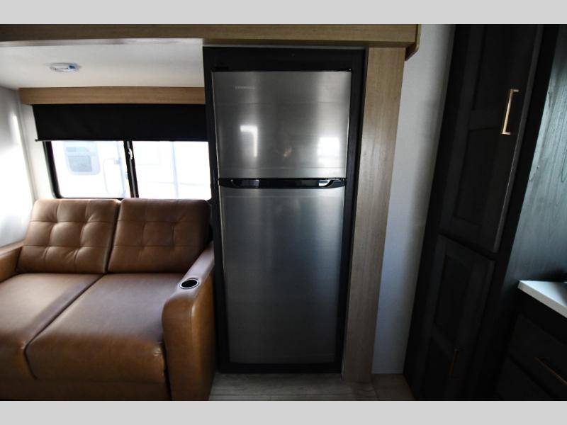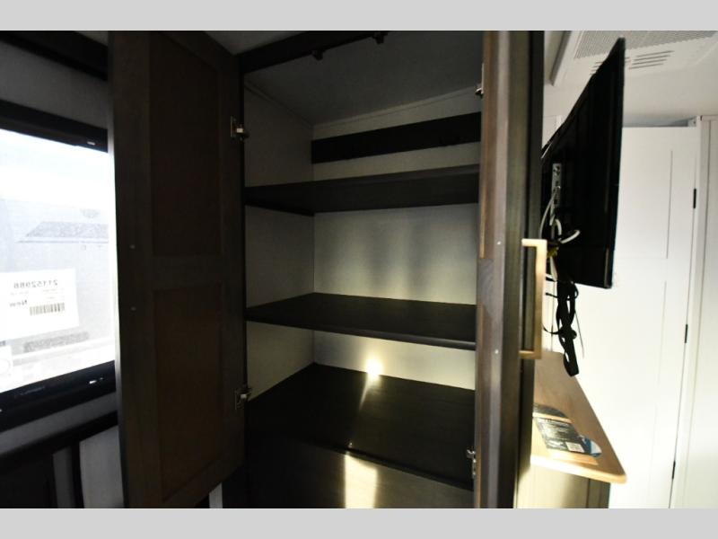 This dual entry travel trailer is perfect for weekend getaways at the campground. You will enjoy the front kitchen with counter space, a large pantry, and a 10.7 cu. ft. 12V refrigerator. Your crew can dine at the convertible sleeper sofa with stowaway table, or you can take your plate outdoors to sit under the 18' power awning with LED lights. This model includes a walk through bath that will create a master bedroom you are sure to love. Here, you'll find a 68" x 76" king bed slide and a large bedroom wardrobe to keep your clothes tidy, plus one of the entrance/exit doors to the unit.