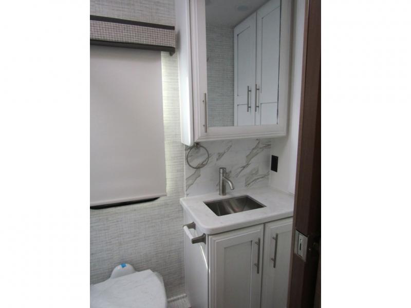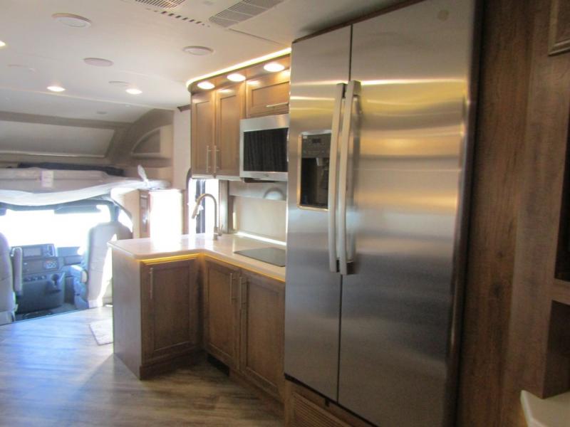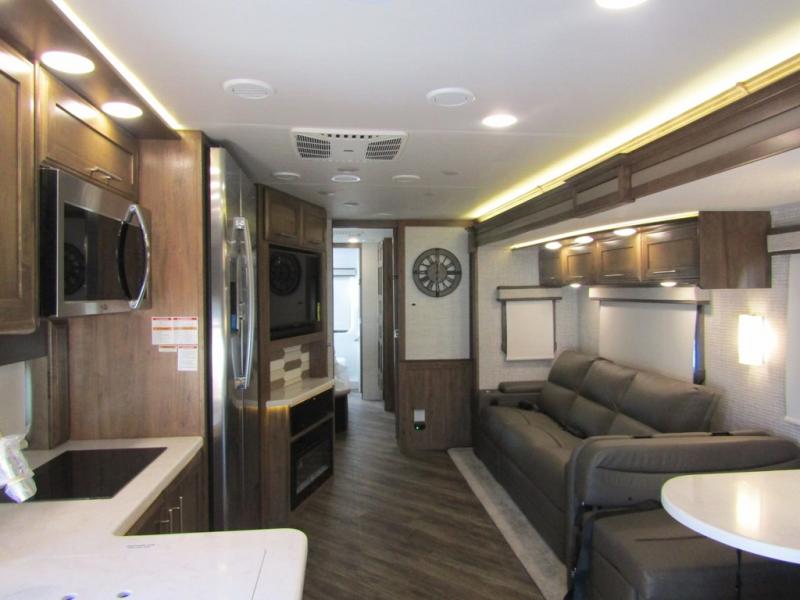 You will find lots to love with this motorhome! From the bath and a half to the bunk over cab and outside entertainment center. The chef can prepare their best meals with the two burner induction cooktop and the residential refrigerator. There's a large pantry next to the booth dinette so you can quickly grab a snack during game night or if you prefer to relax instead then you can enjoy the fireplace and 39" LED HD Smart Fire TV while sitting on the 93" reclining sofa. The master suite has a king bed slide with a power head lift to lay your head on at night, a LED HD Smart TV with a wardrobe and storage area next to it, as well as an area prepped to add an optional washer and dryer. You even have access to the full rear bathroom which has a 30" x 36" shower and a wardrobe to keep your linens close.