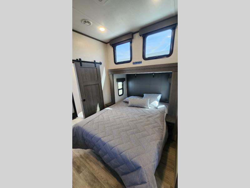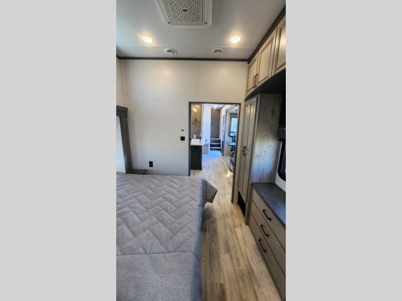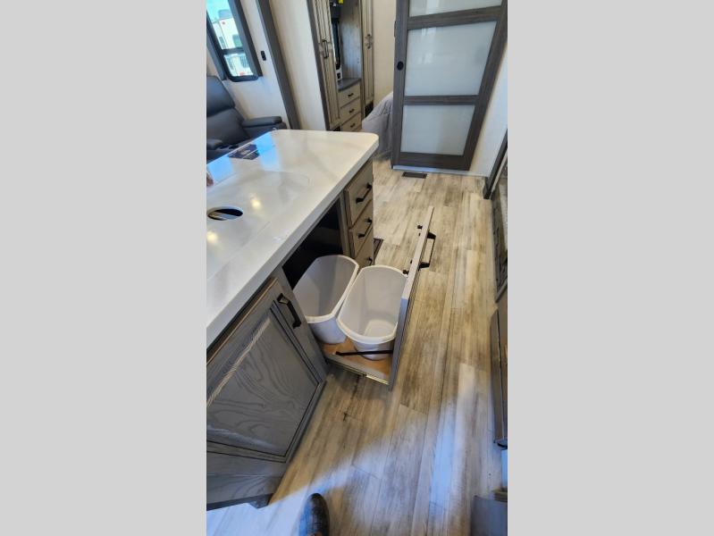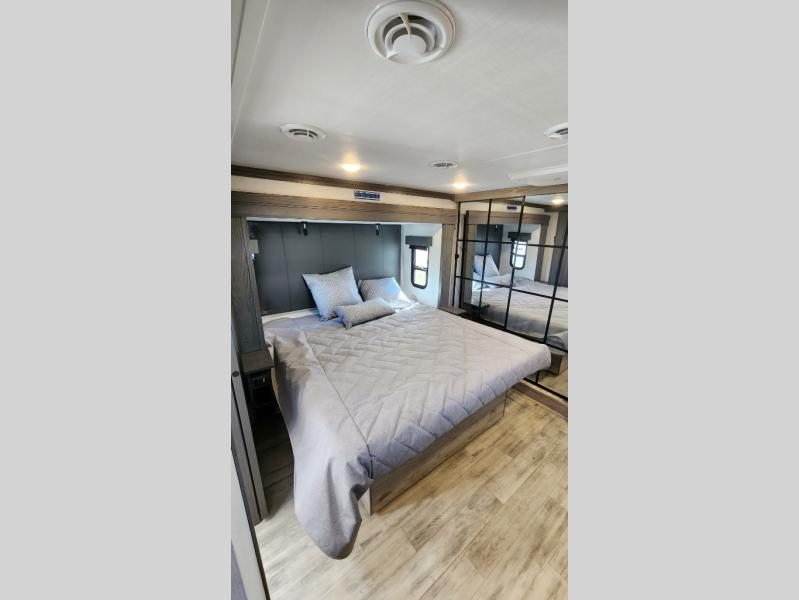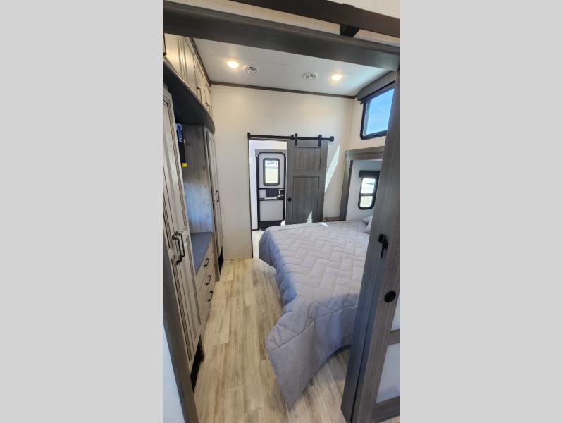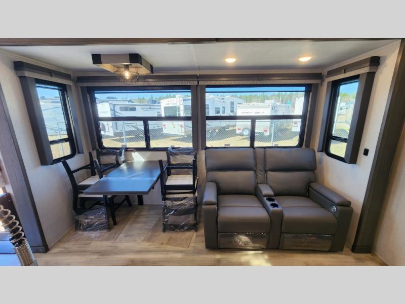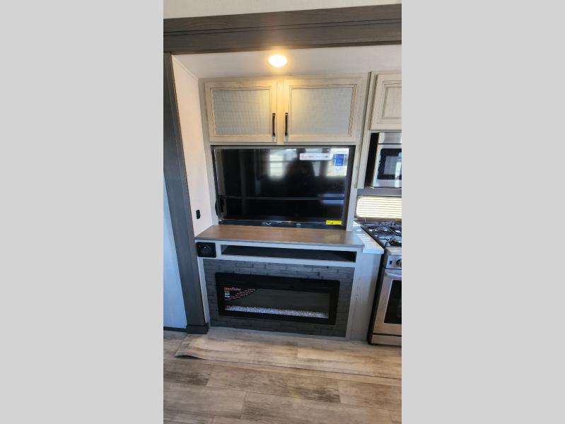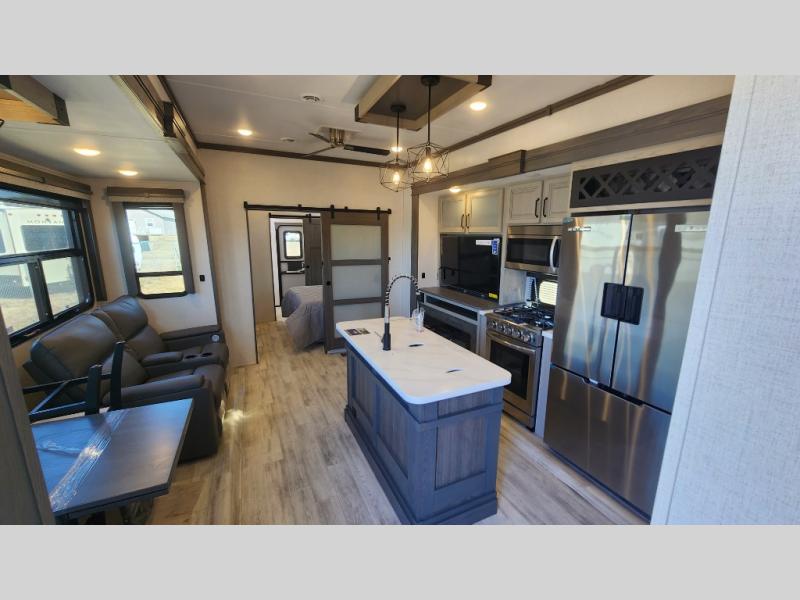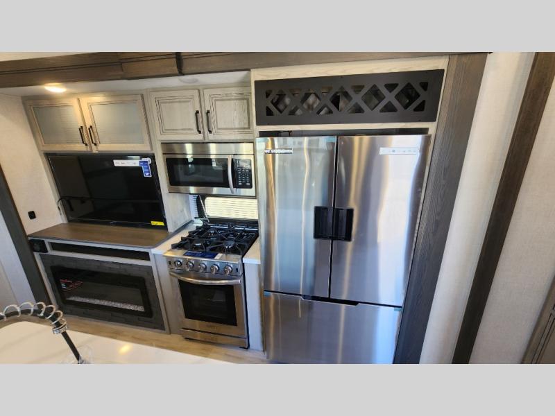 Get ready for family fun in this fifth wheel offering a front master bedroom with a king-size bed slide, plus a second master bedroom for your guests! The second bedroom includes a queen-size bed slide and a spacious rear full bathroom with a private entry/exit. The open concept main living and kitchen area offers dual opposing slides which includes theater seating, a free standing dinette, a fireplace, a center island and walk-in pantry. These full kitchen amenities are sure to make meal prep and cooking easy, especially with a convection microwave, Insignia kitchen appliances, and an 18 cu. ft. residential refrigerator with an ice maker.