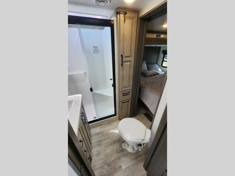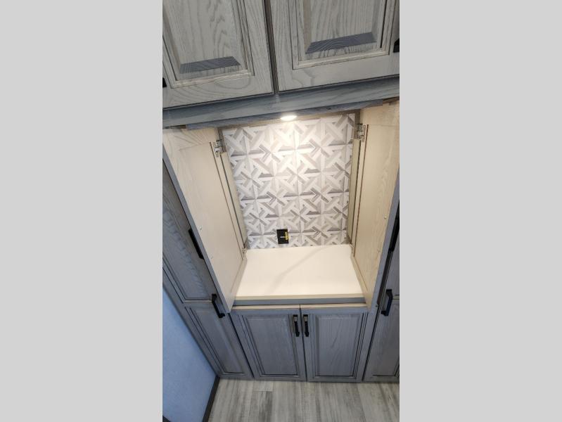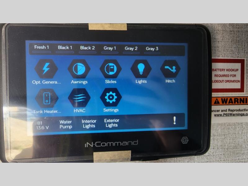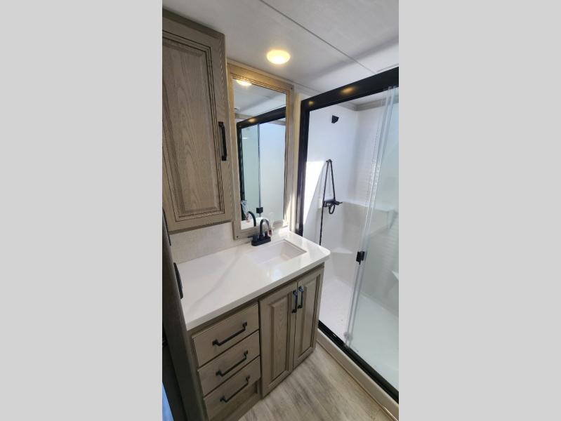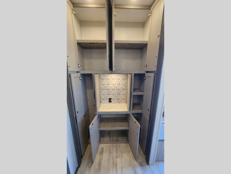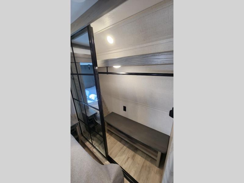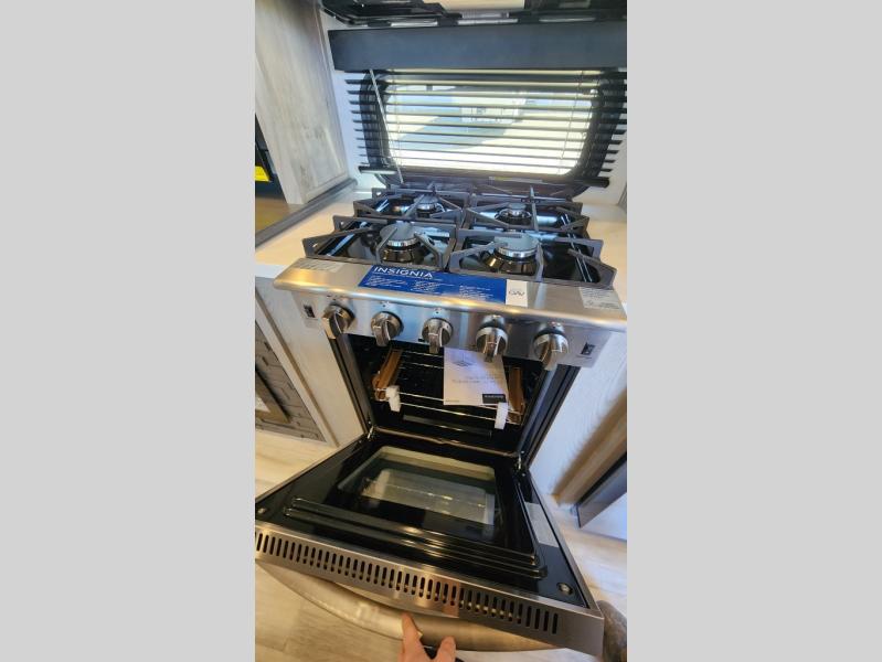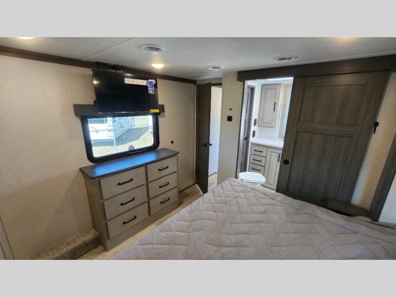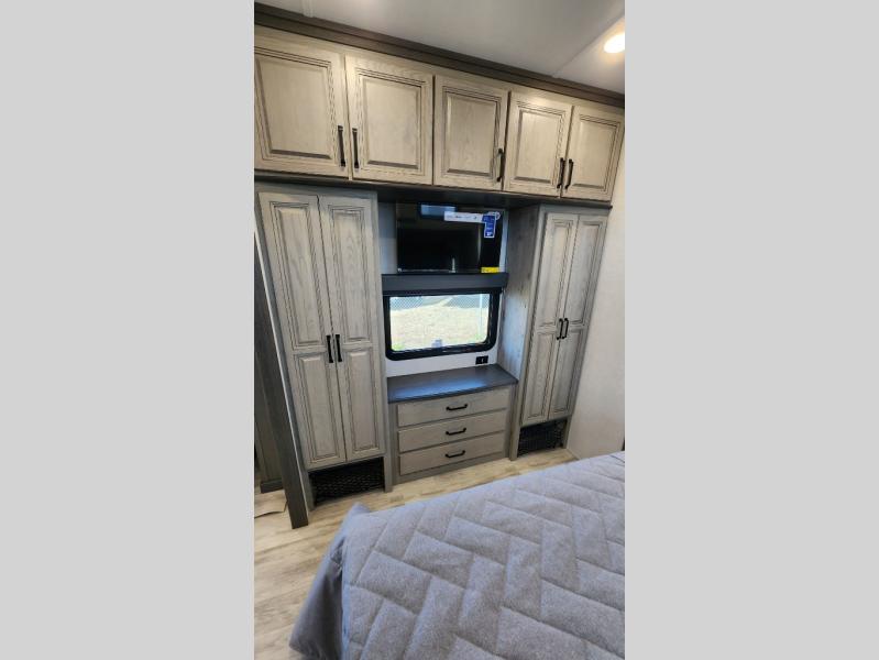 Get ready for family fun in this fifth wheel offering a front master bedroom with a king-size bed slide, plus a second master bedroom for your guests! The second bedroom includes a queen-size bed slide and a spacious rear full bathroom with a private entry/exit. The open concept main living and kitchen area offers dual opposing slides which includes theater seating, a free standing dinette, a fireplace, a center island and walk-in pantry. These full kitchen amenities are sure to make meal prep and cooking easy, especially with a convection microwave, Insignia kitchen appliances, and an 18 cu. ft. residential refrigerator with an ice maker.