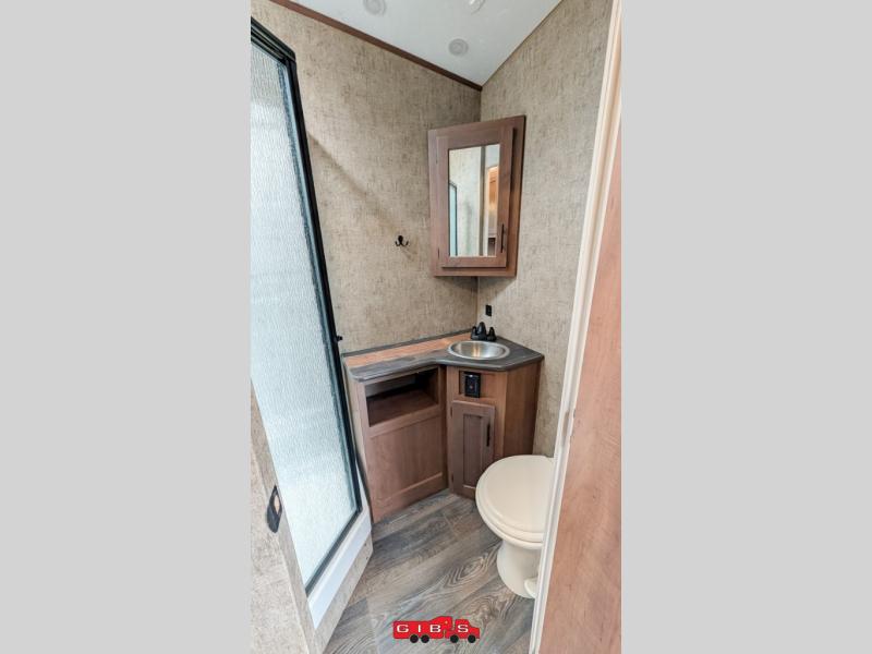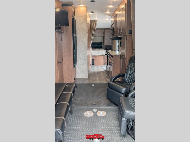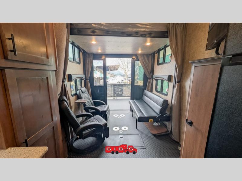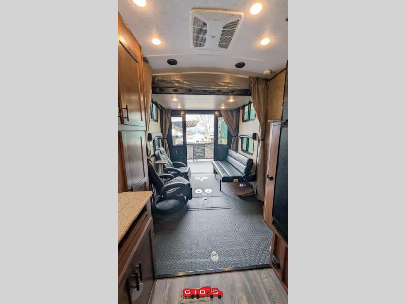 Pack your bags and load up your favorite off-road toy with the 3,000 lb. ramp door into this toy hauler! The 9' 9" garage area has a loft queen bed above a sofa, two recliners which can be switched out for an optional sofa, and a 32" swing out TV for a relaxing evening indoors. There is even an in-floor tool box for your convenience. After a fun day on the trails, freshen up in the full bathroom with a neo-angled shower that has a skylight above to bring the outdoors inside. Enjoy a good night's rest each night on the front 60" x 74" queen bed which has wardrobes on either side to keep your clothes looking their best!