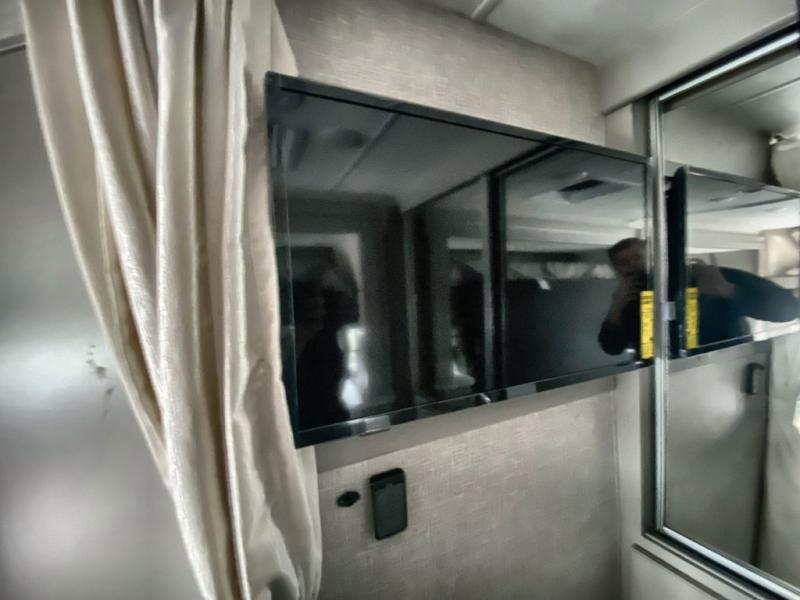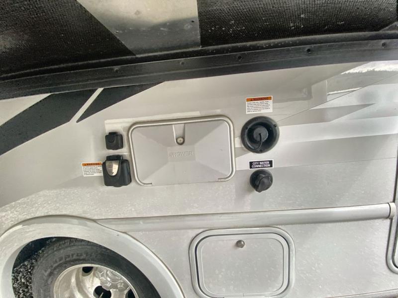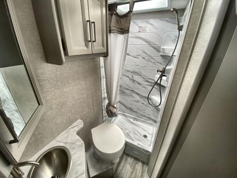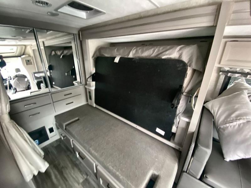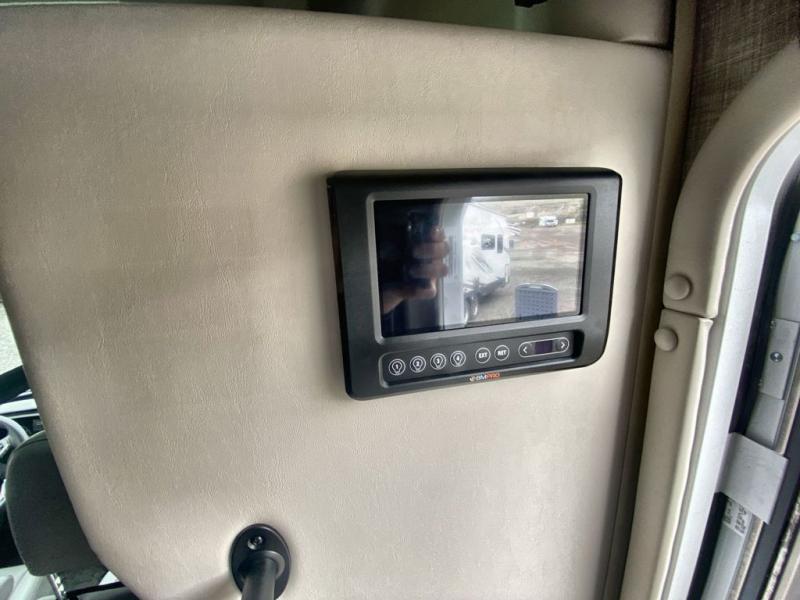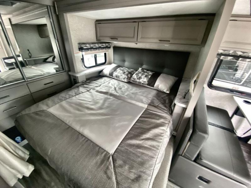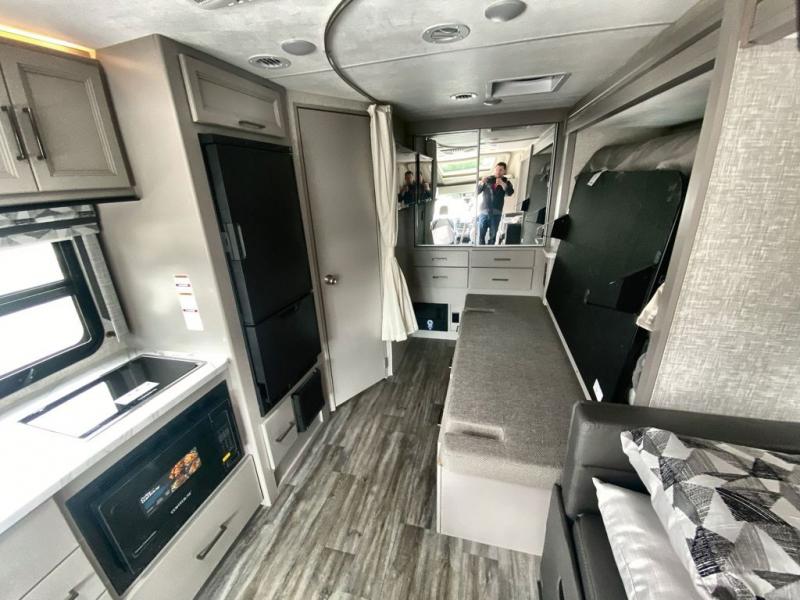 You will have everything you need in this motorhome for a comfortable trip! Create your own private bedroom with privacy curtain to close off the flip-up RV queen bed with cushioned seating underneath, the wardrobe, and the 32" TV. You can prepare delicious home cooked meals with the electric start two burner gas cooktop, keep your perishables fresh in the 12V dual door refrigerator, and enjoy your meals at the 68" dream dinette. There is also an entryway 32" TV to watch your favorite movies and a built-in skylight for more natural lighting. Start and end your days feeling squeaky clean in the rear corner bathroom with the 24" x 32" shower!