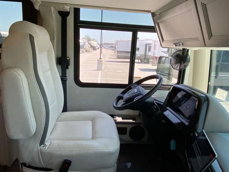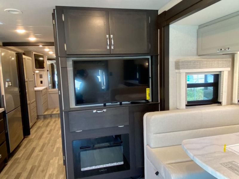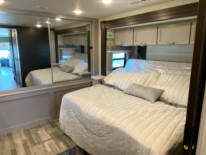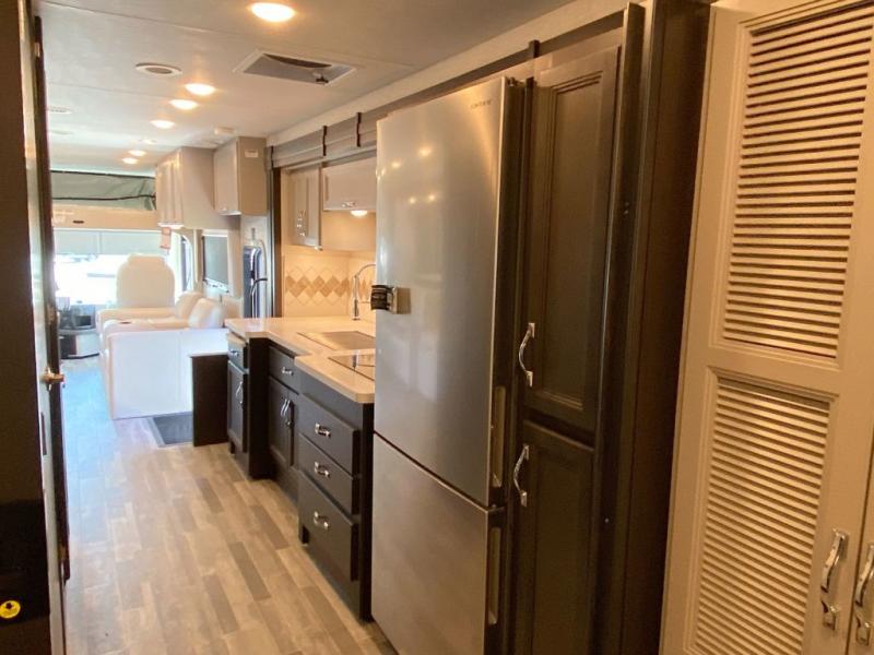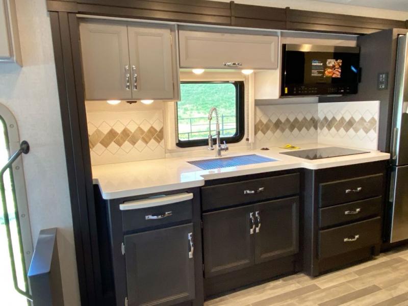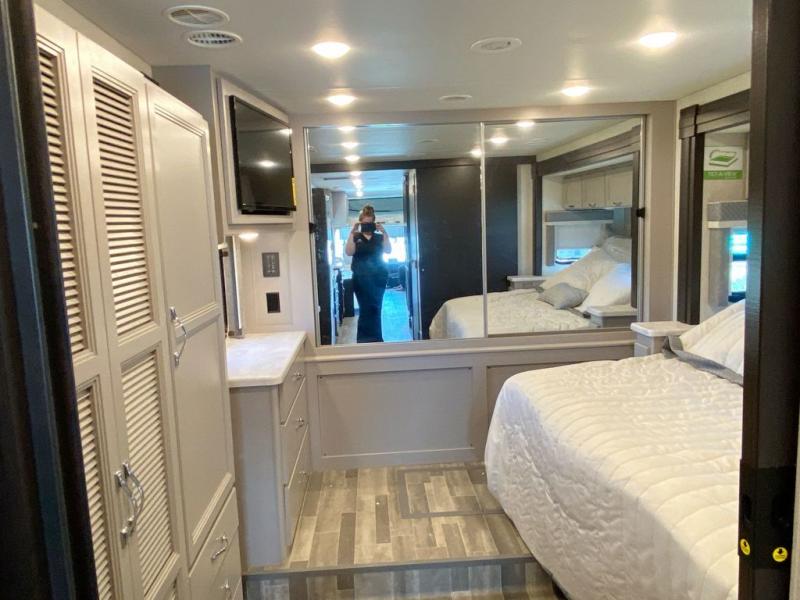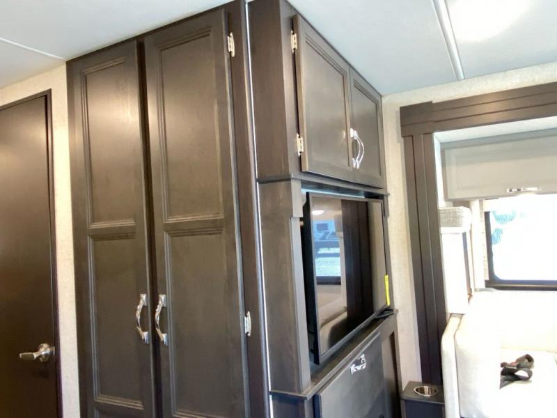 You can't beat the luxury you'll find in this motorhome that can sleep seven each night. You'll love waking up each day on your Tilt-A-View inclining king bed, and there is a full-length closet to store all your clothes. The stacked washer and dryer will allow you to start a load of laundry before you head to the kitchen for breakfast. Whether you're making eggs on the electric induction cooktop, or making oatmeal in the convection microwave, you're sure to find everything you need in this Palazzo kitchen. The main living area will be a spot everyone will love to gather in, especially with a Dream Dinette, a trifold sofa, plus inclining theater seats. There is an overhead bunk the little ones will love, and the retractable TV and fireplace will make this whole area feel more like home!