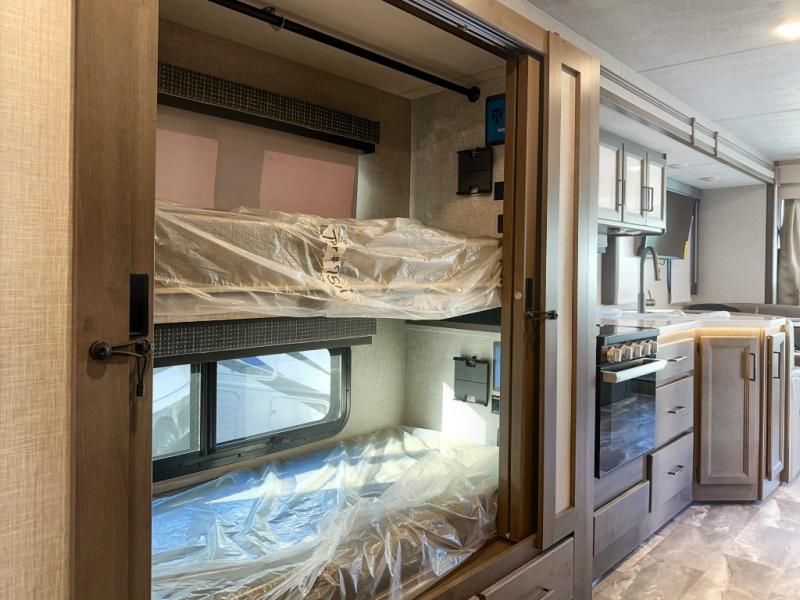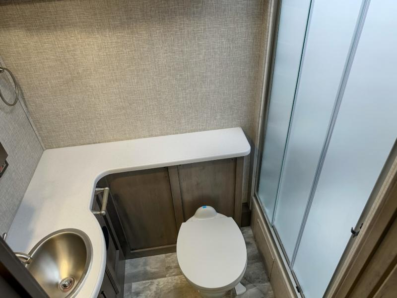 This Windsport Class A gas motorhome gives you a great relaxation area with a 70" Dream Dinette, 68" sofa bed, LED TV, and USB charging ports. This coach also offers you lots of sleeping space with the king bed back in the private bedroom, the 27" x 74" bunk beds on the full-wall slide, and the drop-down overhead bunk above the cab. You can also create more sleeping space when you turn the dinette and sofa into beds. The full bathroom offers you a 30" x 36" shower with skylight and glass door, and you will love how convenient the kitchen will be with its residential refrigerator, pantry, three-burner gas cooktop, microwave, and double-bowl sink.