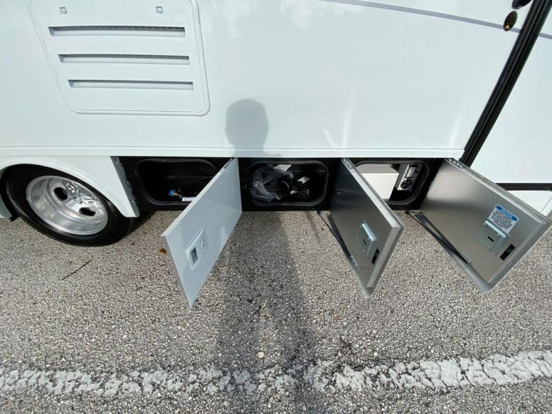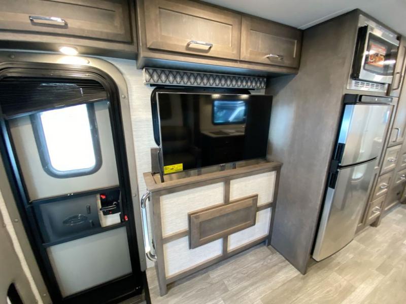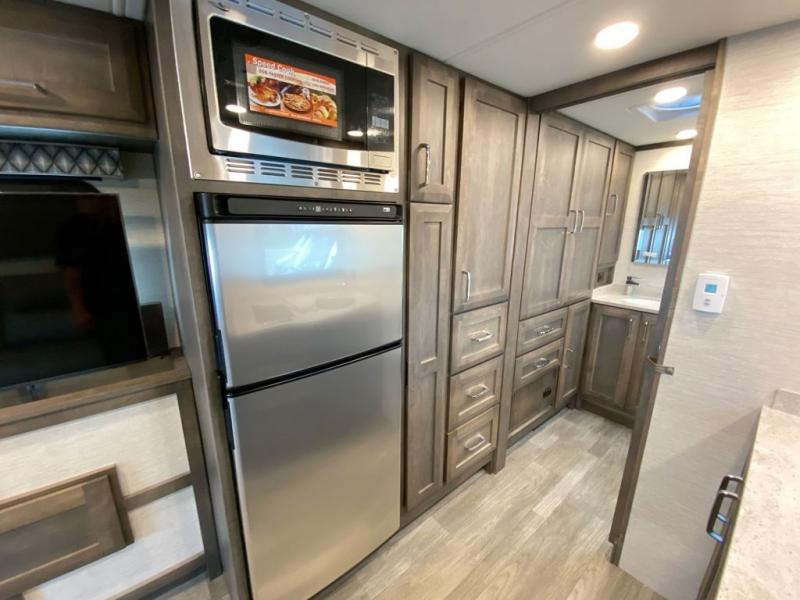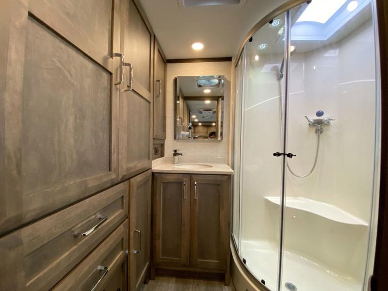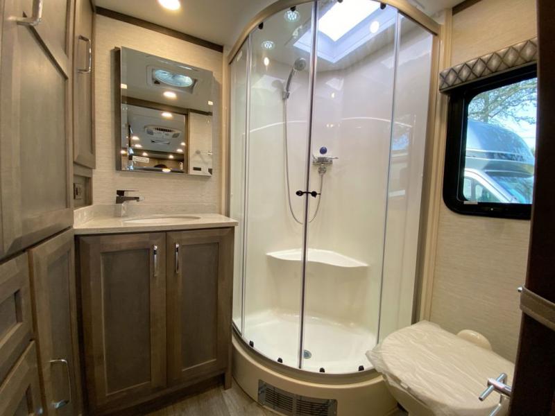 Comfort is found throughout in this spacious coach. There is a comfortable queen-sized Murphy bed to sleep on at night and a sofa to relax on during the day. You can prepare breakfast on the induction cooktop or use the stainless steel convection microwave, and leftovers can go in the 8 cu. ft. refrigerator. This model includes a full bath with a solid surface lavatory top, a roof vent fan, and a radius shower, and you'll find plenty of storage space between the two storage closets and the wardrobe! When you're ready to head to the next campground, you will enjoy the adjustable captain's seats and colored multi-function touch screen AM/FM stereo with SYNC 3, Bluetooth, navigation, and dual USB ports for the ultimate driving experience!