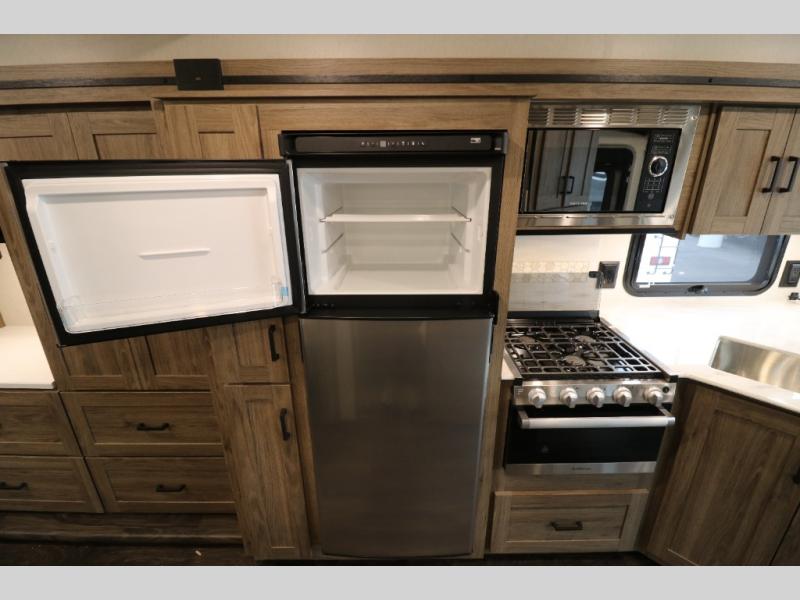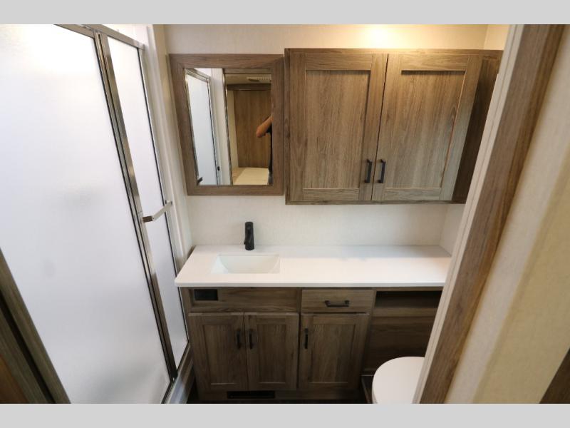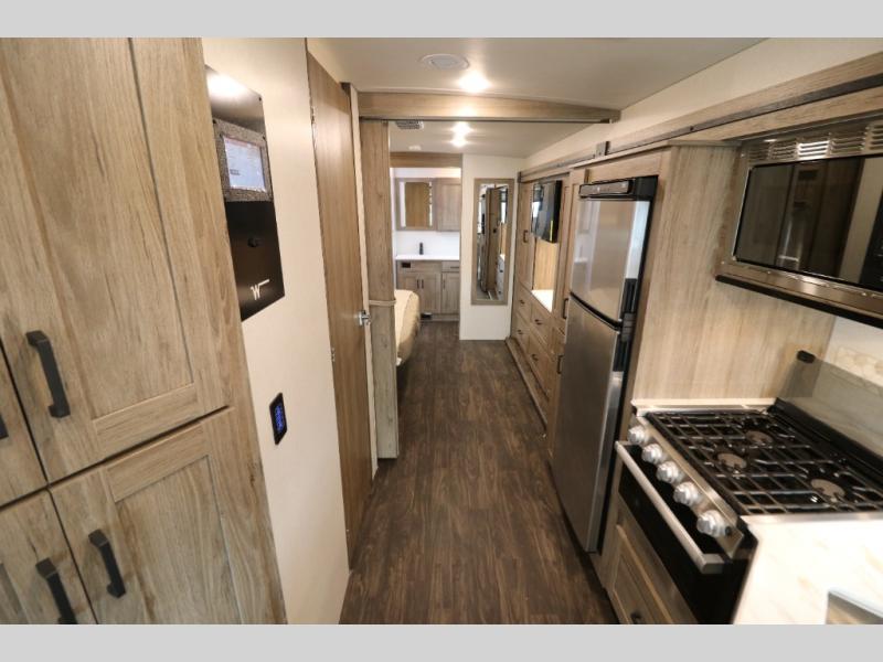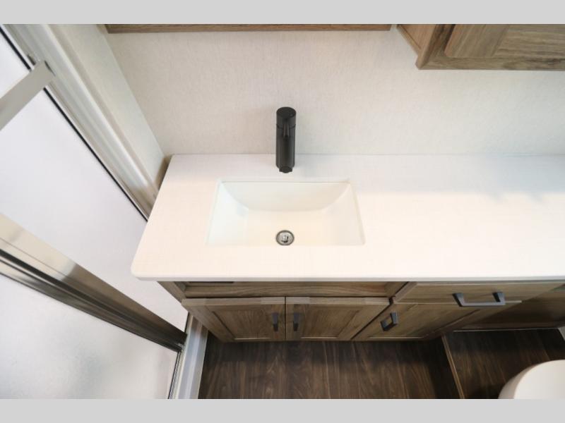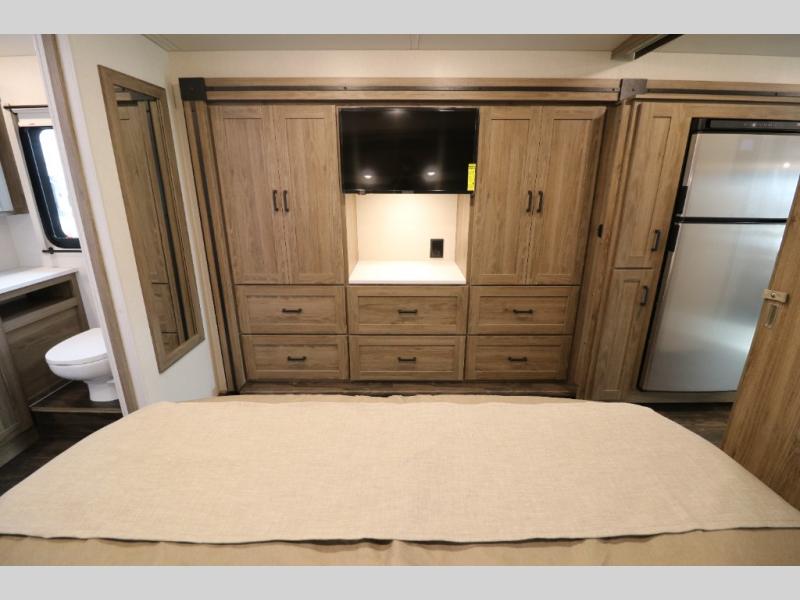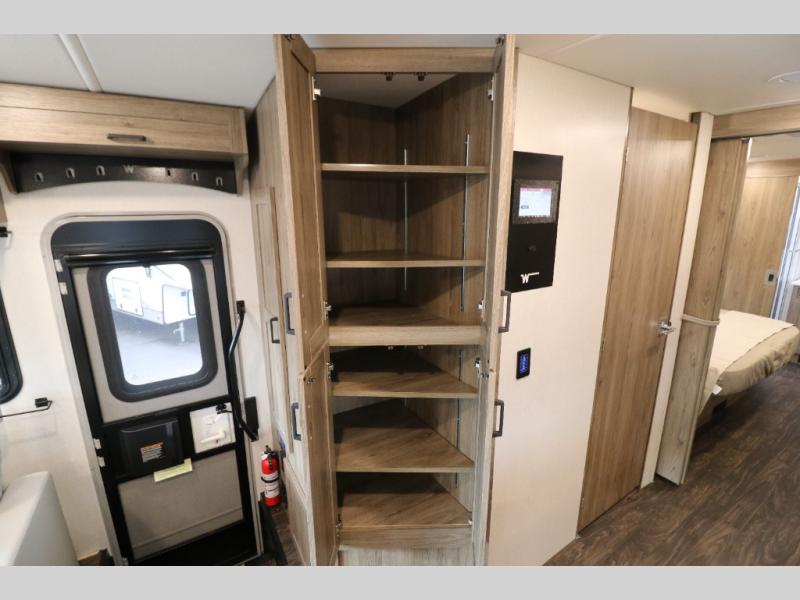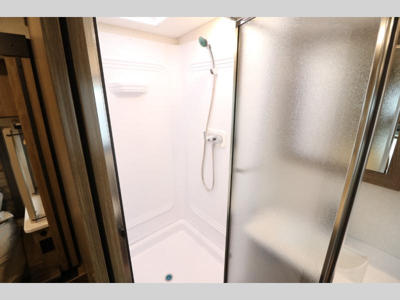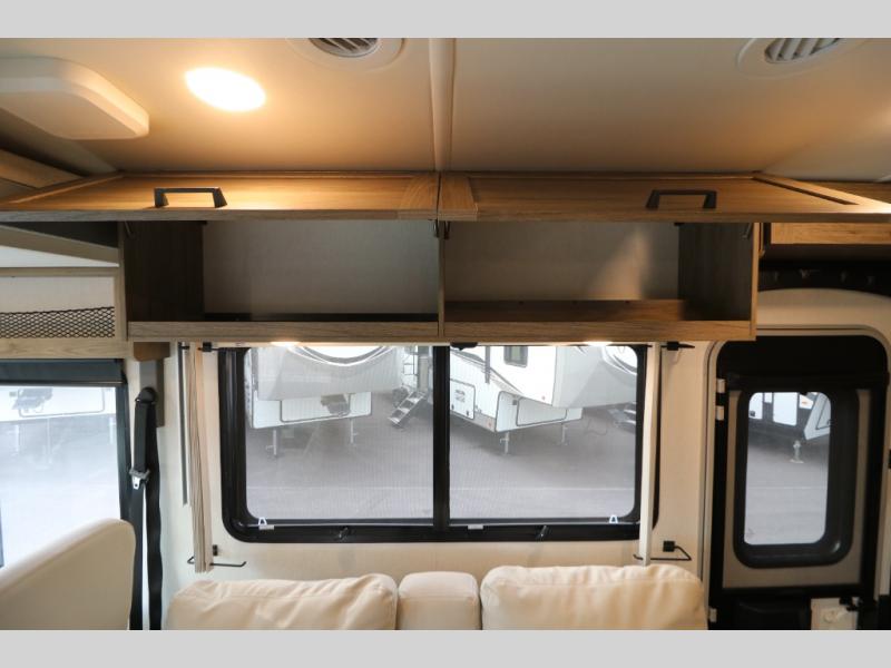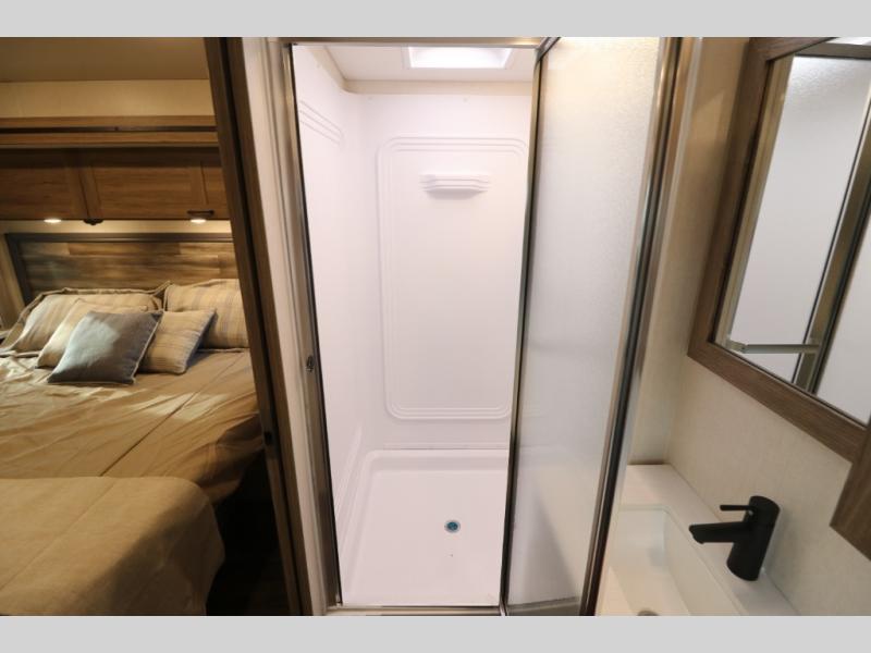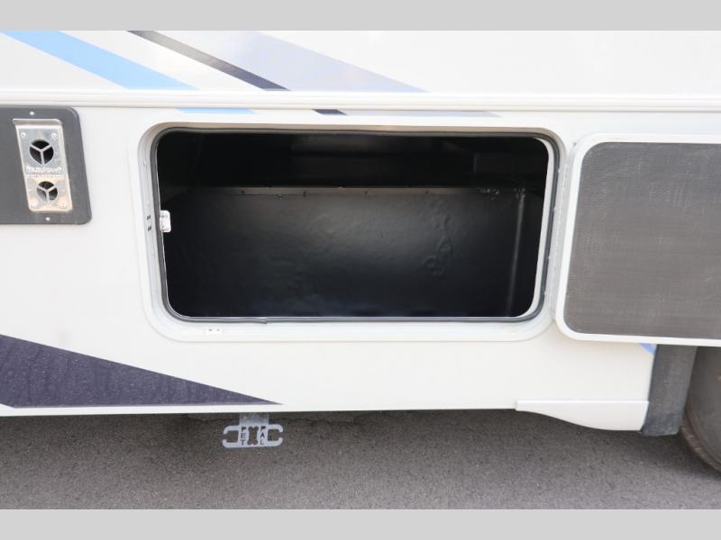 This Class A Vista from Winnebago has tons of great features. You'll love the private bedroom that includes a king bed, dual wardrobes, and a full rear bath with a 36" x 36" shower. An additional half bath is convenient for guests or when you have a big group travelling together. There are plenty of places to sleep, with a standard sofa bed and an optional StudioLoft drop-down bed that is designed to accommodate two additional guests with a generous 600-lb. capacity. The well-equipped kitchen has a three-burner cooktop, stainless steel double sink, 10 cu. ft. refrigerator, and two pantries. An additional coat closet by the door plus exterior lighted storage compartments means there's plenty of room for all your gear.
