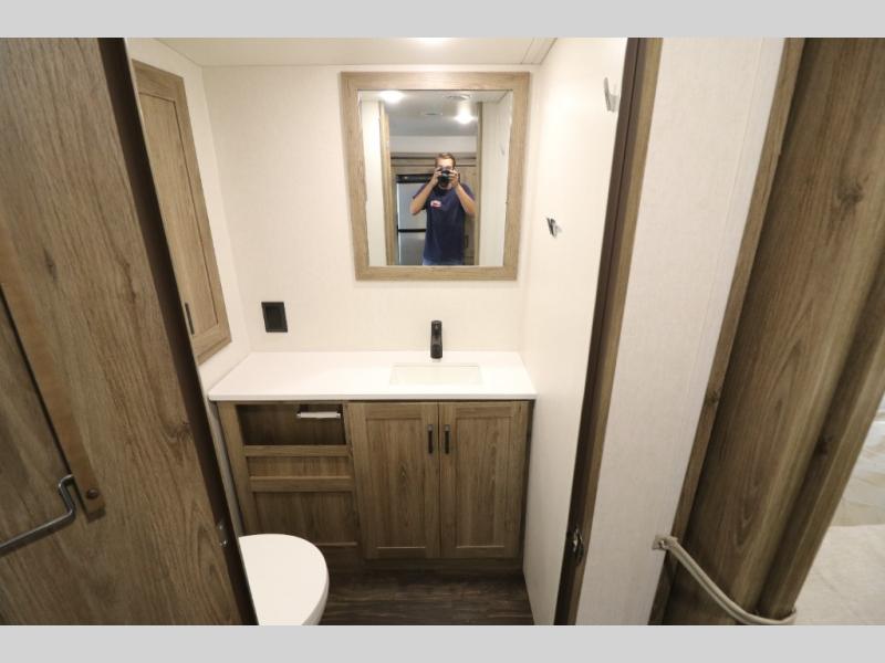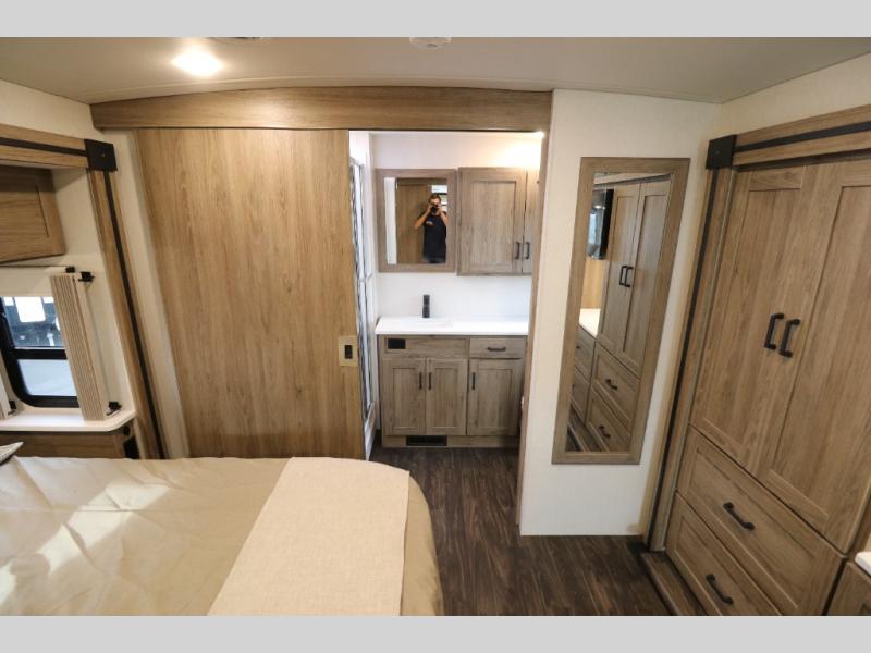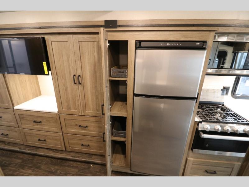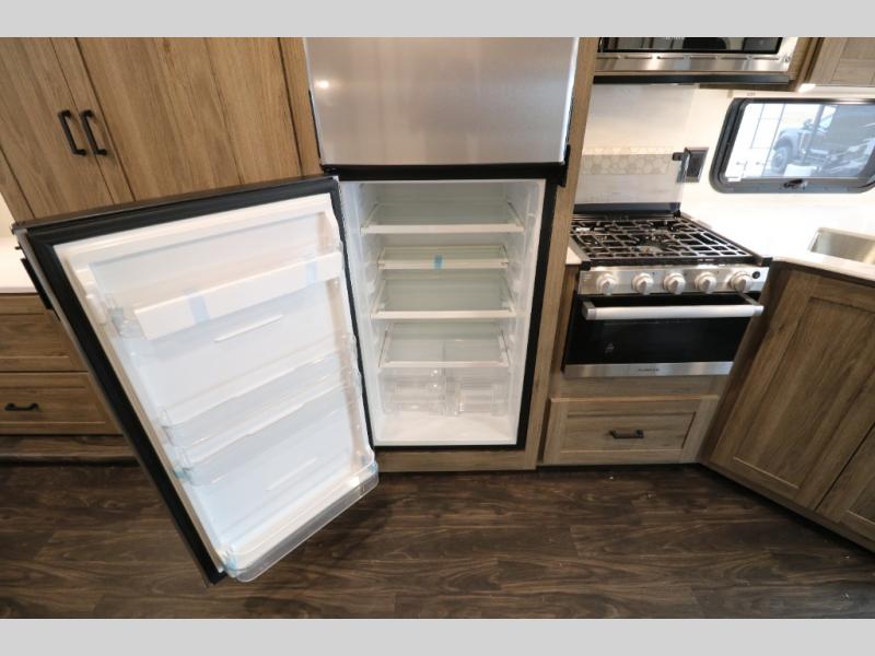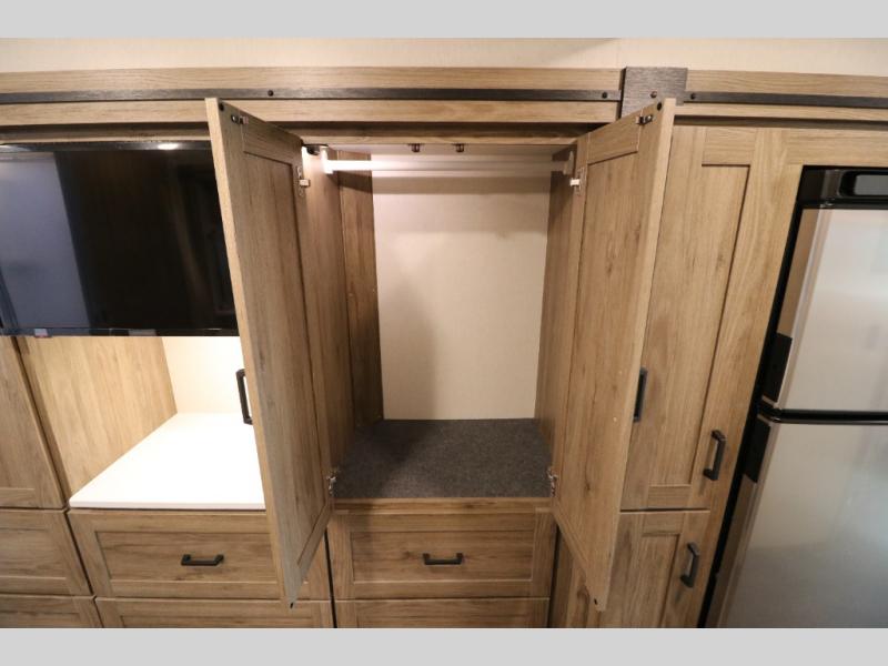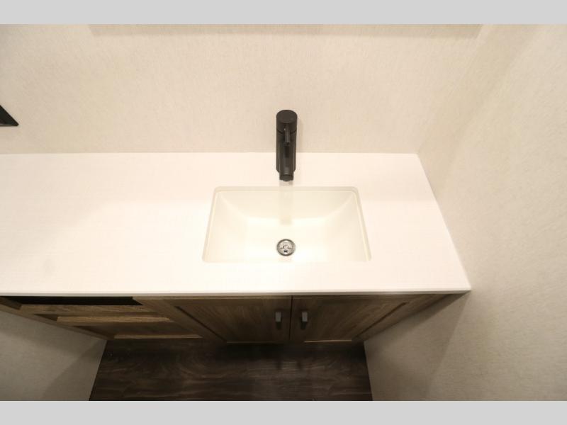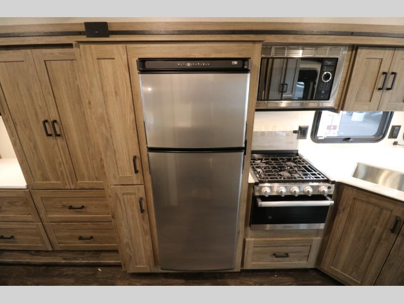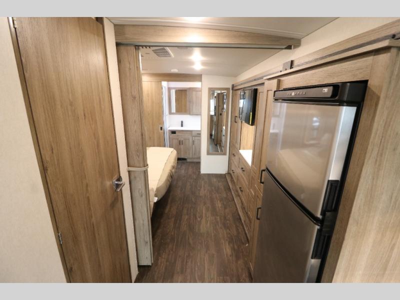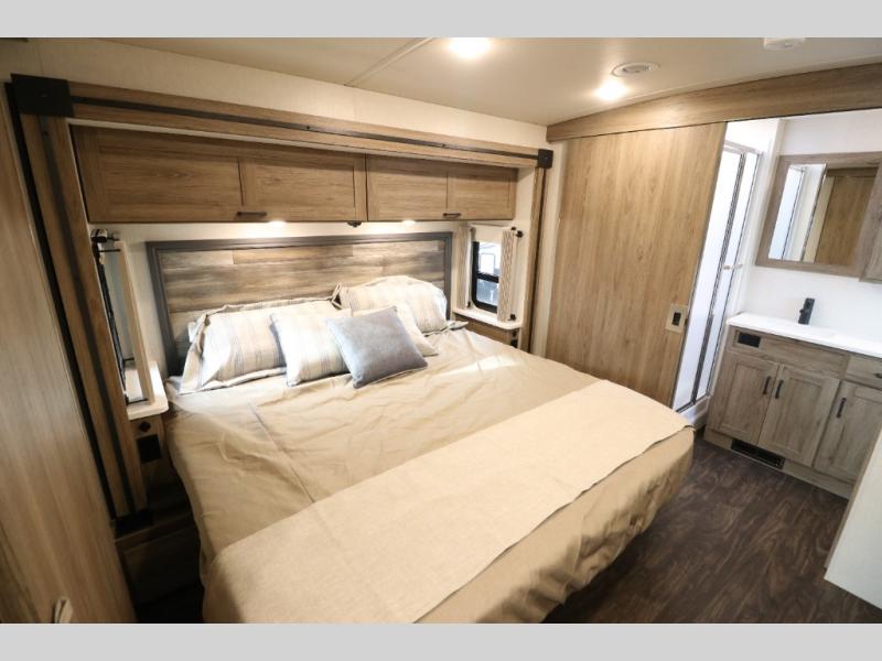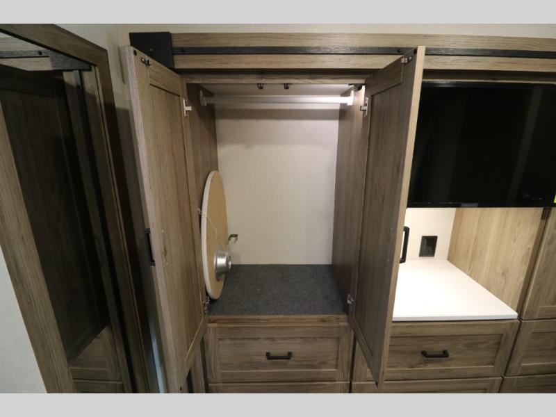 This Class A Vista from Winnebago has tons of great features. You'll love the private bedroom that includes a king bed, dual wardrobes, and a full rear bath with a 36" x 36" shower. An additional half bath is convenient for guests or when you have a big group travelling together. There are plenty of places to sleep, with a standard sofa bed and an optional StudioLoft drop-down bed that is designed to accommodate two additional guests with a generous 600-lb. capacity. The well-equipped kitchen has a three-burner cooktop, stainless steel double sink, 10 cu. ft. refrigerator, and two pantries. An additional coat closet by the door plus exterior lighted storage compartments means there's plenty of room for all your gear.