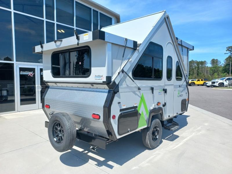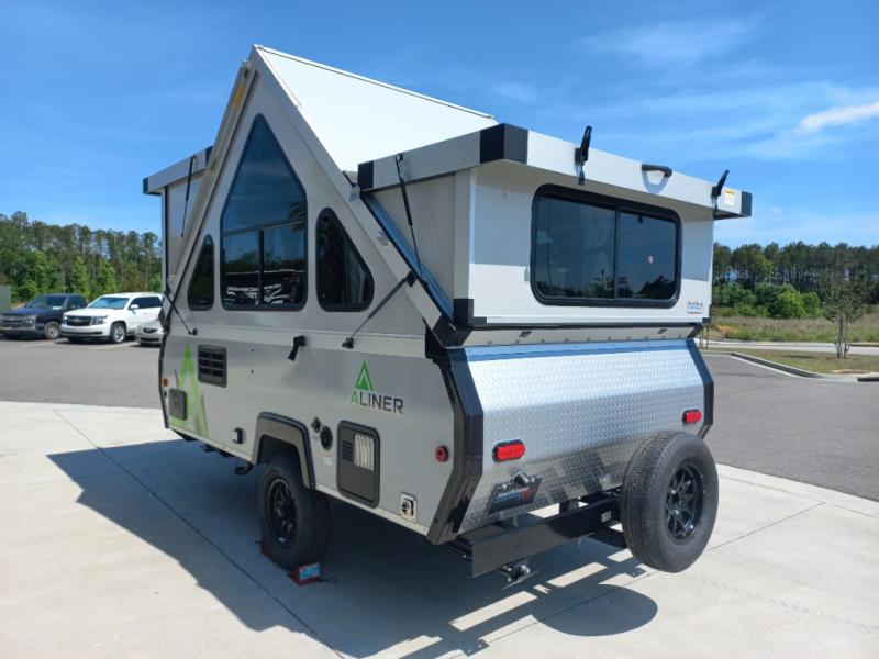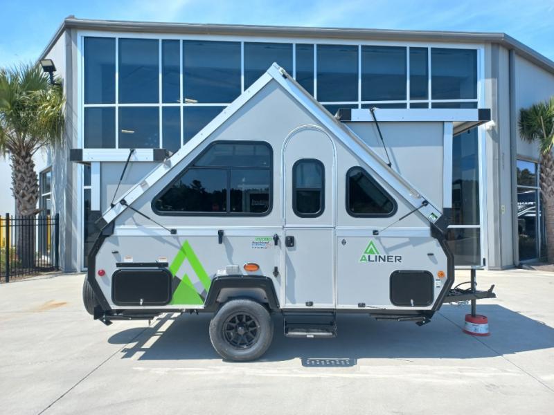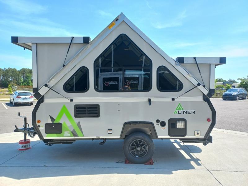 With any Aliner Classic A-frame folding pop-up camper you will find Azdel lightweight, composite interior wall and ceiling panels for added durability and strength. The additional corner windows provide panoramic views, and the hardwood cabinet doors will give these campers a more at-home feel. Four stabilizer jacks come standard, along with dual propane tanks, an exterior outlet, and an outside shower. It's no wonder these campers are named classic! Choose your model and start camping today!
