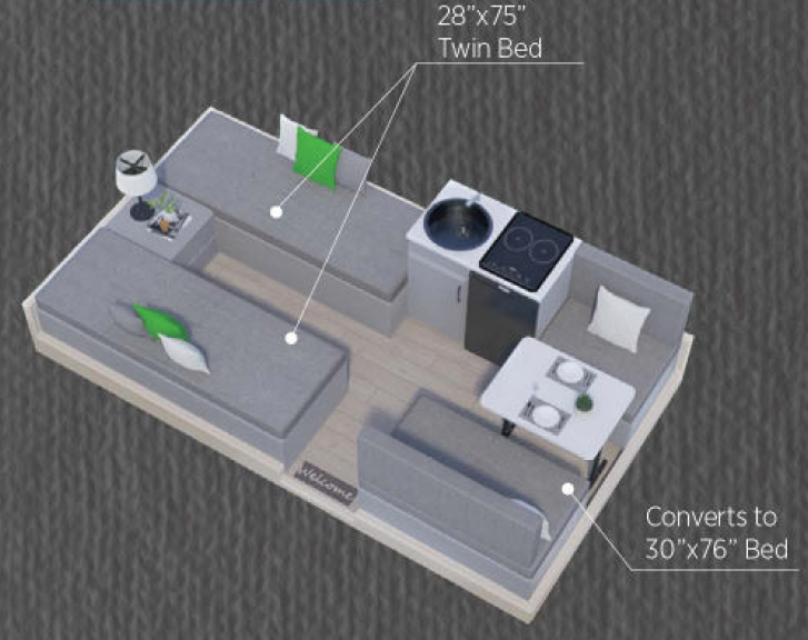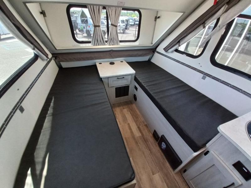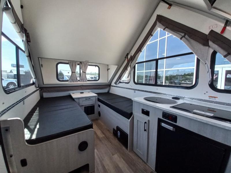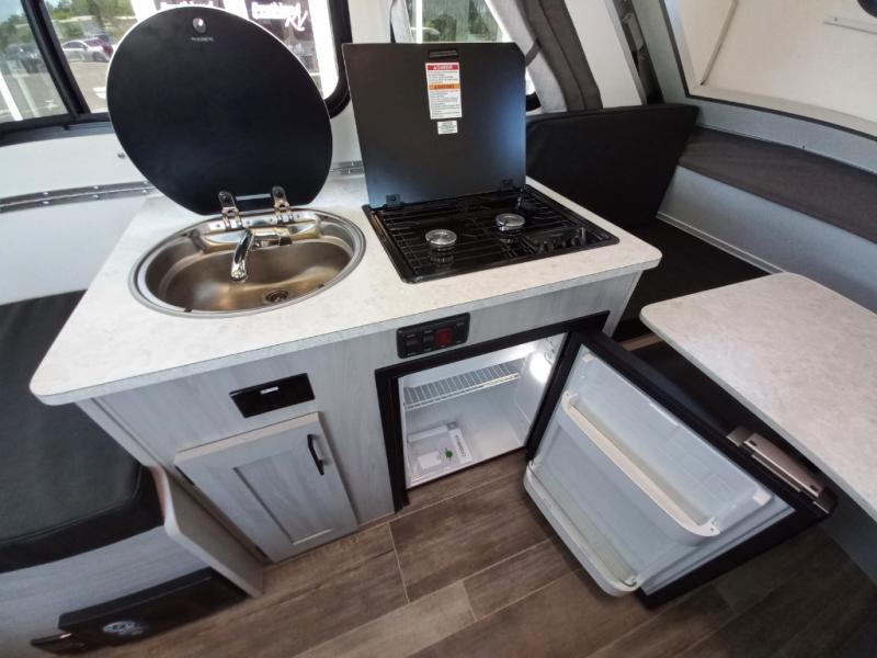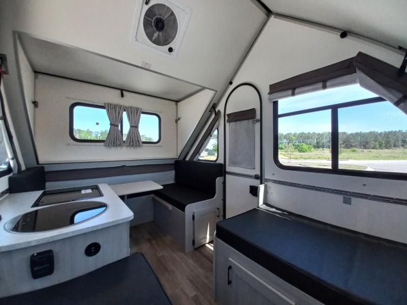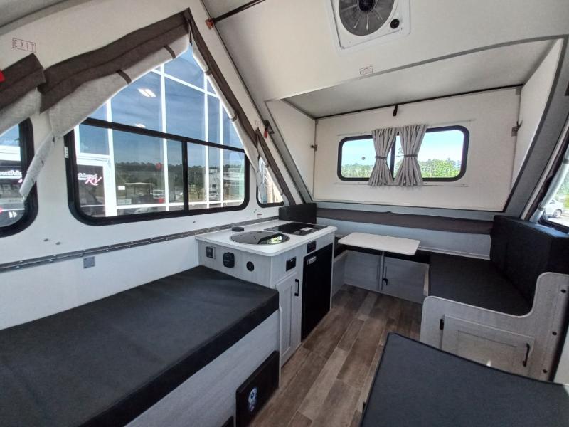 Pack your bags and be on the road in no-time with this lightweight A-frame camper that can sleep three people. You'll enjoy having two 28" x 75" permanent twin beds with storage underneath for your shoes or bags, and if you have a guest sleep over, they can sleep on the dinette that converts to a 46" x 76" bed. Whip up a hearty lunch on the two burner in/out stove, or use the convenient microwave oven. There is also a 3.0 cu. ft. 2-way refrigerator for perishables and additional storage space for dry goods.