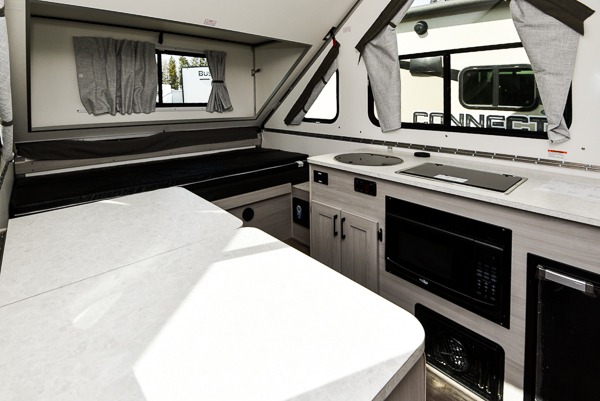 Looking for an indoor place to relax and unwind after exploring outdoors? This Expedition is easy to tow and comfortable to stay in where ever you decide to setup camp. You will have a sofa bed to sit and relax on as well as sleep at night, and there are shelves to place your things like a cellphone and book. The front convertible dinette doubles as a 40" x 80" bed for one or two more, plus there is storage under the seats. You will also appreciate having a two burner stove and a microwave to whip up a hot meal and a sink to wash the dishes and brush your teeth. And the cassette toilet is a nice convenience especially at night.