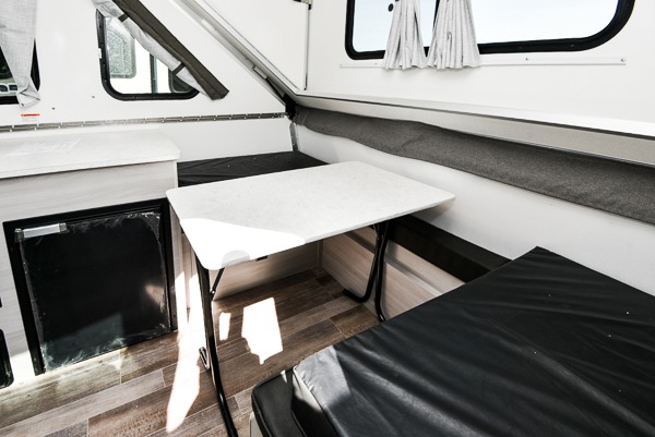 With any Expedition A-frame campers by Aliner, the construction includes a tubular steel frame that is E-coated with a powder coating on the front tongue and bumper, an Azdel lightweight, thermoplastic composite interior wall and ceiling panels, plus Performax 500 premium marine grade flooring for durability. Some extra features include high wind lift assist, additional corner windows with panoramic views, and a command A/C heat pump. Inside, there are high density foam, hypoallergenic cushions, a refrigerator with a freezer, a swivel cassette toilet, and a microwave. You will also appreciate three interior electrical outlets to keep the electronics charged and two skylights with night shades. There are available options to enhance your Expedition such as adding more interior head room with a front or rear hard dormer and/or a rear soft or hard dormer, plus you have the choice to add an outside grill.