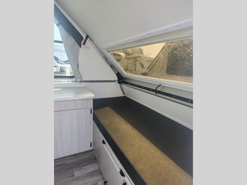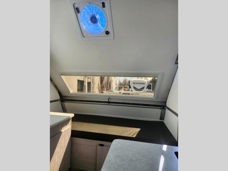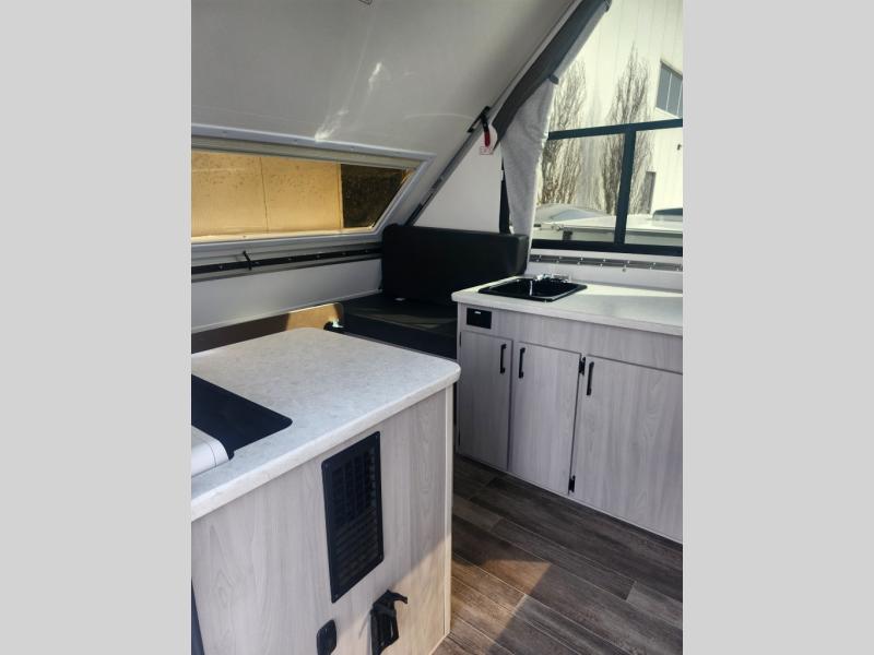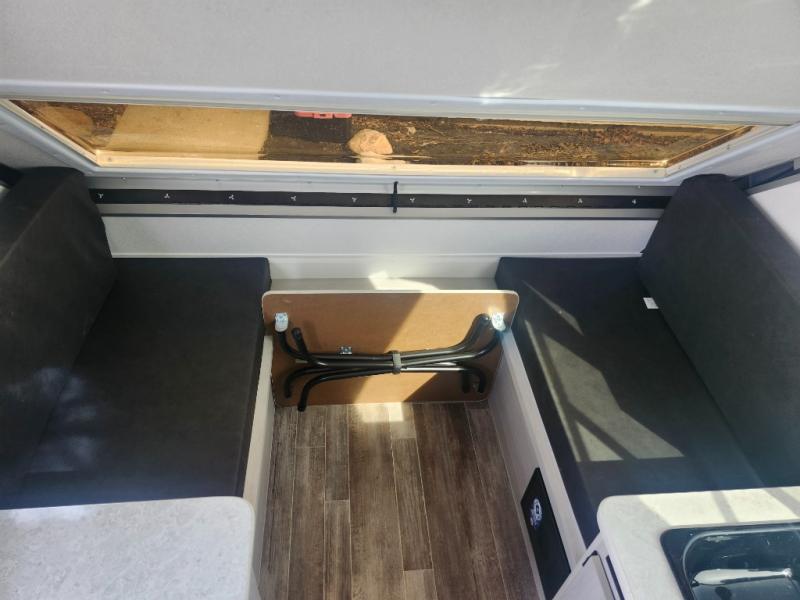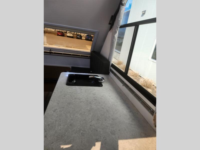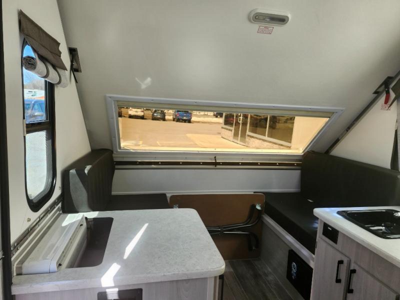 When all you need is the basics to camp because you prefer to be outdoors hiking and exploring, this Scout Lite will be perfect for you! There is sleeping space on either the front 30" x 76" bunk or the rear dinette which converts into a 40" x 76" bed. There is plenty of storage throughout between the storage under the dinette seats, a storage area across from the sink, and storage next to the sink. And you can keep everything charged with the two electrical outlets inside and the one exterior electrical outlet!