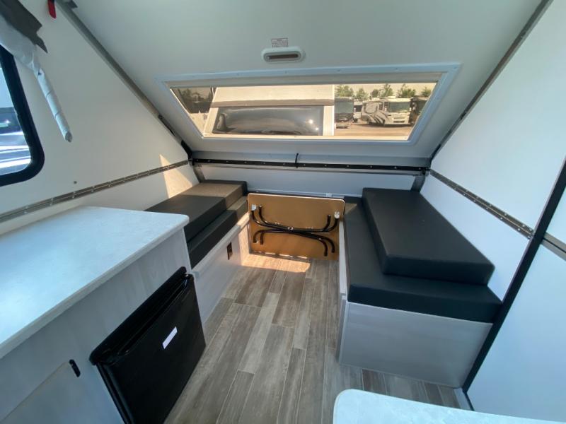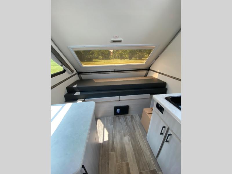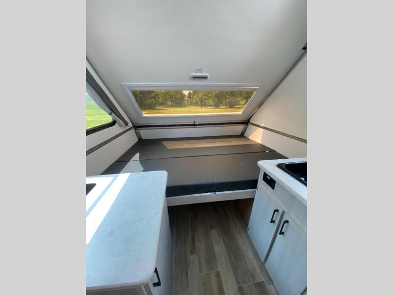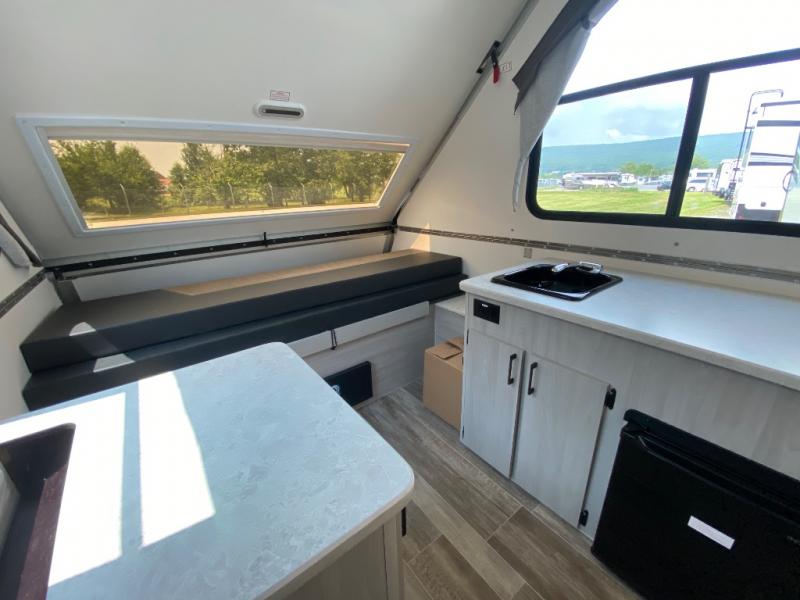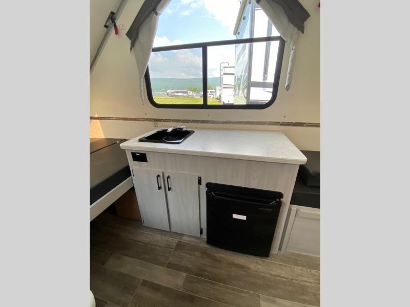 Get ready to sleep above ground as you upgrade from tent camping to this A-frame camper! It is easy to tow, set up and store when the fun is over. Inside you will find ample storage for your gear, a dinette to dine at when you aren't outside, a sofa bed to relax on before bedtime, and both furnishings covert to sleeping space. The dinette converts to a 46" x 76" bed, and there is storage under the seats. You will also have shelves to set your phone and such on. There are more features such as three electrical outlets inside, one outlet outside, high density foam, hypoallergenic cushions and mattress, a fantastic vent-fan, and options to choose from such as a front soft dormer, a rear soft dormer, and/or an Extreme Off-Road package, plus more!