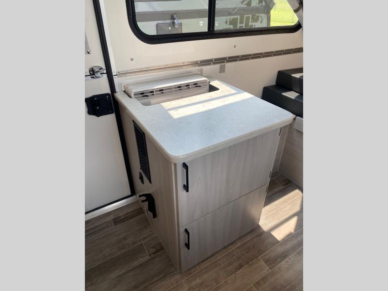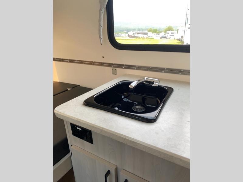 With the Scout A-frame camper by Aliner, there is an E-coated frame with powder coating on the front tongue and bumper, a diamond plate stone guard to protect against road debris, aluminum wheels, and a battery tray. There are vacuum bonded fiberglass panels, an Azdel lightweight, Thermoplastic composite interior wall and ceiling panels, and 10" electric brakes. You will also find a sink inside to wash your hands and dishes, two skylights with night shades and a door window for natural lighting, plus more!