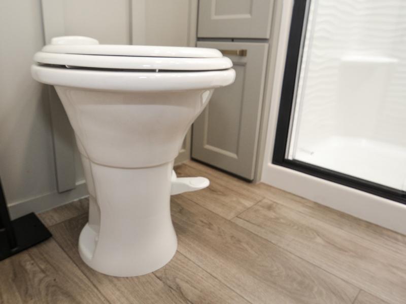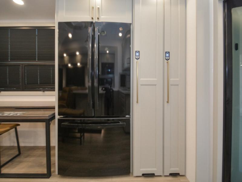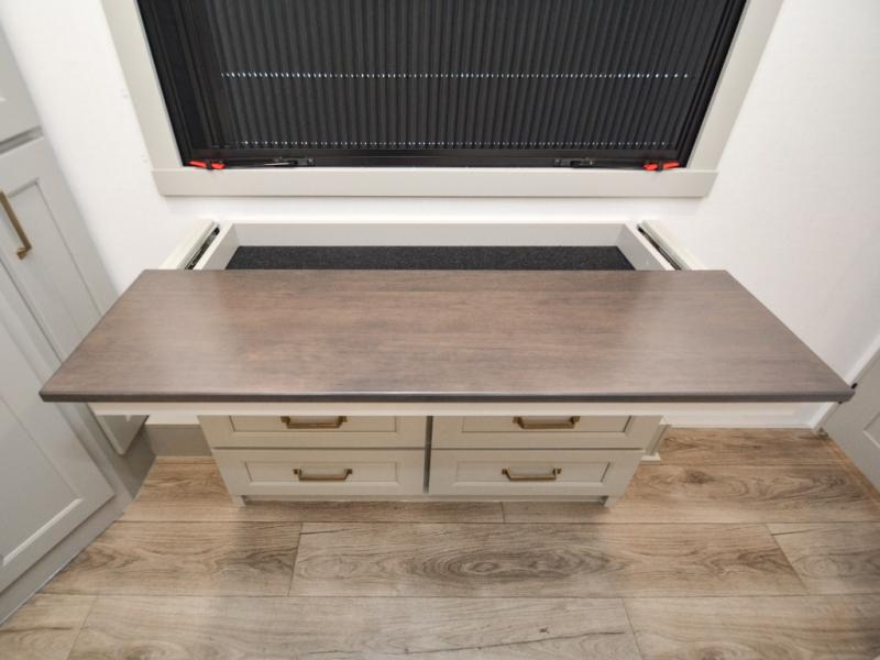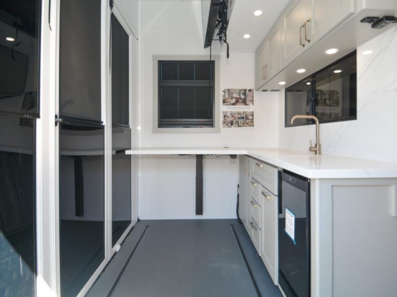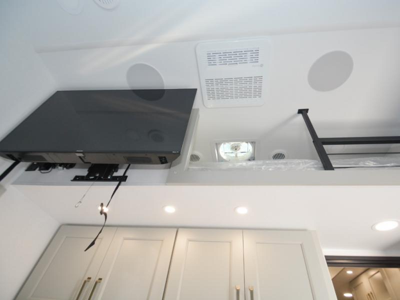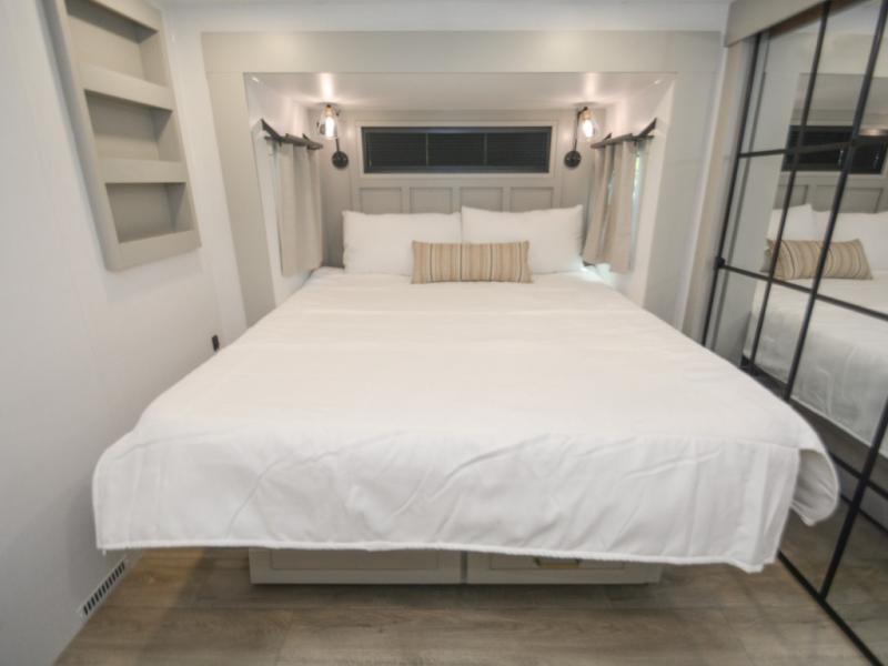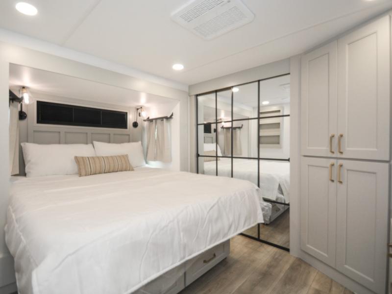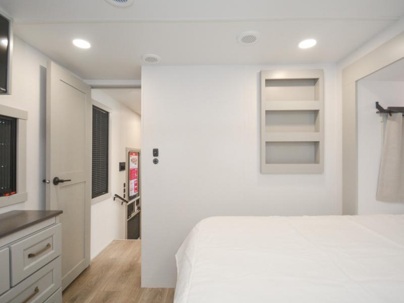 You can't imagine how much this toy hauler has to offer! The garage/outdoor kitchen/office space will allow you to utilize the garage how you need it, plus there is an adjustable tie-down system, as well as a loft for storage and a twin bed to sleep more campers! The garage patio with a 1,500 lb. capacity is another feature you are sure to love, especially with its own awning to keep you protected from the elements. Head to the kitchen to prepare meals with a 24" GE oven with a four burner range, a GE microwave with an air fryer, plus a spacious GE Energy Star 19 cu. ft. refrigerator. The island with two stools will let others visit with you while you cook, and there are even dog bowls to easily feed Frodo. You'll find the convertible dining table/L-desk will be accommodating since it can be use to dine at, and to get some work done. You may just find yourselves spending most of your time on the U-sofa in front of the entertainment center with a TV, fireplace and storage. A full bath is up front by the bedroom, and here you'll find a 30" x 43" shower and and pull-out linen storage with a trash bin to keep towels ready to use. After a day outdoors you'll love nothing more than coming back to your own bedroom with a king bed slide out, TV, a walk-in closet, and many more storage spaces. And we haven't even touched on the exterior features, like the 3-way pass-through storage, three power awnings, an air compressor to fill up tires, and the list goes on and on! This is a pre-production preview, all features and layout placement subject to change.