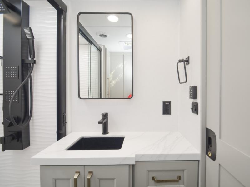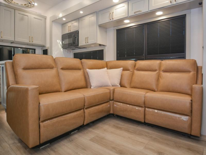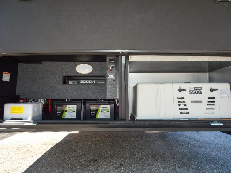 With any Model G toy hauler fifth wheel by Brinkley you will enjoy luxurious amenities, tons of storage space, and innovative features that have been developed and tested in the real world. Durable construction includes an industry leading PDI process, an industry best insulation package, and reinforced and walkable slide roofs. Some of the exterior features you'll find are a 3-way pass-through with a multi-functional flip-up bulkhead wall, under I-beam storage, a MAX-Vision reverse lighting system, and a low-maintenance roof to name a few. A Rockford Fosgate audio system comes standard, along with a OneControl app system that lets you control your fifth wheel's functions right from your mobile device. You will find the solar system with a designated storage area to be ultra convenient, plus there is a FlexPower 5500 with a dual fuel inverter generator for all your power needs. Head inside to find a residential interior with Brinkley's CraftSense wood trim construction, floating entrance steps, integrated window screens and insulated blackout blinds, and residential solid surface countertops plus backsplash. You will also enjoy the neon shower lighting and recessed medicine cabinets in the bath, plus motion activated LED bed lights and dual bedside outlets in the bedroom. Choose a Model G toy hauler fifth wheel to experience all the luxury it has to offer!