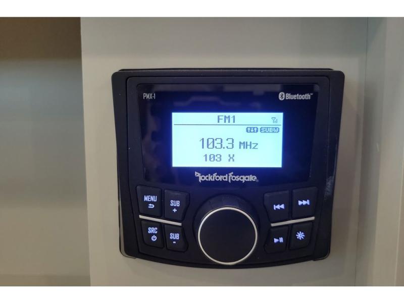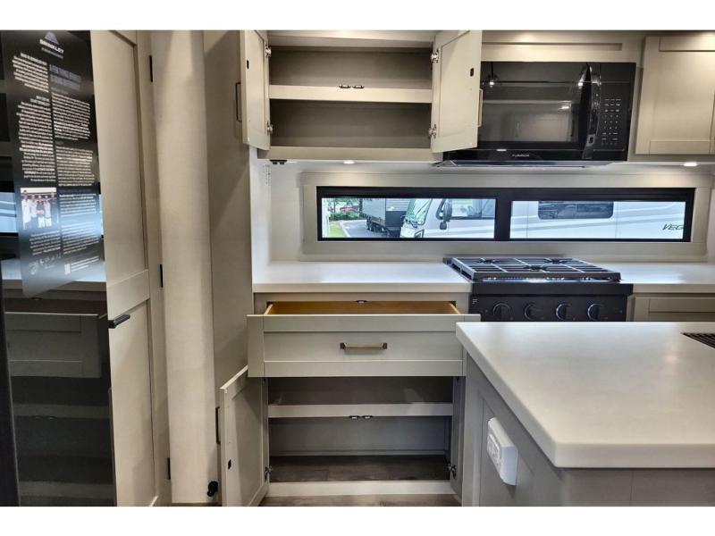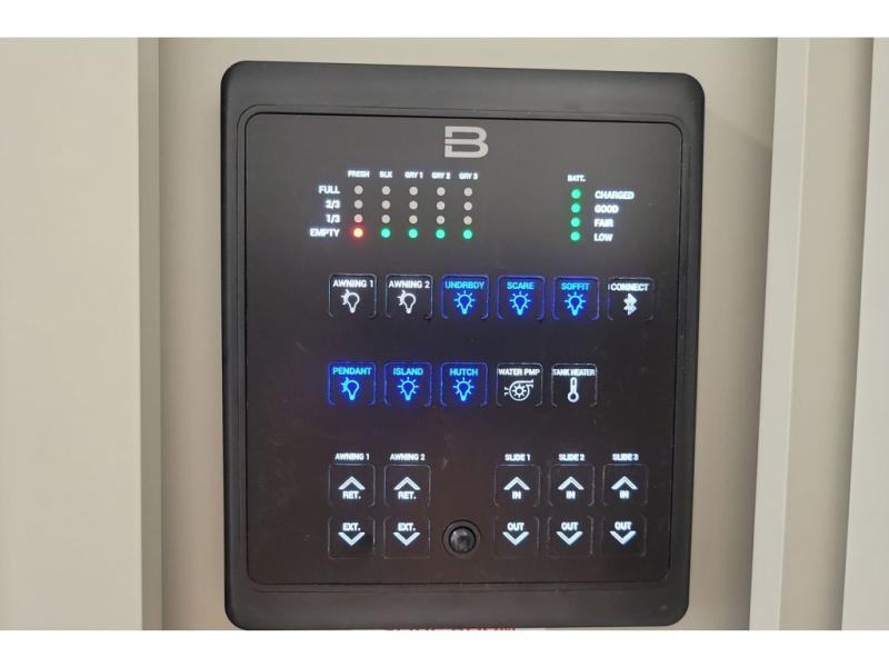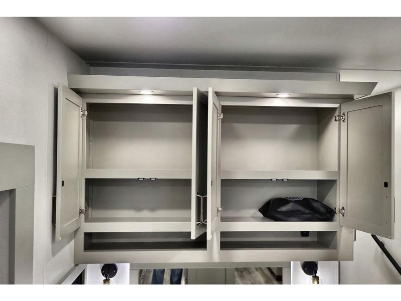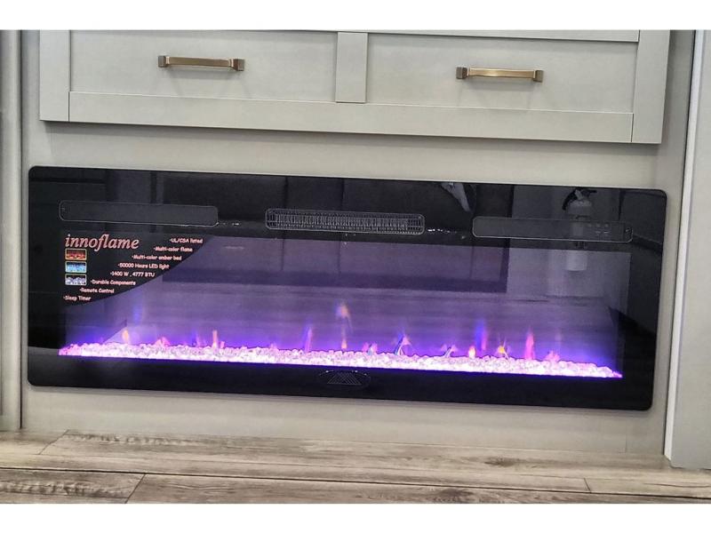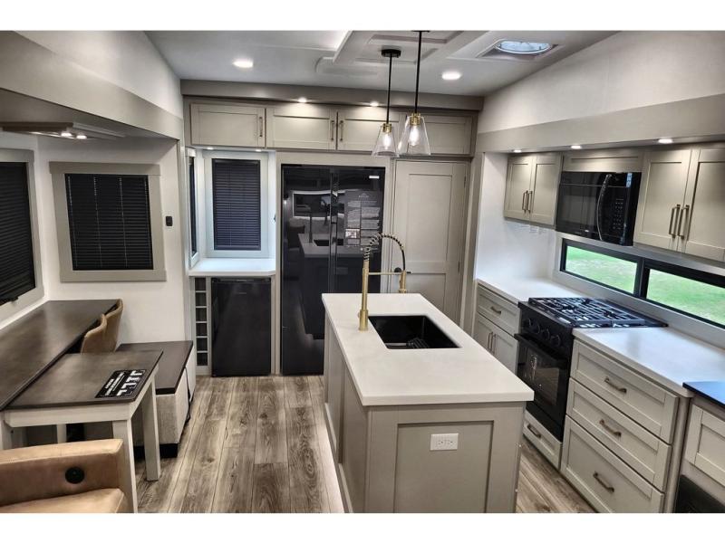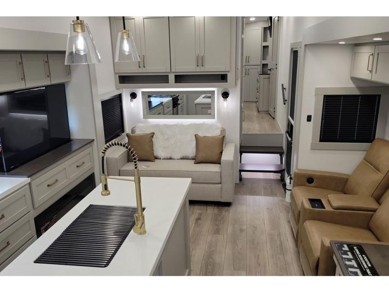 You're going to love every minute spent in this triple slide out fifth wheel! The chef will find everything they need in the kitchen, including a 30" residential microwave, 16 cu. ft. 12V refrigerator, plus a large kitchen island, complete with dual trash bins and dog bowls at the foot. Your crew can get cozy on the tri-fold sofa that extends to a 54" x 70" bed for guests, and there is theater seating across from the televator and fireplace for easy viewing! You will find the front private bedroom ultra accommodating with its king bed slide out, sliding dresser top with hidden storage, your own TV, and a front wardrobe with shelves and a shoe rack. There is even washer and dryer prep if you want the option to make laundry day that much easier!