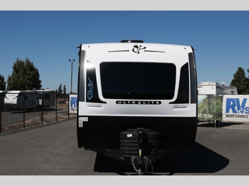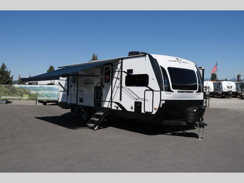 Enjoy each adventure camping in this Apex Ultra-Lite unit featuring dual entry doors. There is sleeping for up to six with the convertible dinette and sofa, plus a queen bed slide in the rear private bedroom that includes super storage beneath. This bedroom also features a large wardrobe near the private bedroom entry door. The front kitchen has everything you need to prepare hearty camp meals easily thanks to the large counter space for prepping. A booth dinette and sofa slide offer seating for everyone and all will easily be able to view the entertainment center with TV and cozy fireplace from either one. A large pantry is conveniently located just inside the main front entry door where you can quickly grab a snack for outside, or load up groceries once you shop for your trip. You will also love the exterior camp kitchen to cook meals outdoors!