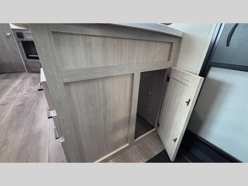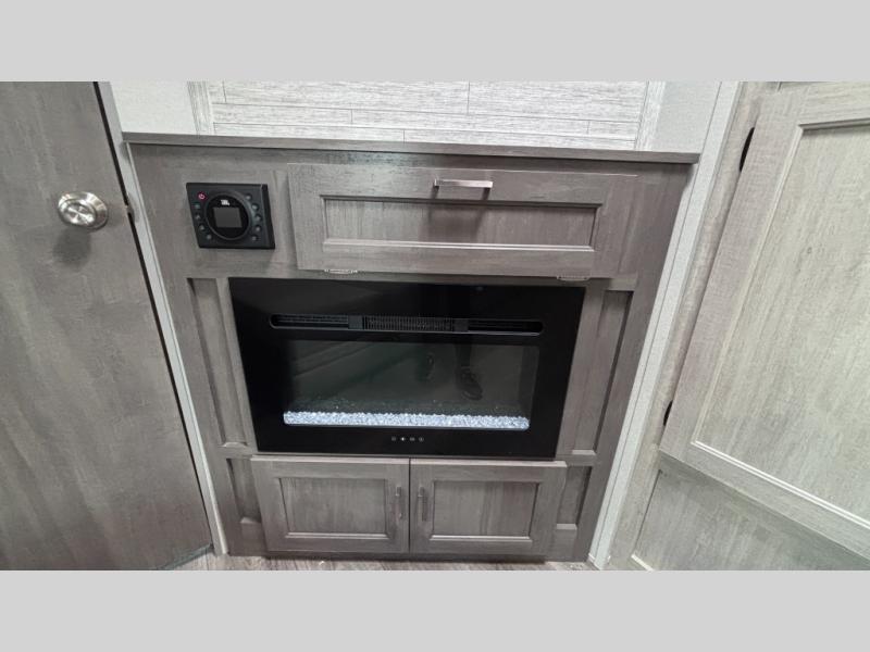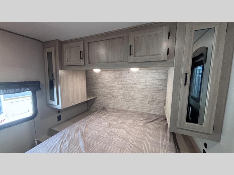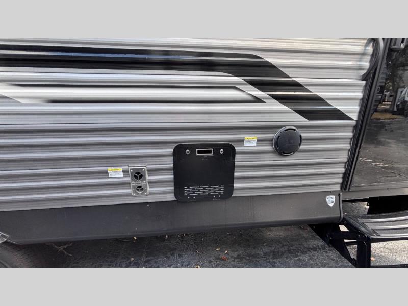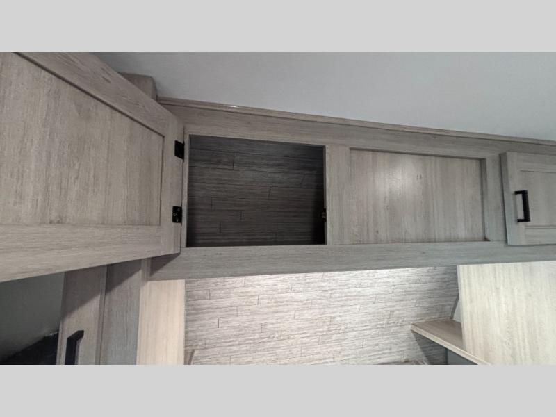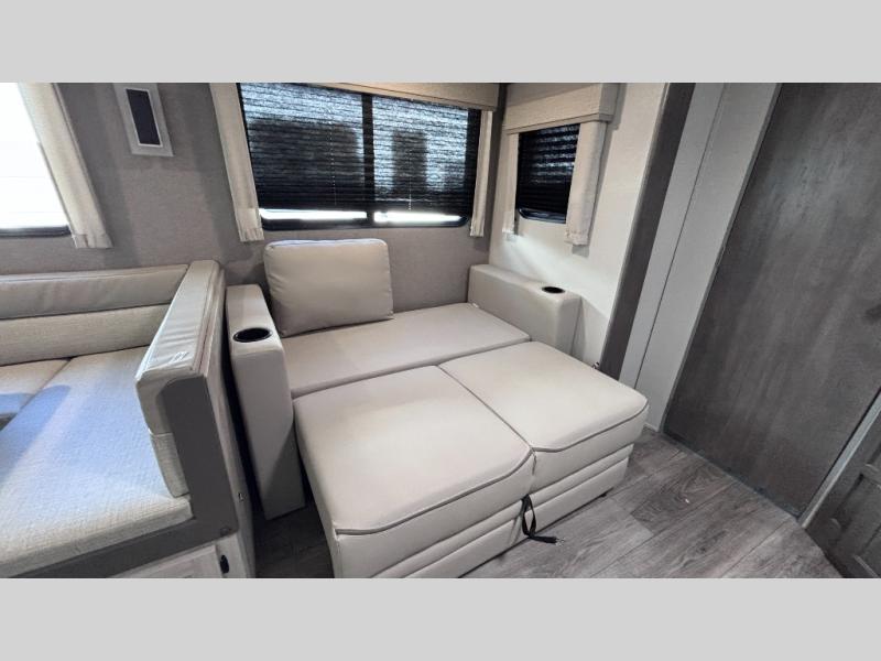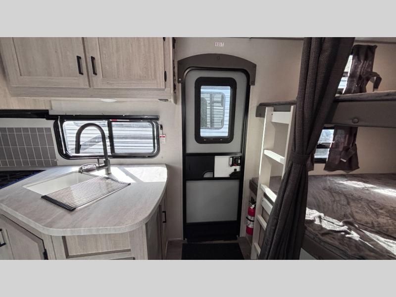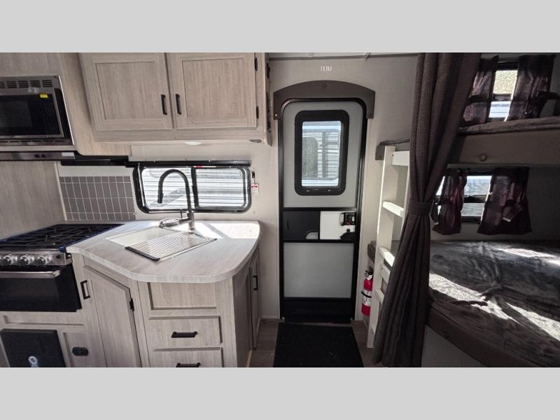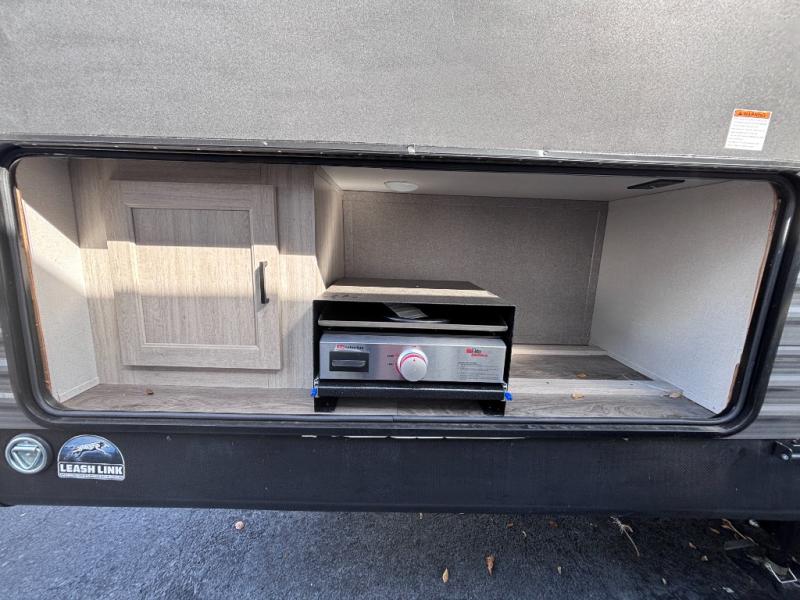When you enjoy camping with your own accommodations and space for the whole crew, hitch this trailer up and head to the campgrounds! After loading everything easily thanks to the dual entry doors and all the interior and exterior storage, you will have no worries that you left anything behind. The electric awning is easy to set up, like the large slide out, and the awning offers multicolor LED lights to choose from by using the remote. When you are outside the cook might like to make a meal using the outside camper kitchen. The interior kitchen offers full amenities including a pantry, and everyone can enjoy the angled entertainment center. There are double-size bunks with a ladder for the kids and a walk-around queen bed for the owner to sleep on, plus furniture in the living area that doubles as additional sleeping space!