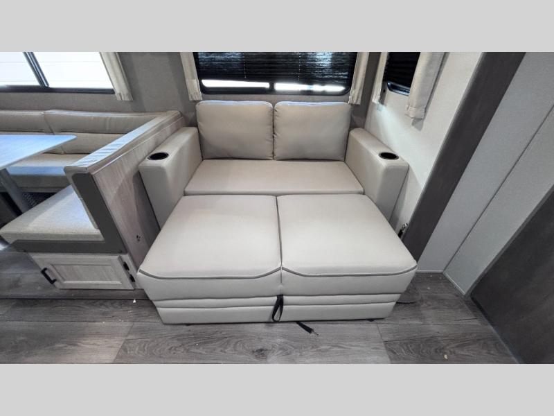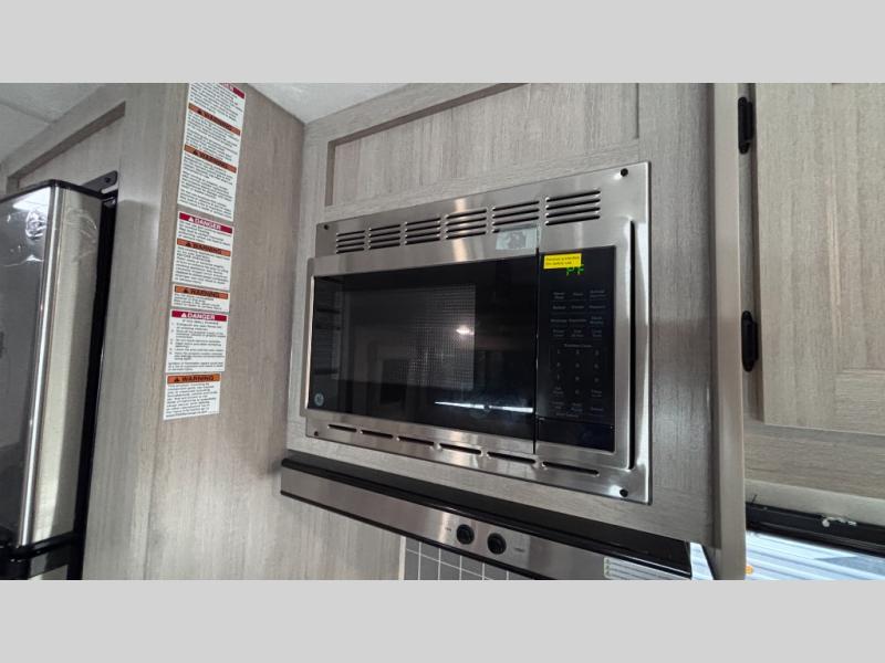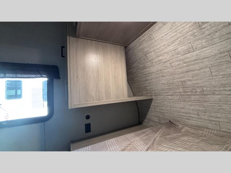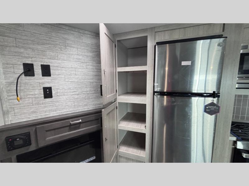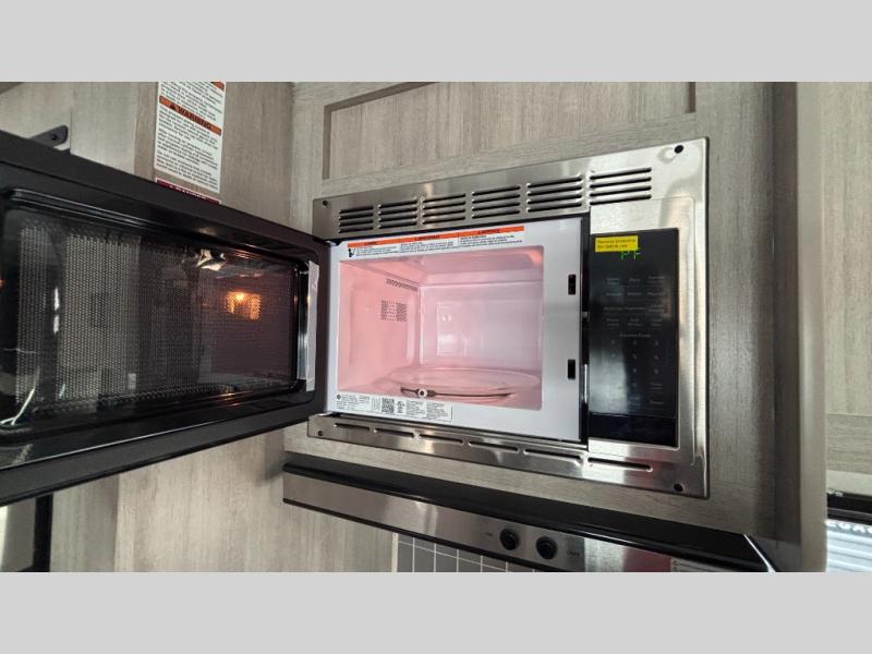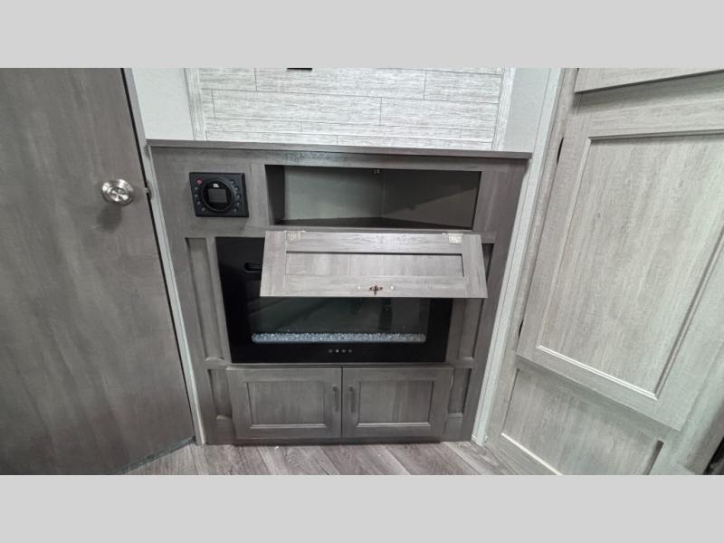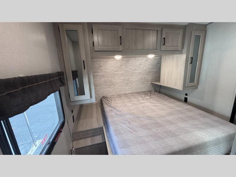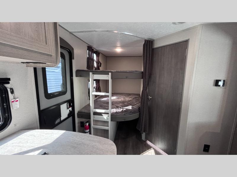 When you enjoy camping with your own accommodations and space for the whole crew, hitch this trailer up and head to the campgrounds! After loading everything easily thanks to the dual entry doors and all the interior and exterior storage, you will have no worries that you left anything behind. The electric awning is easy to set up, like the large slide out, and the awning offers multicolor LED lights to choose from by using the remote. When you are outside the cook might like to make a meal using the outside camper kitchen. The interior kitchen offers full amenities including a pantry, and everyone can enjoy the angled entertainment center. There are double-size bunks with a ladder for the kids and a walk-around queen bed for the owner to sleep on, plus furniture in the living area that doubles as additional sleeping space!