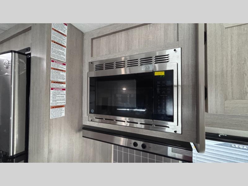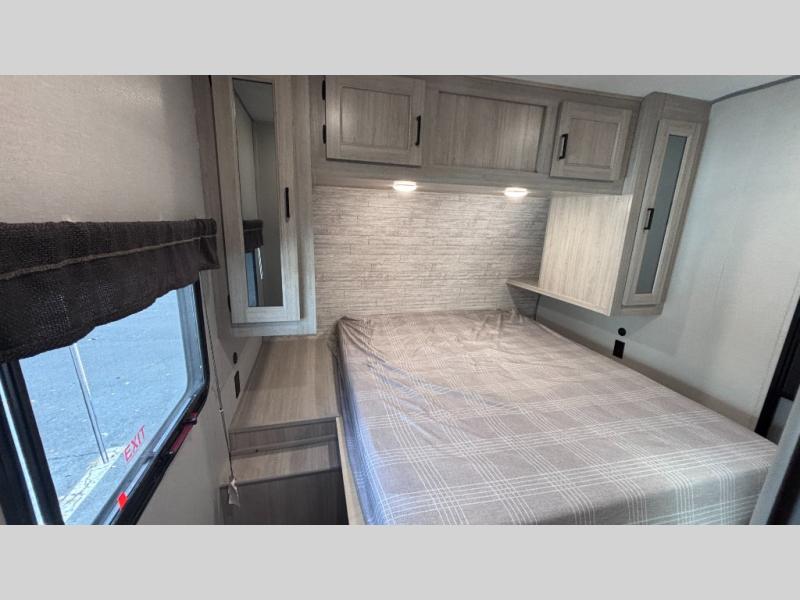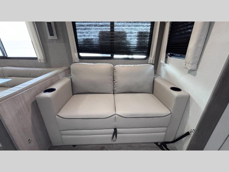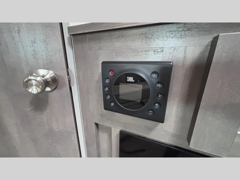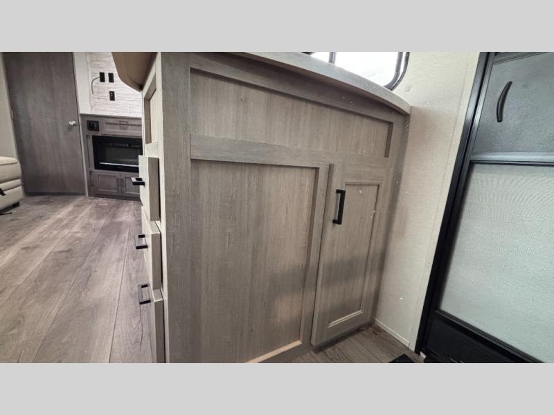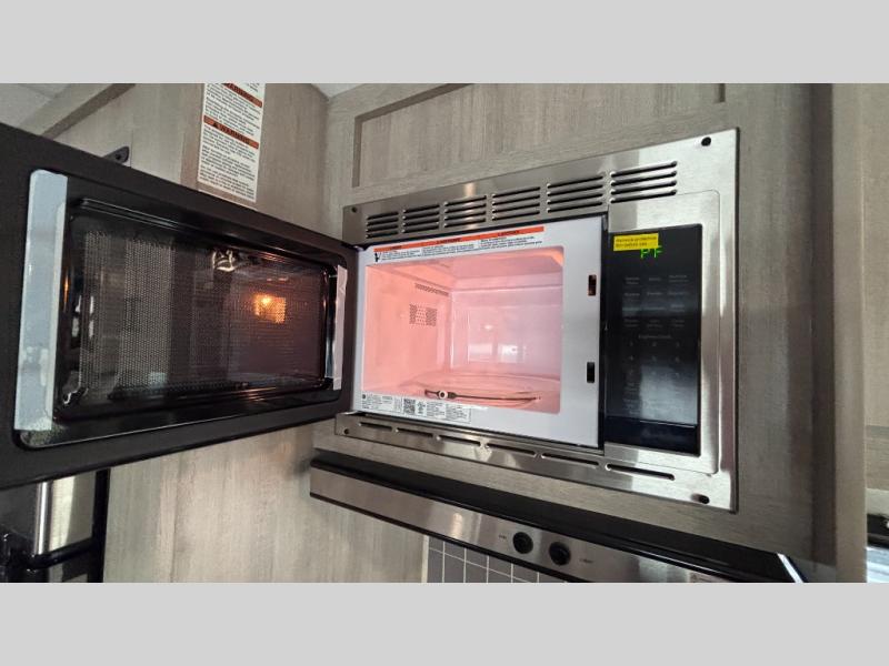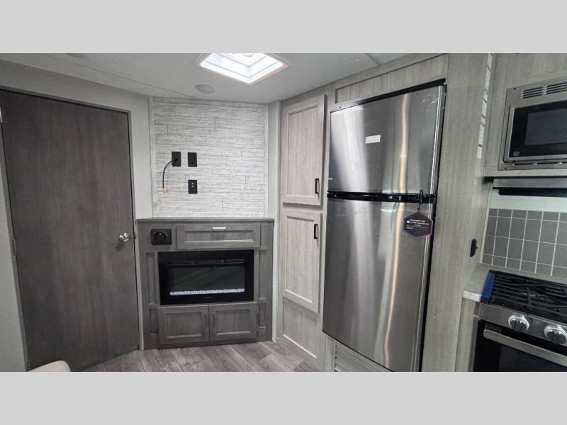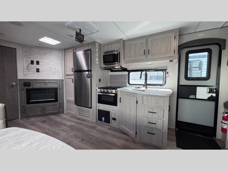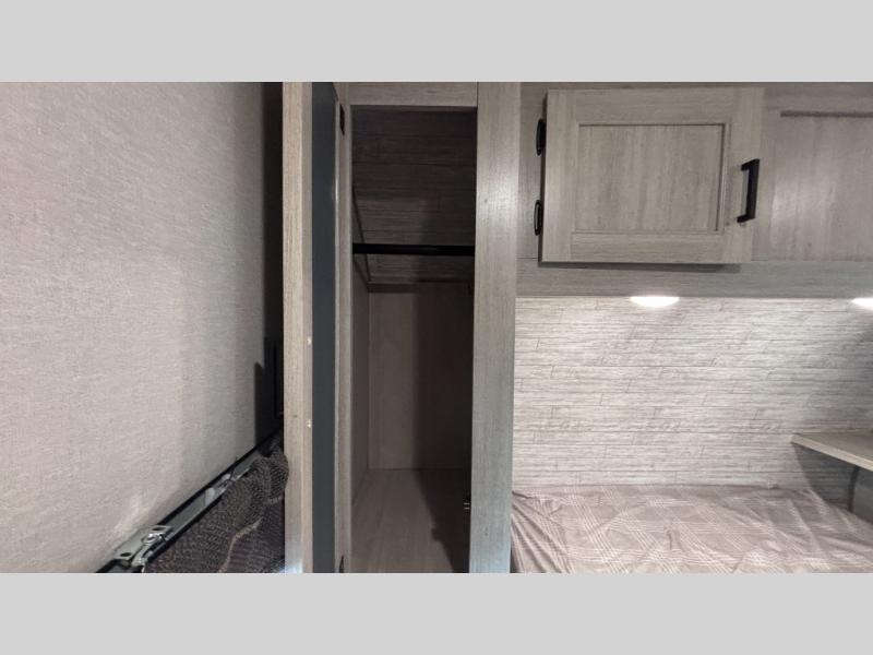 When you enjoy camping with your own accommodations and space for the whole crew, hitch this trailer up and head to the campgrounds! After loading everything easily thanks to the dual entry doors and all the interior and exterior storage, you will have no worries that you left anything behind. The electric awning is easy to set up, like the large slide out, and the awning offers multicolor LED lights to choose from by using the remote. When you are outside the cook might like to make a meal using the outside camper kitchen. The interior kitchen offers full amenities including a pantry, and everyone can enjoy the angled entertainment center. There are double-size bunks with a ladder for the kids and a walk-around queen bed for the owner to sleep on, plus furniture in the living area that doubles as additional sleeping space!