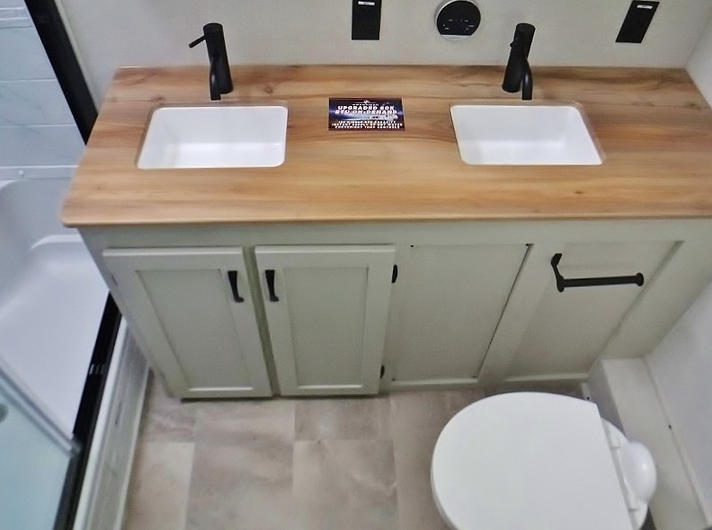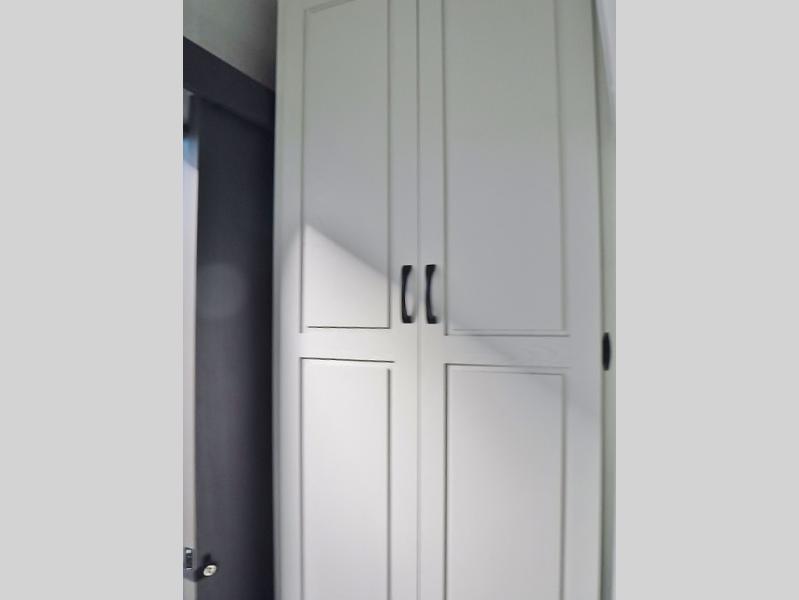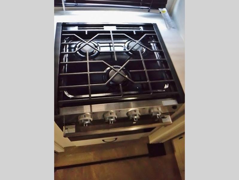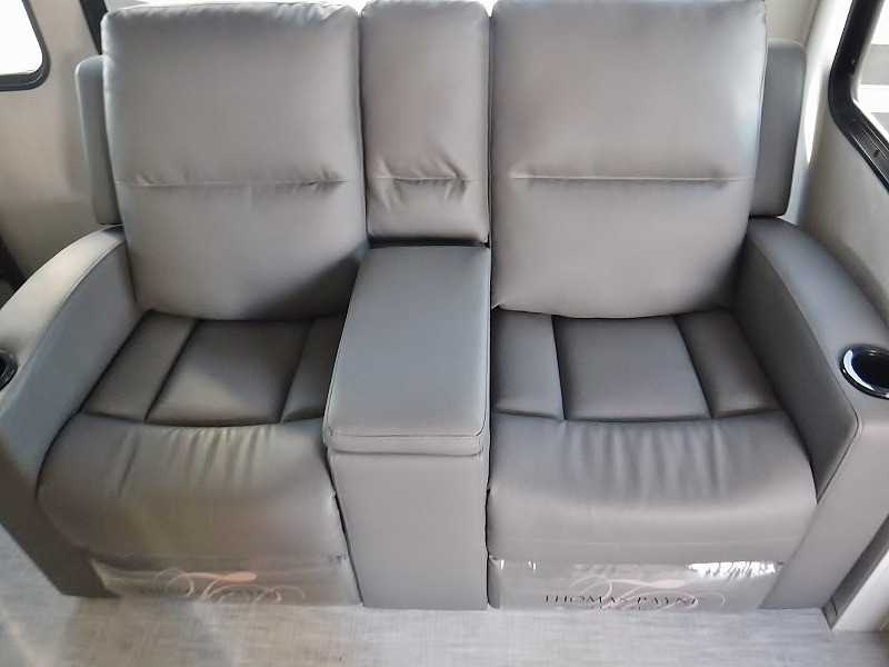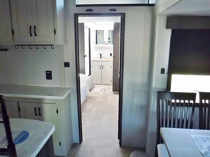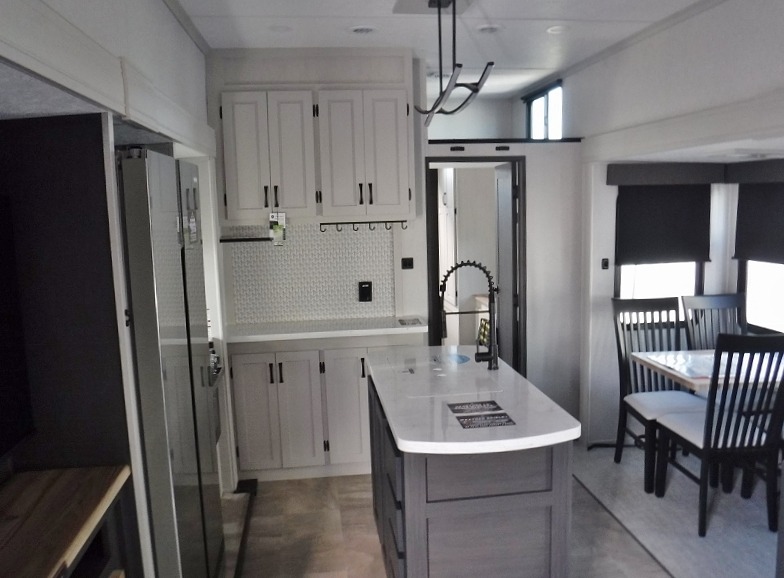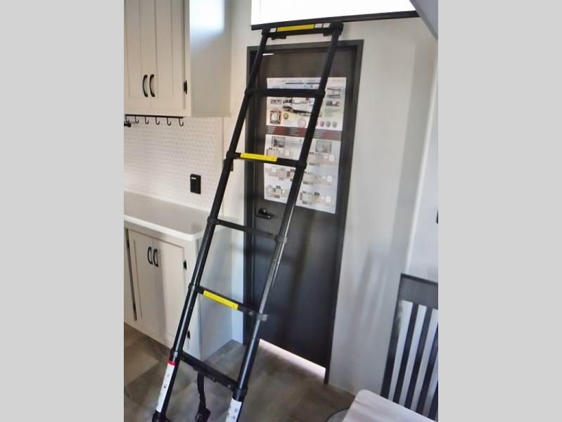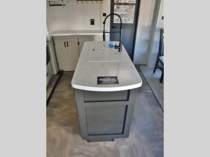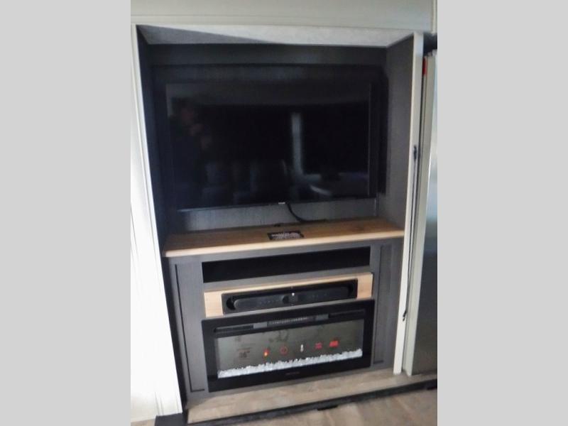 One look at this fifth wheel and you'll be sold! There are an impressive two master suites; one up front with a queen bed and full bath, and one towards the back with a king bed slide and second full bath! There are even dual bath sinks in the rear bath for added convenience! The middle living area includes dual opposing slides, a tri-fold sofa, plus theater seating and a free-spanning table for ample seating, dining, and sleeping space. There is also an entertainment center with a 50" 4K Smart LED TV to wash away those rainy day blues. The chef of your crew will have a GE Profile 21" stainless steel oven with a residential cooktop and a GE Profile stainless residential microwave to cook meals each day, a kitchen island for more counter space, and a 16 cu. ft. side-by-side 12V refrigerator for food storage.