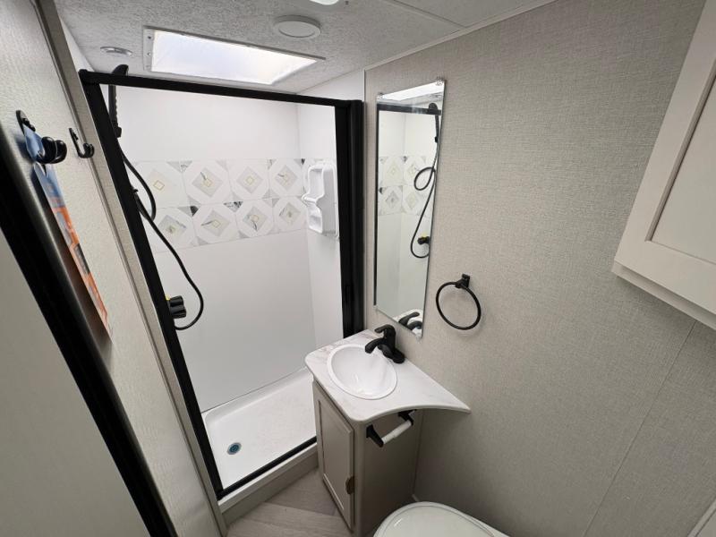Fuel up this motorhome and head out on a great adventure! There is a 39" x 95" bunk over cab and a rear corner queen bed with overhead cabinets. After a long day of traveling, freshen up in the rear corner bathroom with a nice hot shower and then prepare a delicious home cooked meal using the three burner cooktop. The countertop extension will make it easier to prepare your meals too. The 46" x 76" booth dinette is not only great for enjoying meals and playing card games, but also for transforming into an extra sleeping space. This unit also features a rear storage hatch for outdoor gear while you travel.