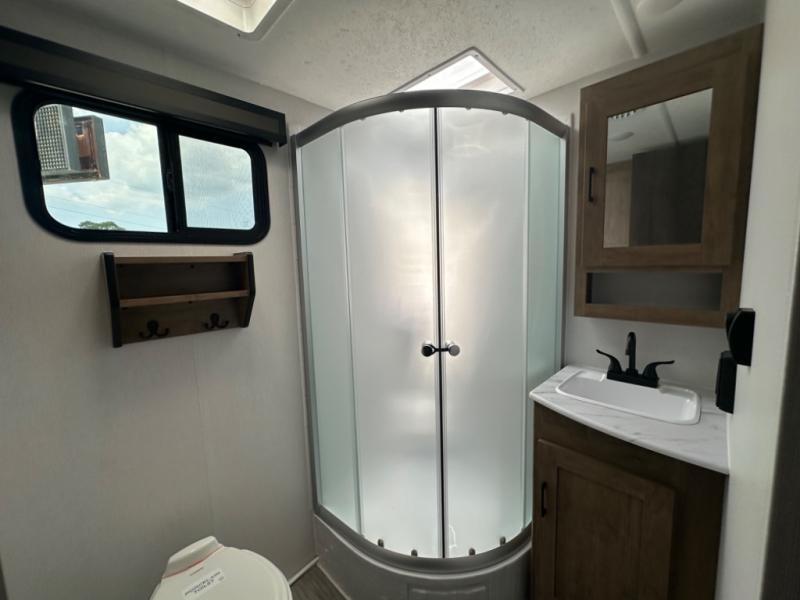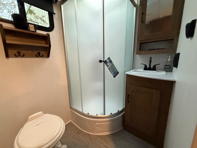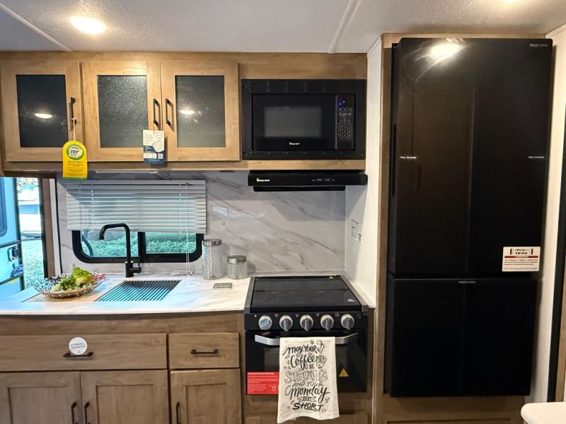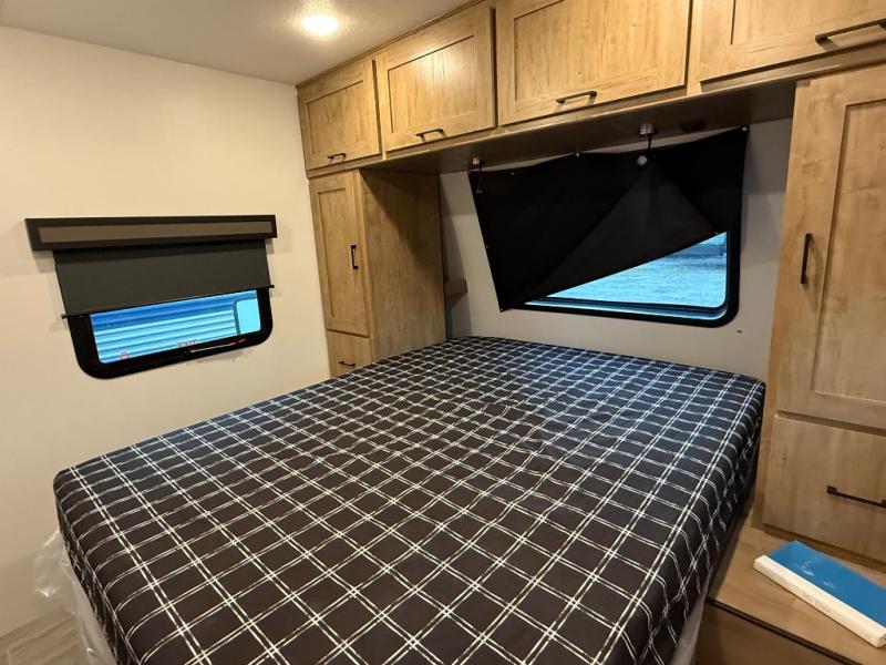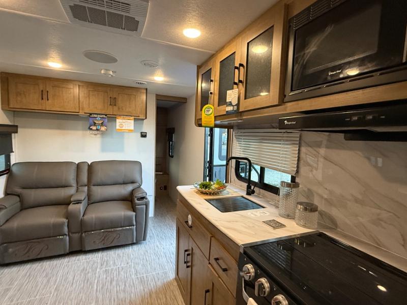 This travel trailer will feel just like home with its private bedroom and spacious full rear bath. You will appreciate the vaulted under-bed storage for extra blankets, shoes, and luggage, plus there are dual wardrobes on either side of the bed for your book and glasses. Get comfortable in the main living area on the sofa or at the booth dinette, or you can choose the optional theater seat or optional hide-a-bed sofa in place of the standard sofa. The chef of your group can prepare meals indoors or outdoors on the full camp kitchen and check out the large 20' power awning with LED lights that will provide protection from the elements.