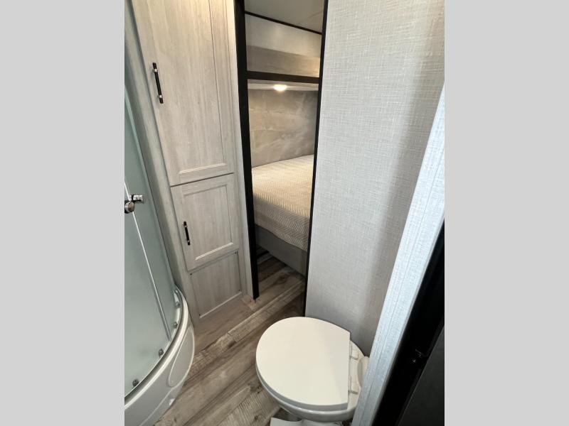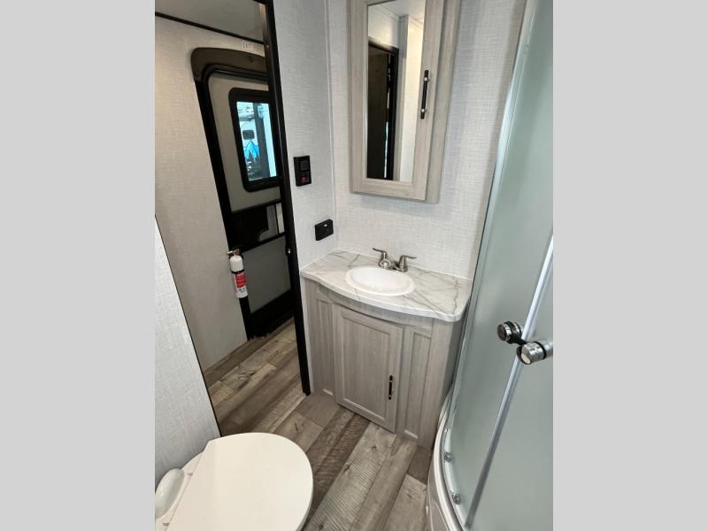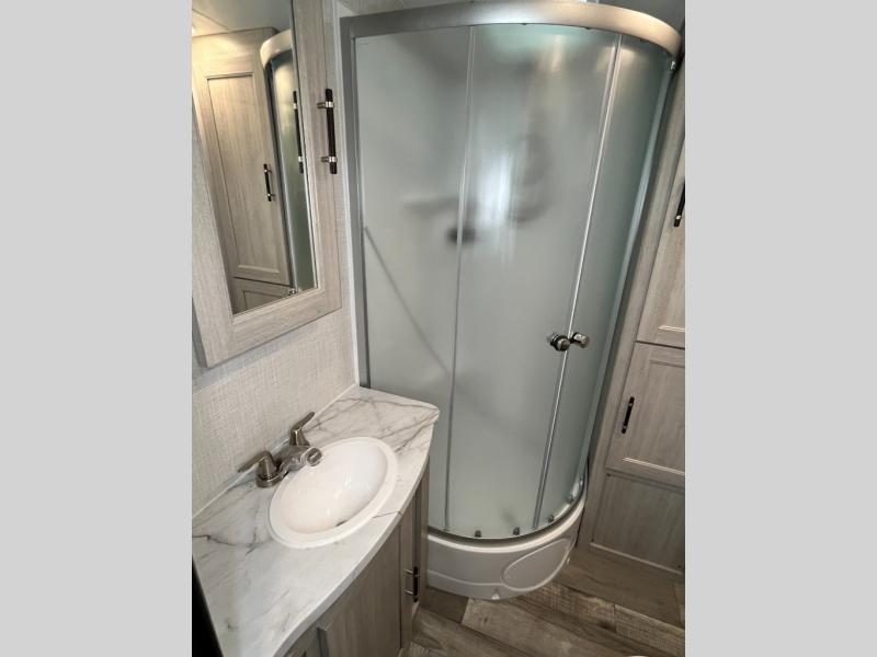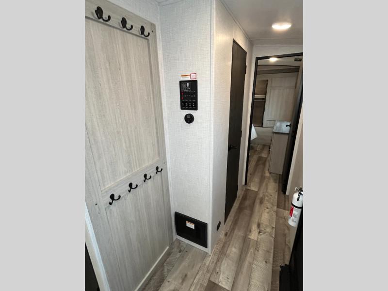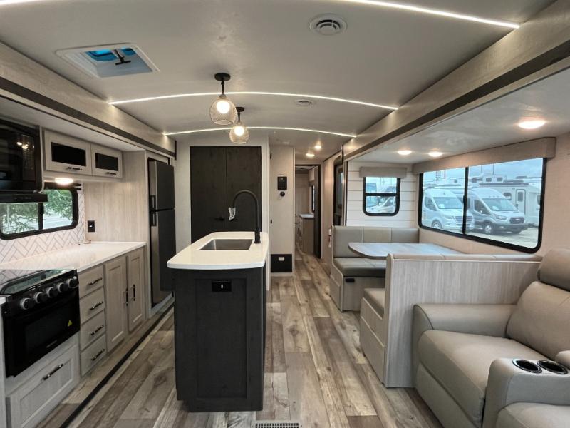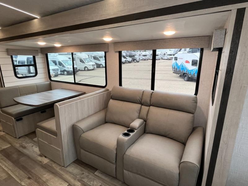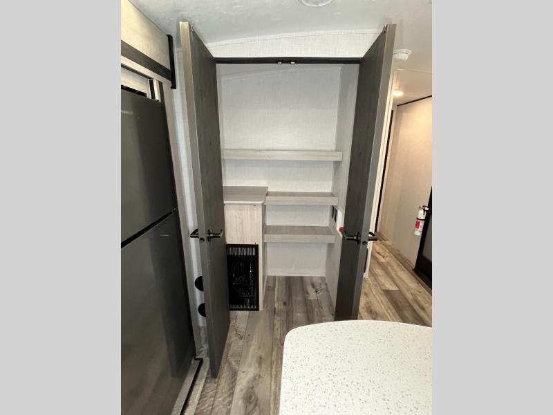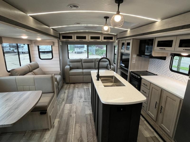 This spacious travel trailer is beaming with luxurious features you are sure to love. The dual opposing slides in the main living area open up the whole space, plus there is a third slide out in the front master suite. The chef of the family will appreciate the kitchen island for additional counter space, and there is a large pantry for all your non-perishables. This space has also been prepped to add an optional washer and dryer if you choose. Your family will find plenty of seating space on the rear 82" tri-fold sofa, the XL booth dinette, and the theater seating. The dual entry bath creates a front master bedroom, and you'll find plenty of storage space here, including a chest of drawers and a large front shelf!