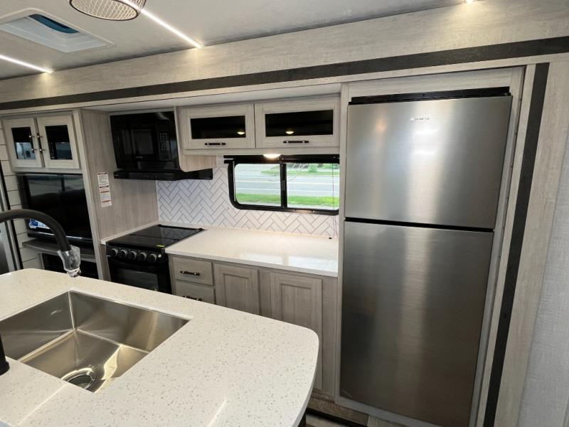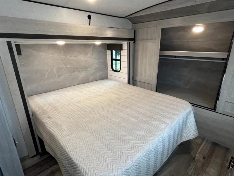 With any Sunset Trailer travel trailer by CrossRoads RV, you will enjoy comfort at every turn! The 5-sided aluminum structure, enclosed underbelly, and HyperDeck flooring provide a durable RV made to last. There is also a power awning with LED lights outdoors, a fiberglass front cap, and a docking station with battery disconnect for easy set-up. Each model includes solid surface kitchen countertops, porcelain toilets, roller shades, and hidden cabinet door hinges to name a few interior comforts!