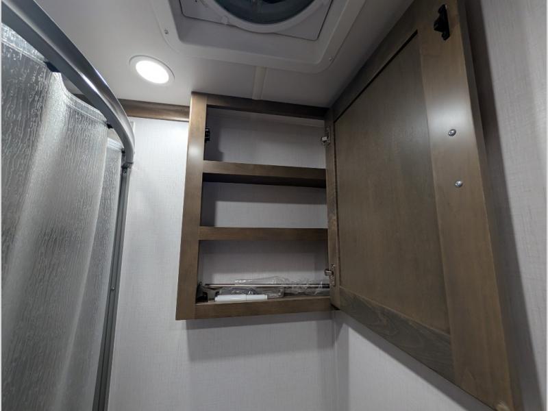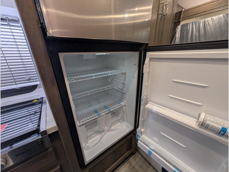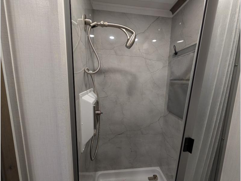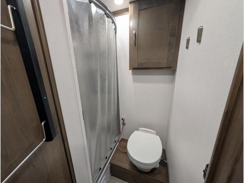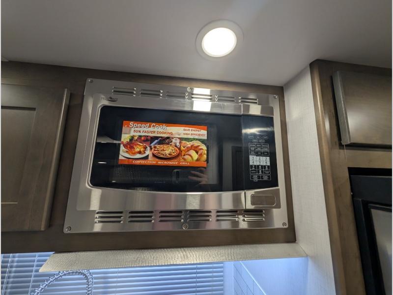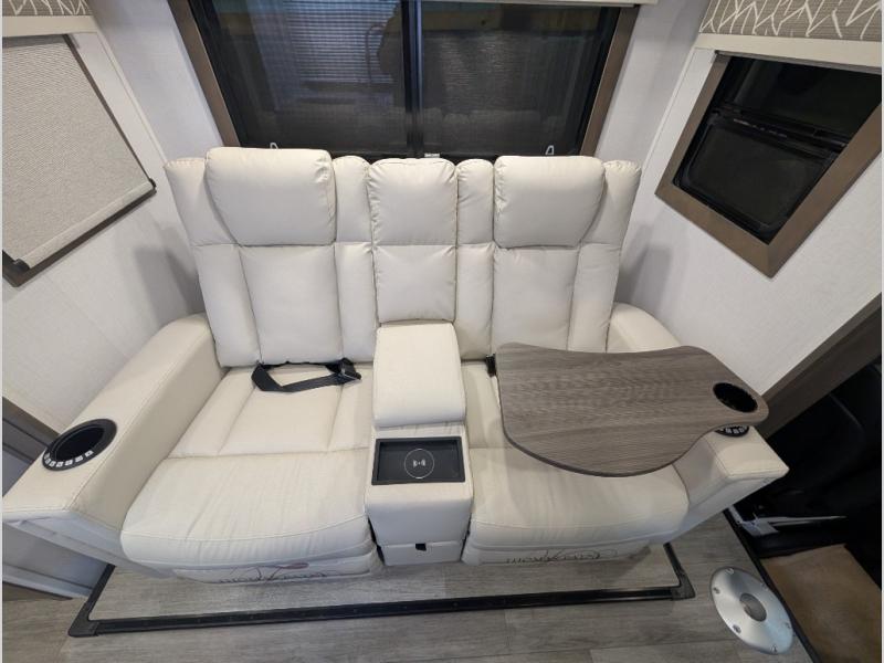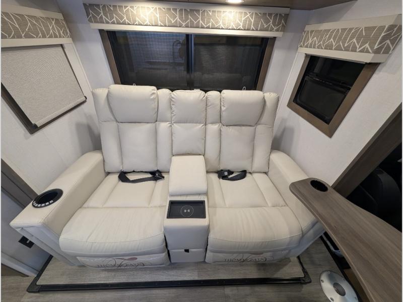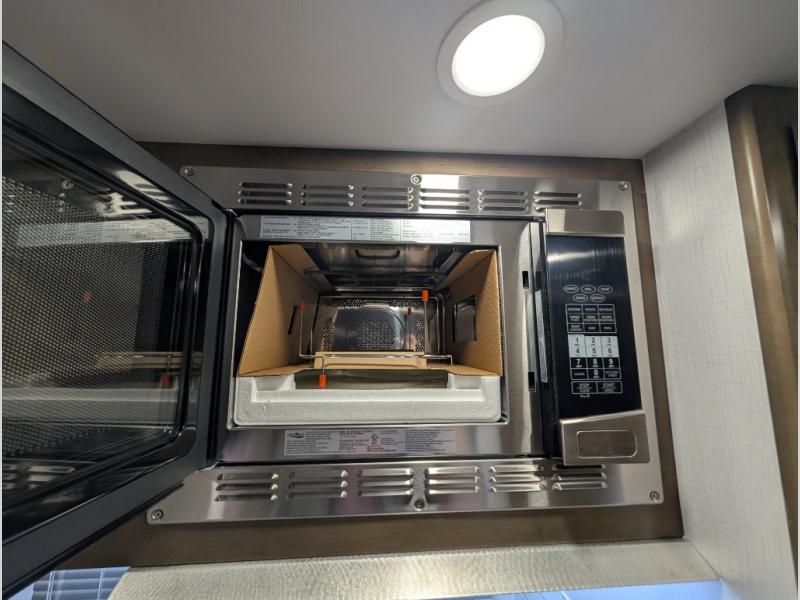 Inside, you’ll find a smart and spacious layout designed for ultimate comfort. The dual opposing slide-outs create a wide-open living space, while the modern kitchen comes fully equipped with a convection microwave, residential-style appliances, solid-surface countertops, and plenty of storage. The rear bedroom features a walk-around queen bed and abundant wardrobe space, perfect for extended trips. Relax in the comfortable theater seating or dinette area, enjoy your favorite shows on the LED TV, and take advantage of the full bathroom with a spacious shower.