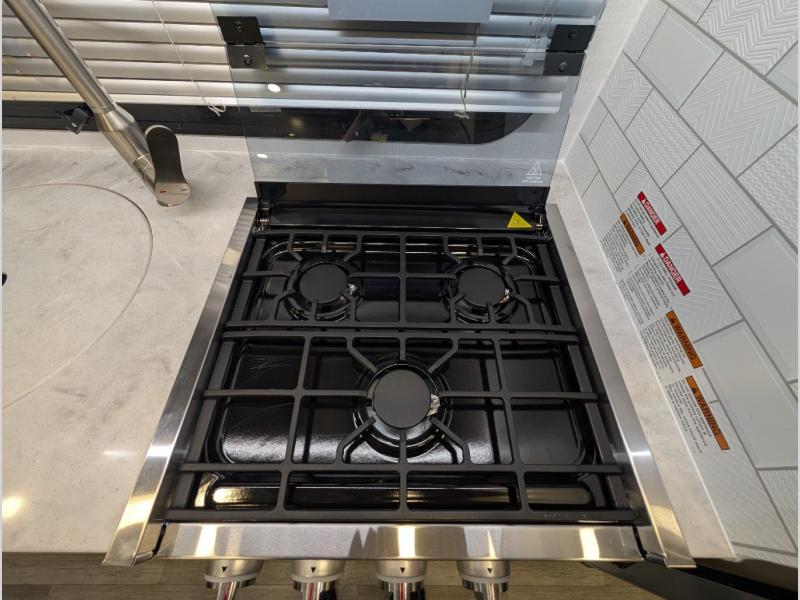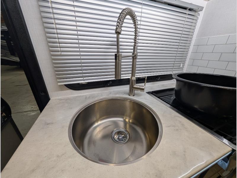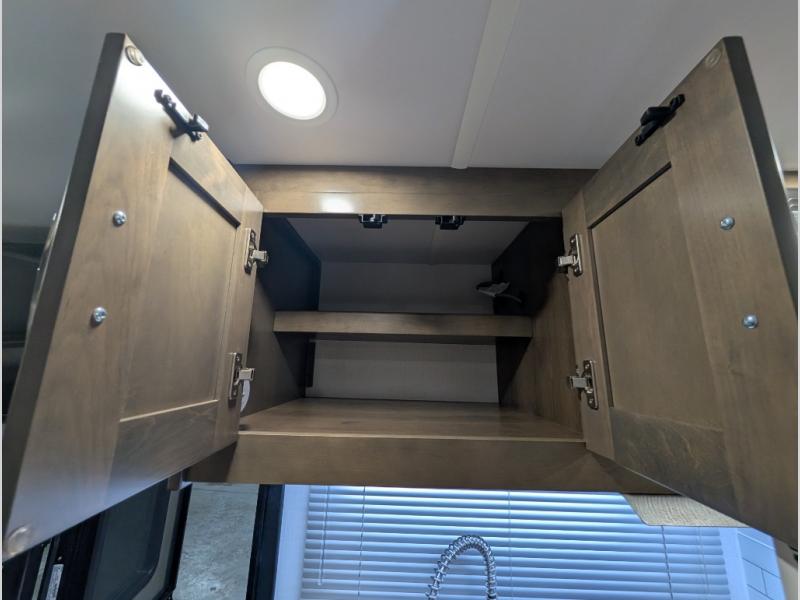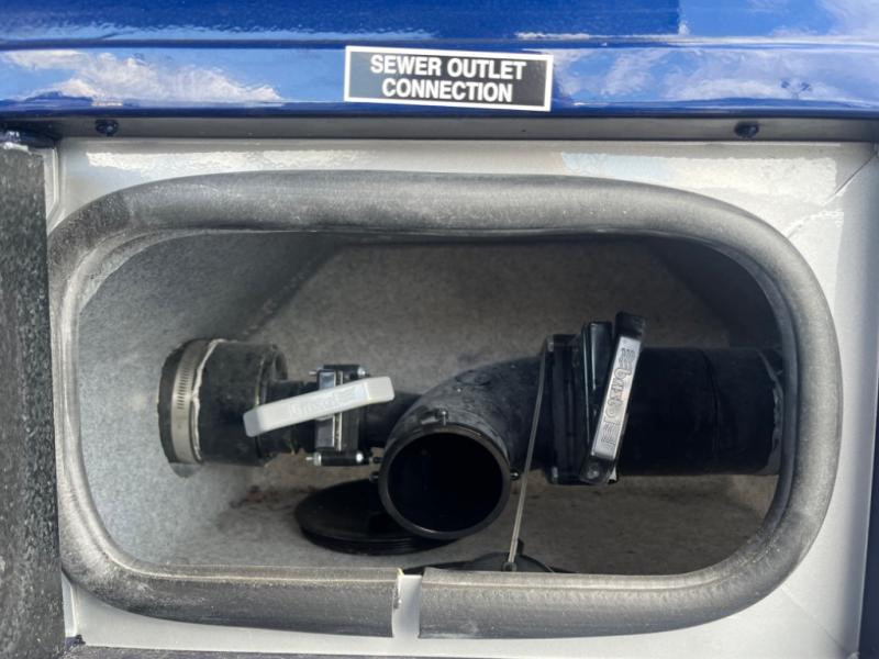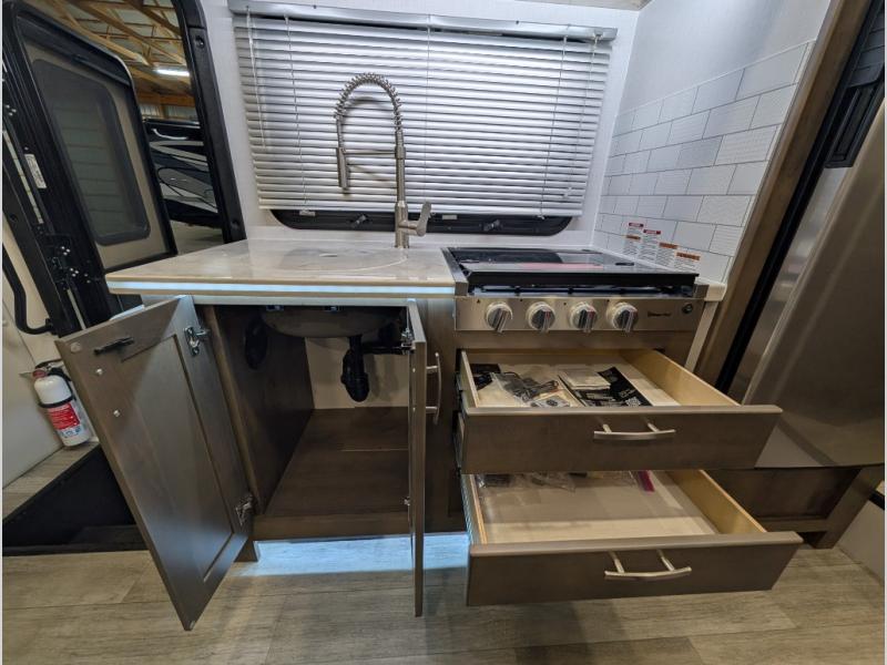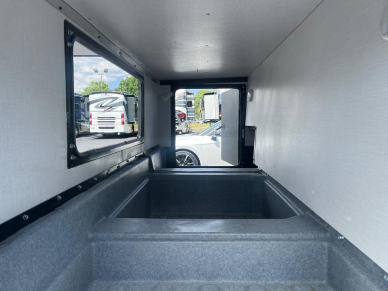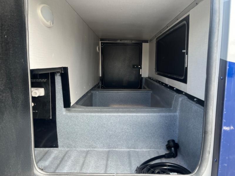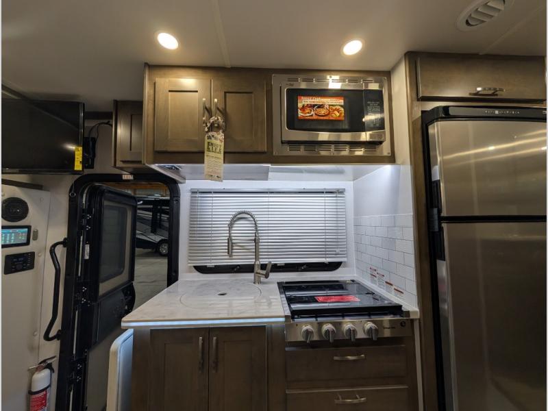 Inside, you’ll find a smart and spacious layout designed for ultimate comfort. The dual opposing slide-outs create a wide-open living space, while the modern kitchen comes fully equipped with a convection microwave, residential-style appliances, solid-surface countertops, and plenty of storage. The rear bedroom features a walk-around queen bed and abundant wardrobe space, perfect for extended trips. Relax in the comfortable theater seating or dinette area, enjoy your favorite shows on the LED TV, and take advantage of the full bathroom with a spacious shower.