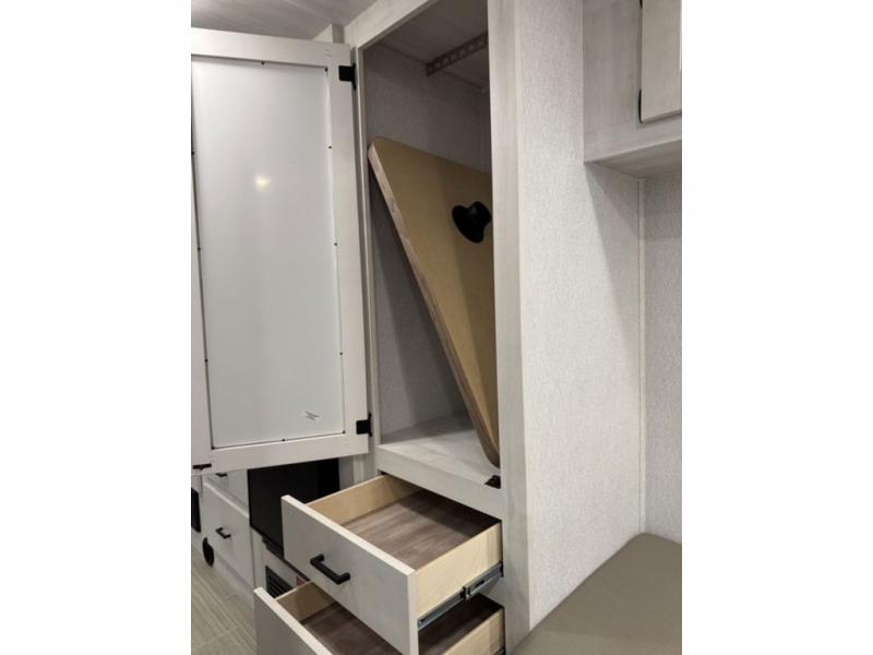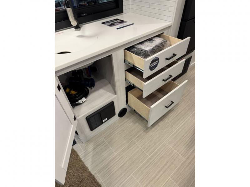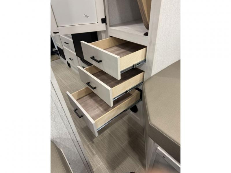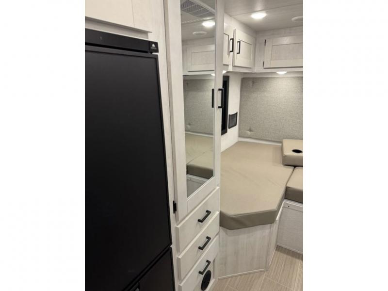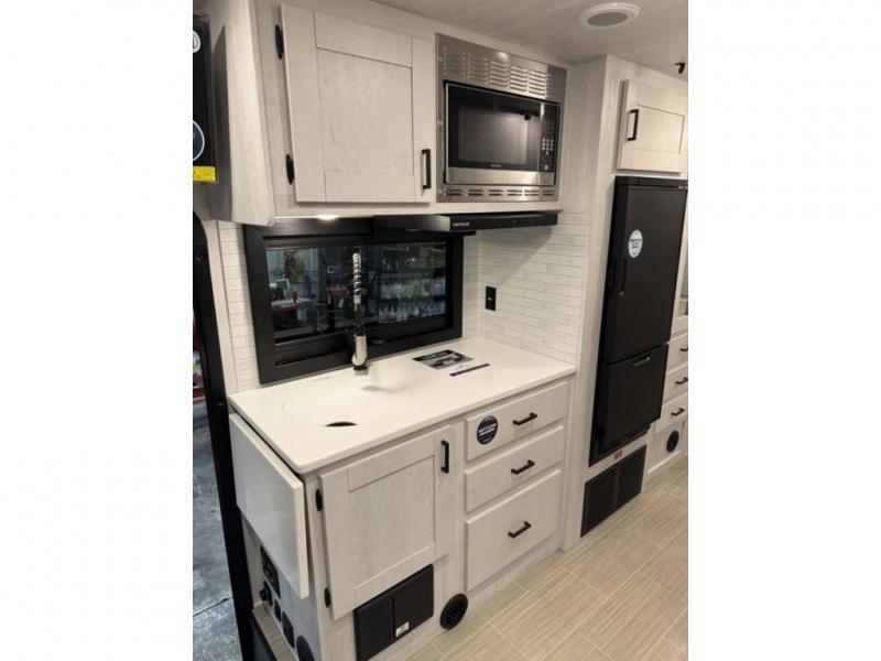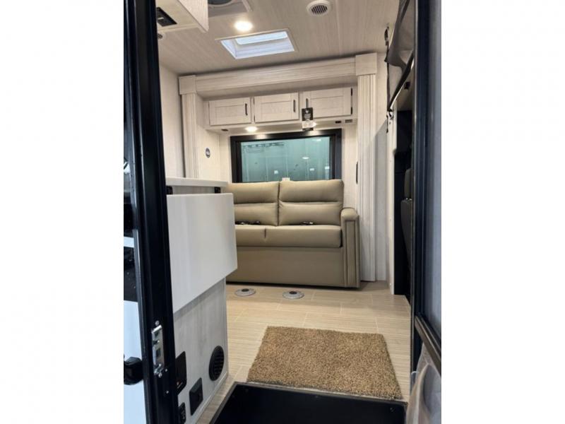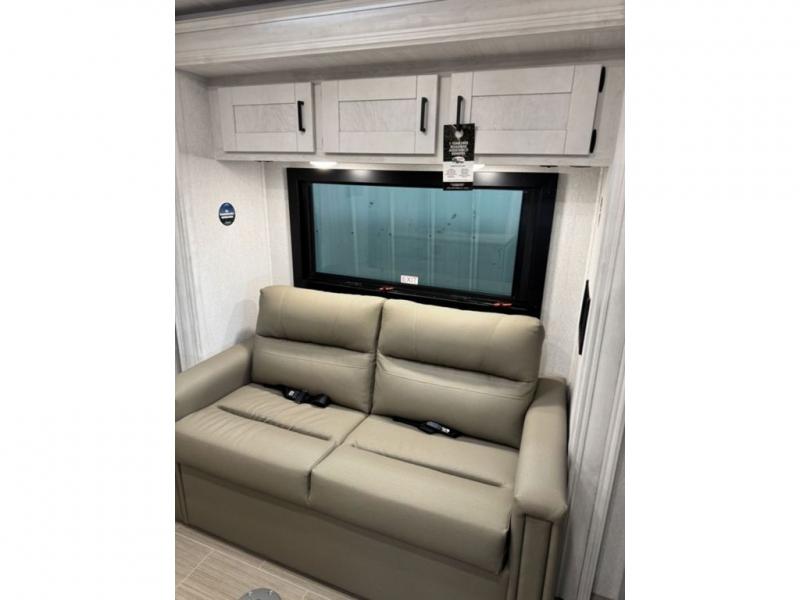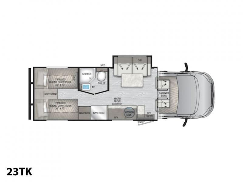 Whether you are traveling to your favorite campground or across the country, you are going to love this motorhome. You will have versatility in this coach to travel with a friend or your sweetheart with two twin beds that can easily convert to a king bed if you like. Each bed is 36" x 73" with a nightstand between and overhead storage along both sides and across the rear of the unit providing plenty of space for your things. There is also a wardrobe off the foot of the twin that is on the curbside. A sofa slide out with a table will provide a place to relax and dine together. The kitchen is opposite the slide on the door side and features a round hidden sink with solid surface cover for added prep space, a 12-volt 6 cu. ft. refrigerator for your perishables, and a microwave oven and induction cooktop for easy meals as you travel. When you want to get cleaned up, there is a bath with an angled shower, toilet, and sink, plus medicine cabinet for your toothbrush and razor.