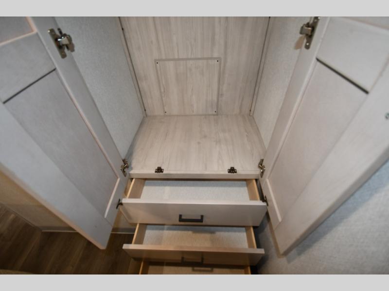 If you've been searching for a fifth wheel for your whole crew, you can stop looking! This model includes a rear private bunkhouse with a sliding door for more space, double-size bunks, plus a closet for your guests' things. You can cook indoors in the fully-equipped kitchen or head outdoors to use the outside kitchen. There is also a 20' power awning outside, a universal docking station, plus a 2" towing hitch if you need to haul more gear. If the weather isn't cooperating, you can stay indoors to relax on the sofa or play a game around the U-shaped dinette, and there is a 50" LED TV to make it a movie night! Since you'll be camping with more people, you will appreciate having your own space in the front private bedroom, complete with a king bed, overhead cabinets, and a wardrobe!