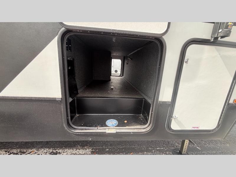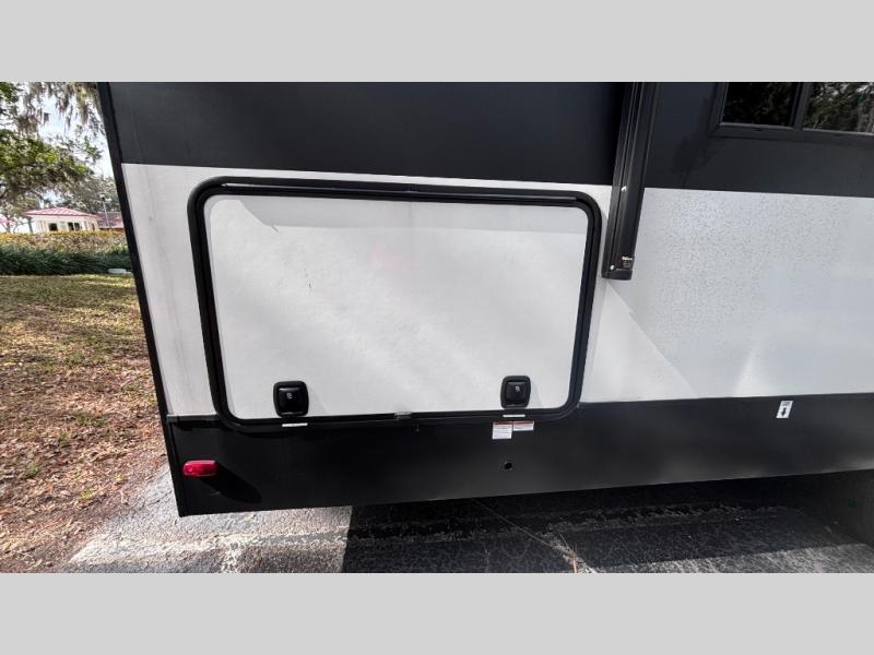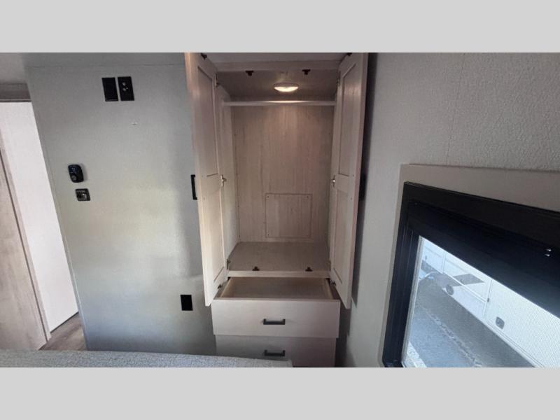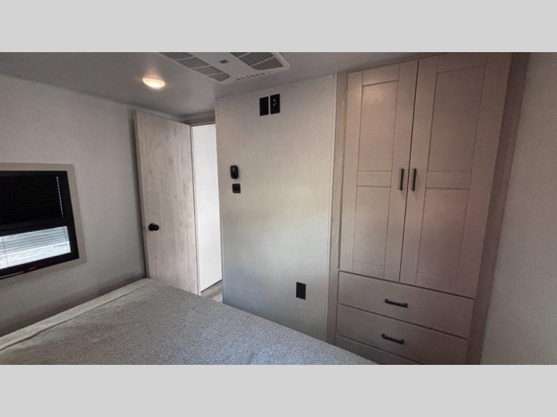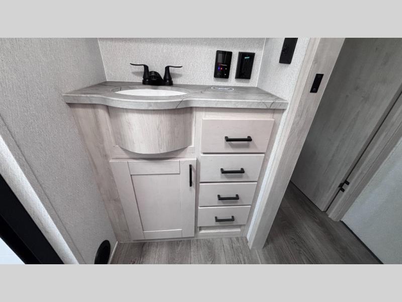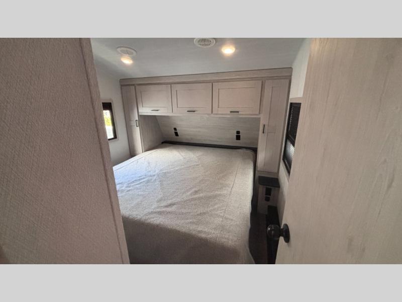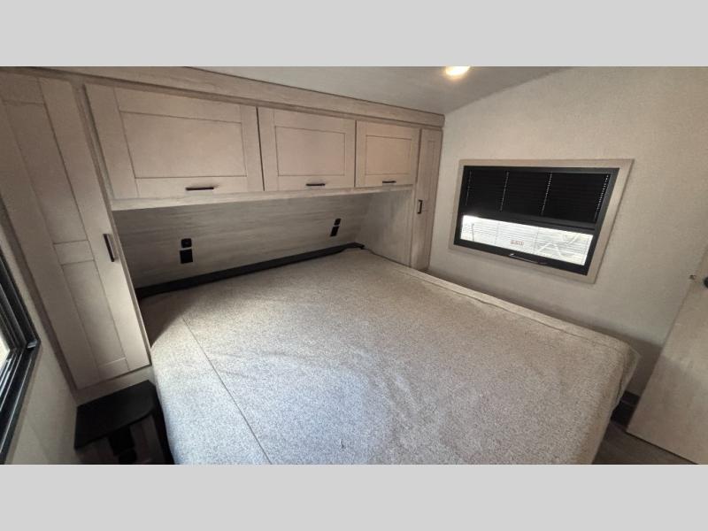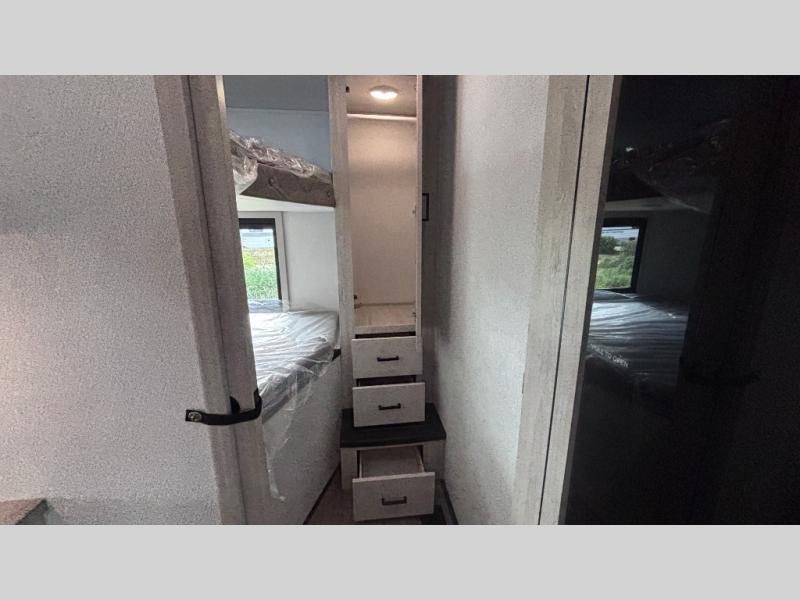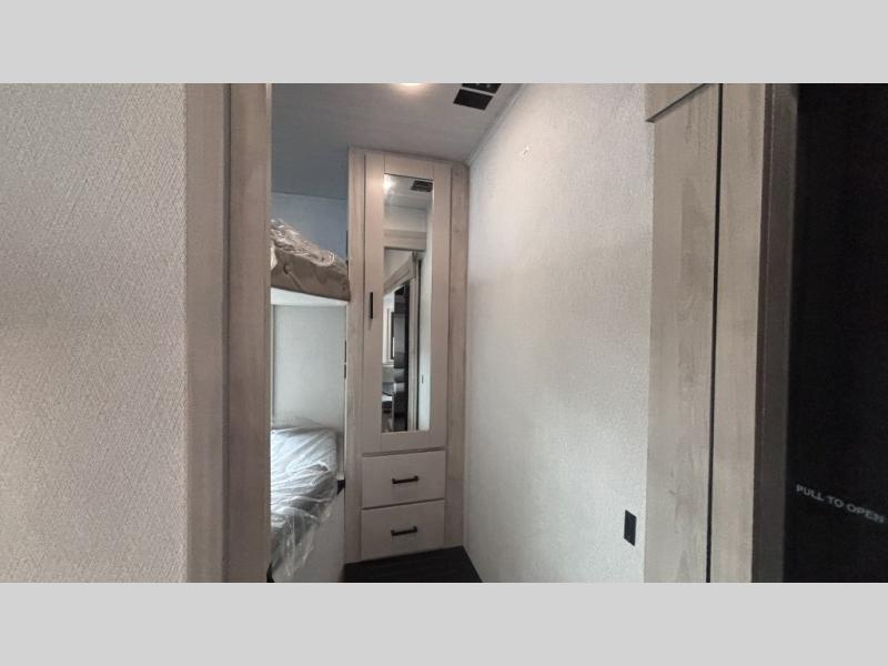 If you've been searching for a fifth wheel for your whole crew, you can stop looking! This model includes a rear private bunkhouse with a sliding door for more space, double-size bunks, plus a closet for your guests' things. You can cook indoors in the fully-equipped kitchen or head outdoors to use the outside kitchen. There is also a 20' power awning outside, a universal docking station, plus a 2" towing hitch if you need to haul more gear. If the weather isn't cooperating, you can stay indoors to relax on the sofa or play a game around the U-shaped dinette, and there is a 50" LED TV to make it a movie night! Since you'll be camping with more people, you will appreciate having your own space in the front private bedroom, complete with a king bed, overhead cabinets, and a wardrobe!