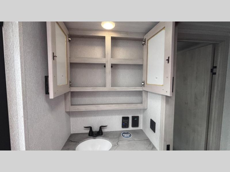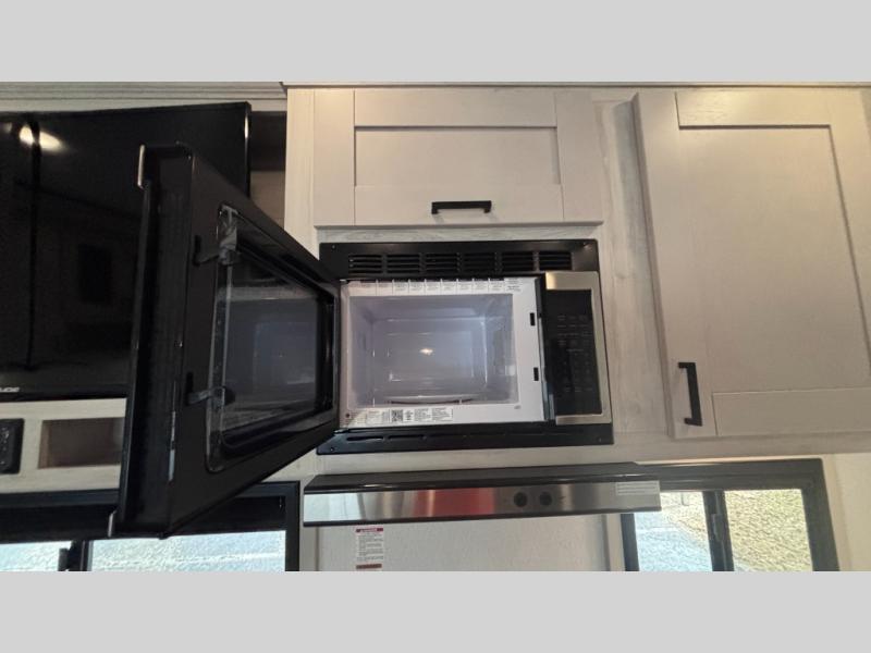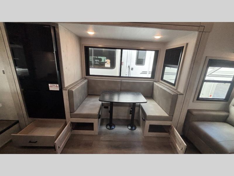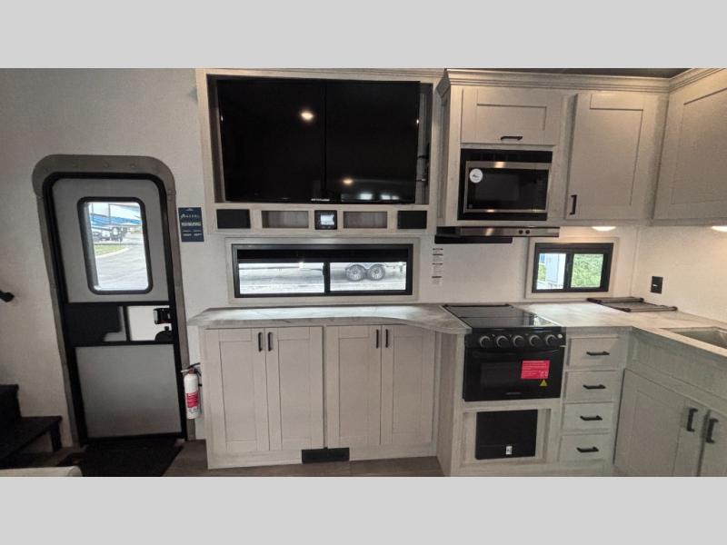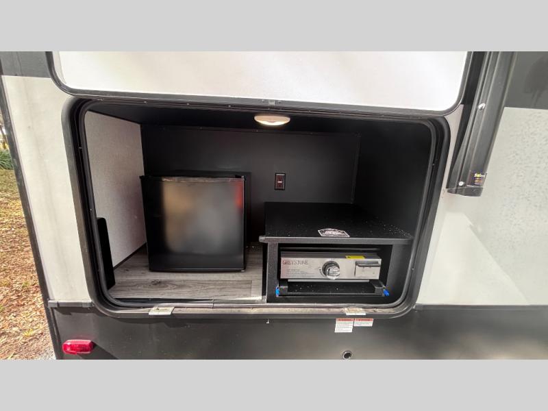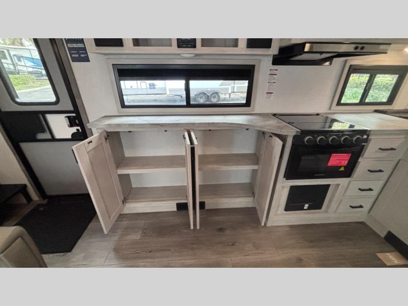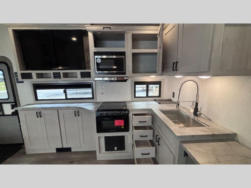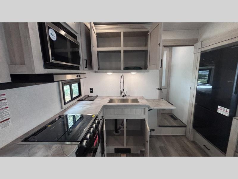 If you've been searching for a fifth wheel for your whole crew, you can stop looking! This model includes a rear private bunkhouse with a sliding door for more space, double-size bunks, plus a closet for your guests' things. You can cook indoors in the fully-equipped kitchen or head outdoors to use the outside kitchen. There is also a 20' power awning outside, a universal docking station, plus a 2" towing hitch if you need to haul more gear. If the weather isn't cooperating, you can stay indoors to relax on the sofa or play a game around the U-shaped dinette, and there is a 50" LED TV to make it a movie night! Since you'll be camping with more people, you will appreciate having your own space in the front private bedroom, complete with a king bed, overhead cabinets, and a wardrobe!