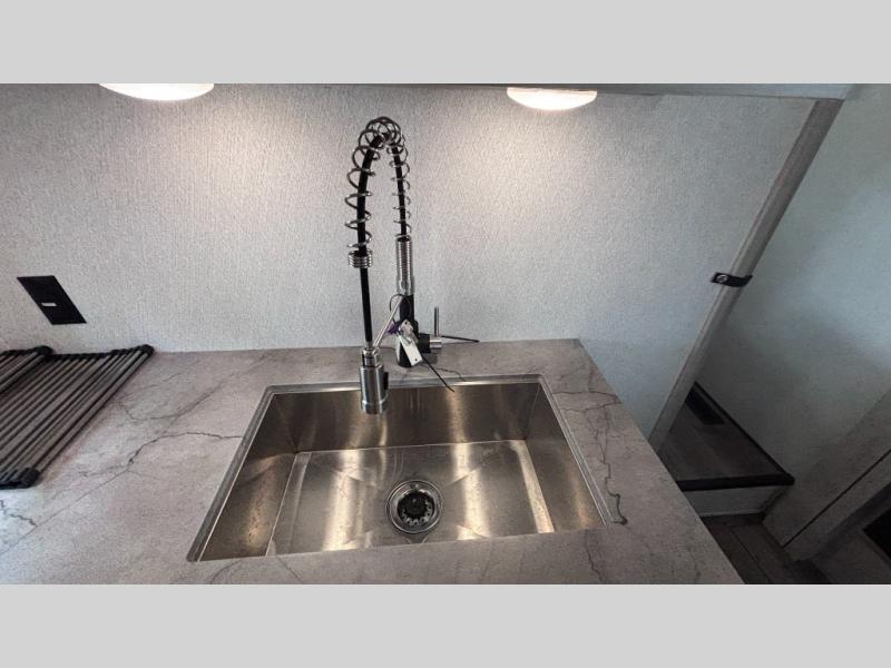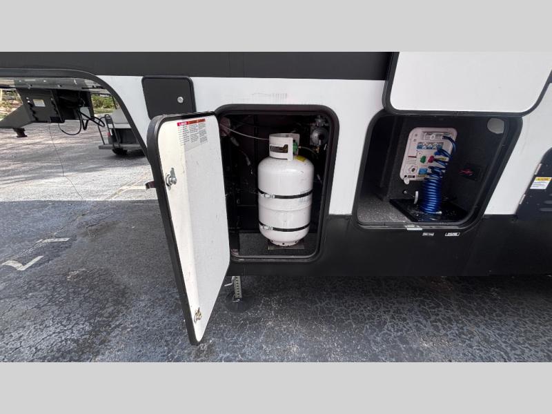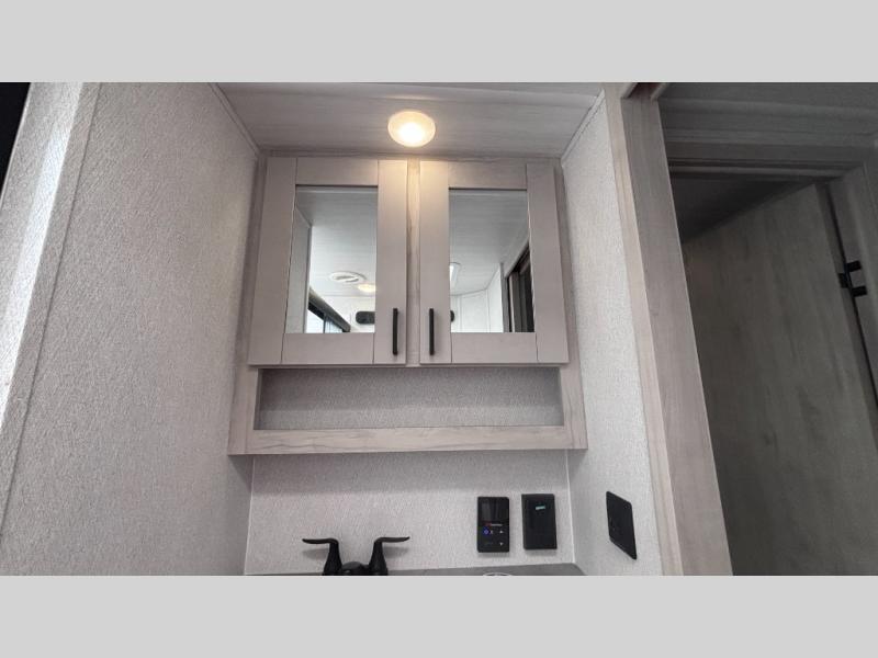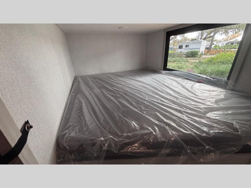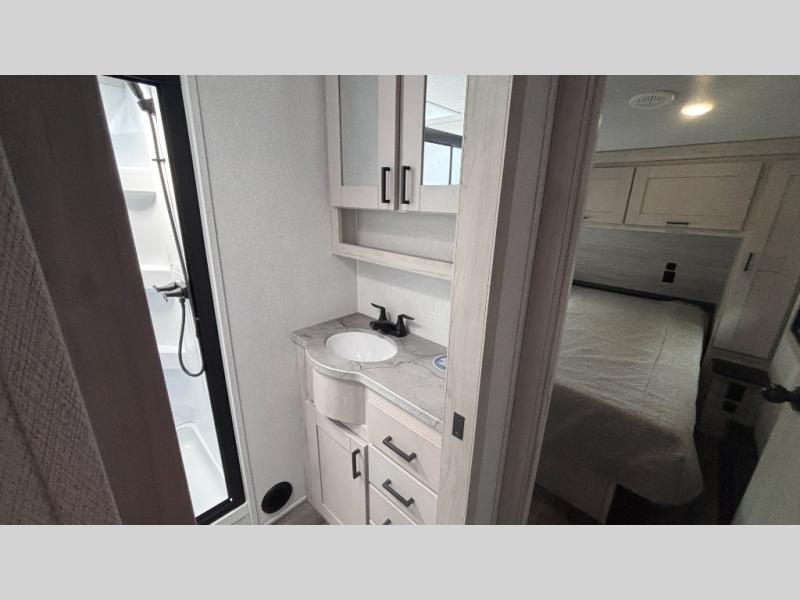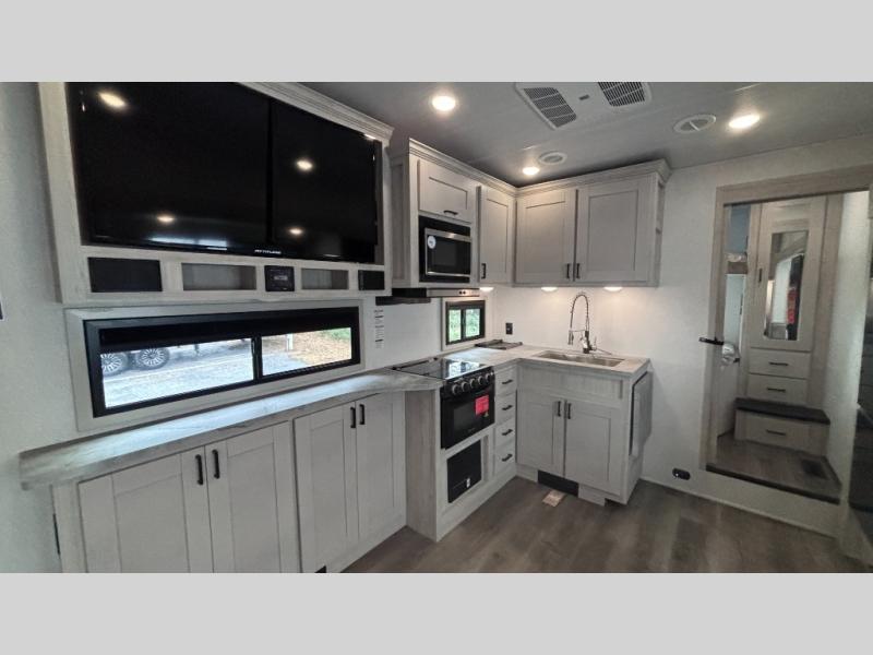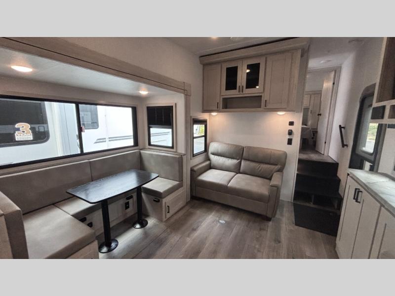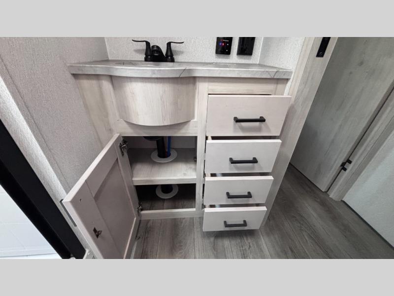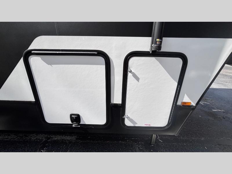 If you've been searching for a fifth wheel for your whole crew, you can stop looking! This model includes a rear private bunkhouse with a sliding door for more space, double-size bunks, plus a closet for your guests' things. You can cook indoors in the fully-equipped kitchen or head outdoors to use the outside kitchen. There is also a 20' power awning outside, a universal docking station, plus a 2" towing hitch if you need to haul more gear. If the weather isn't cooperating, you can stay indoors to relax on the sofa or play a game around the U-shaped dinette, and there is a 50" LED TV to make it a movie night! Since you'll be camping with more people, you will appreciate having your own space in the front private bedroom, complete with a king bed, overhead cabinets, and a wardrobe!