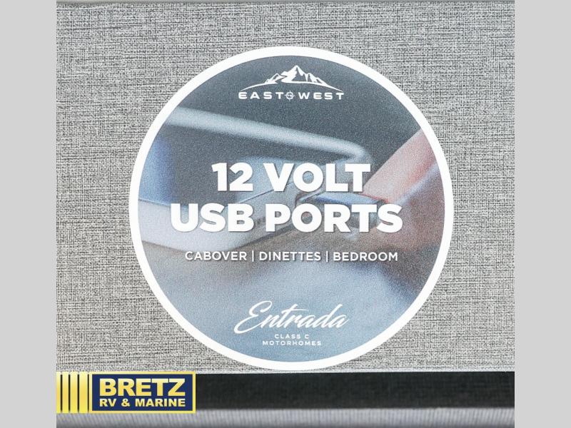 With any Entrada Class C gas motorhome from EAST TO WEST, the construction consists of an automotive painted fiberglass front cap, a Dicor DiFlex ll TPO roof membrane, and Azdel composite sidewalls for added durability. Some of the Entrada value package features include 12V tank heaters to camp during the cooler months, the Winegard Air 360+, plus backup and sideview cameras with a monitor for safety on and off the road. The interior offers a 7-foot interior height for a spacious feel, and 12V USB charge ports will keep your electronics powered up. Choose an Entrada for its tasteful design, attention to detail, bright interior and affordable price-point!