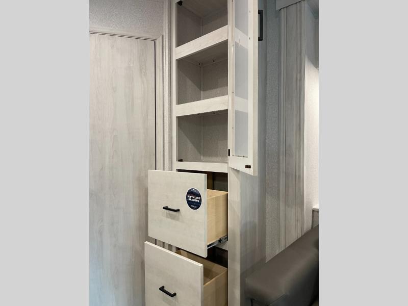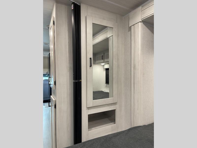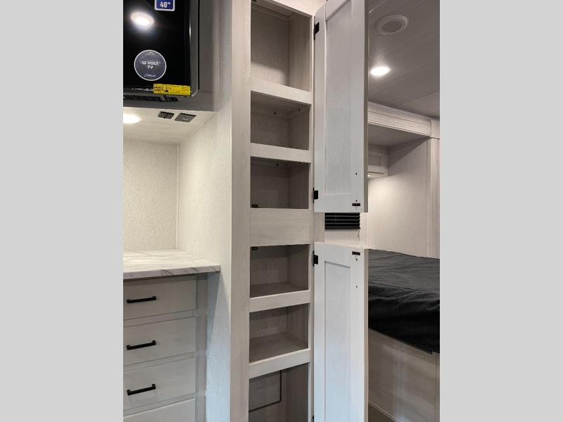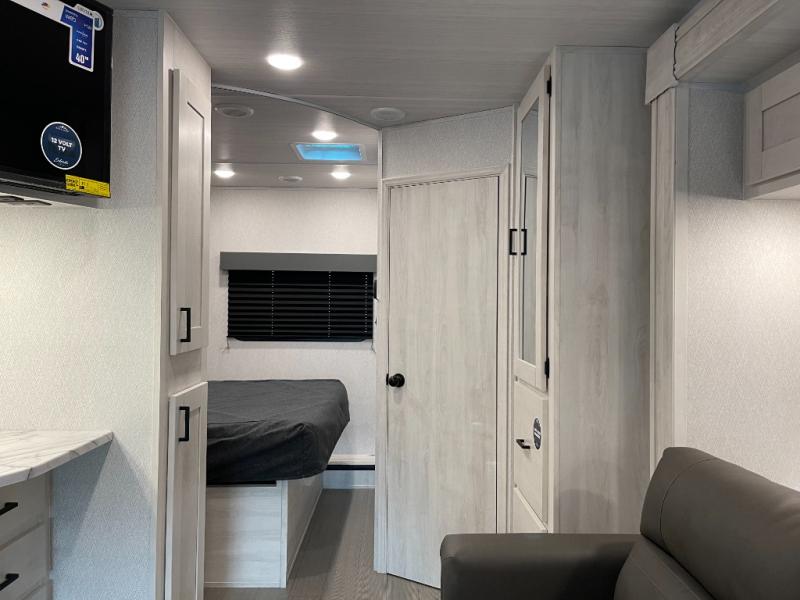 You can explore and discover so many new destinations with this Entrada Class C gas motorhome! The first thing that you'll notice about this coach is that it has extra interior living space because of the two slides. One of those slides holds the queen-size bed back in the private bedroom, and the bedroom is sectioned off from the rest of the coach with an accordion door. The full bathroom is right next to the bedroom so that you can quickly and effortlessly hop in the shower each morning. Outside of the bathroom, you'll find a linen closet which can hold your towels or toiletries, and the kitchen pantry can hold your snacks. This coach even has an TV for inside entertainment, so you can sit back on the sofa or booth dinette and watch with pleasure.