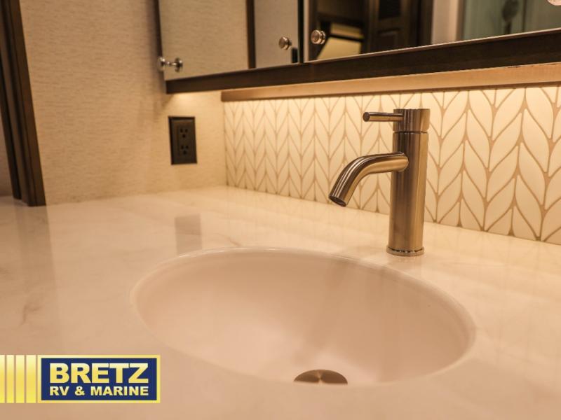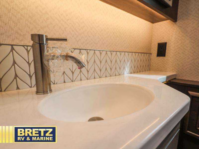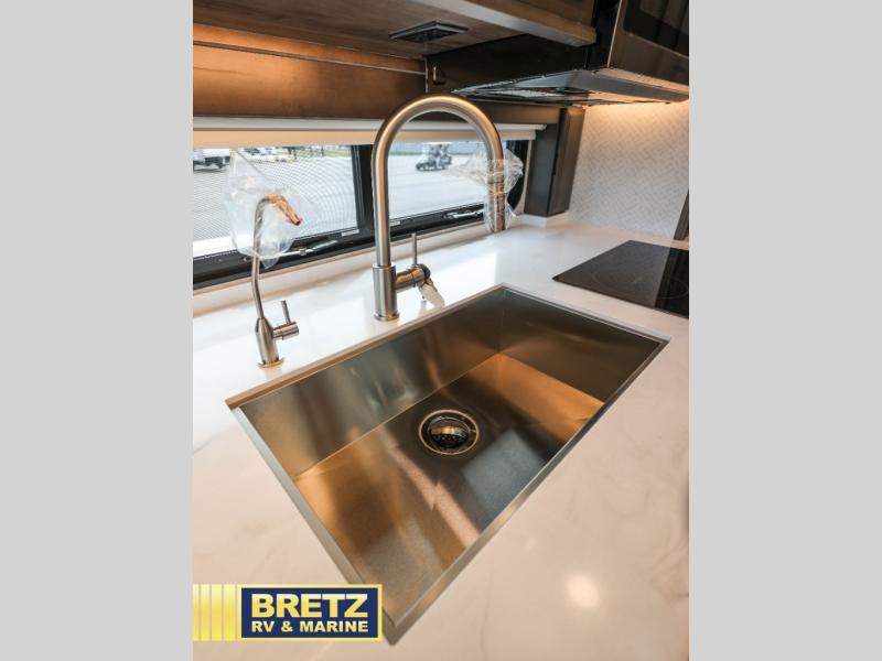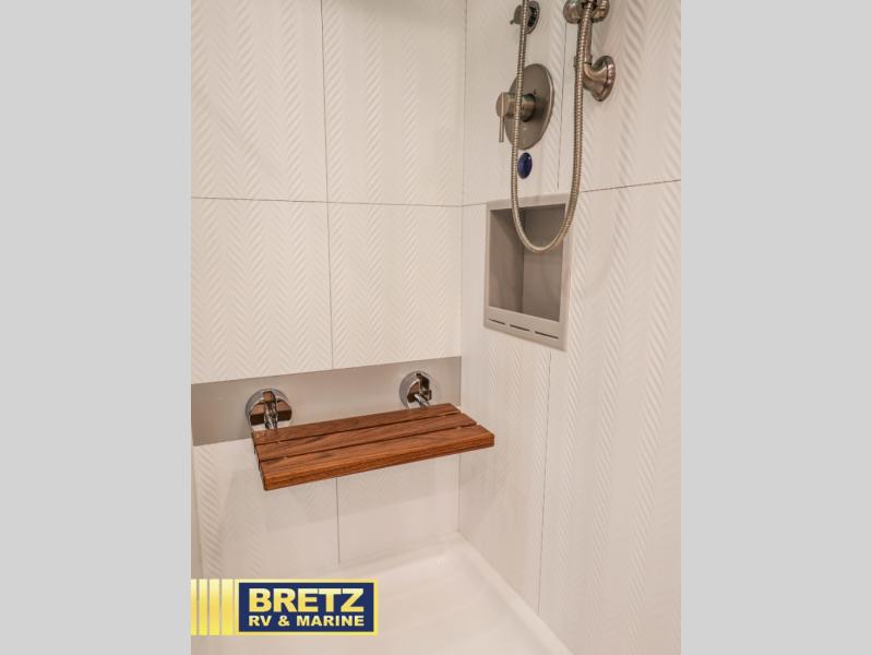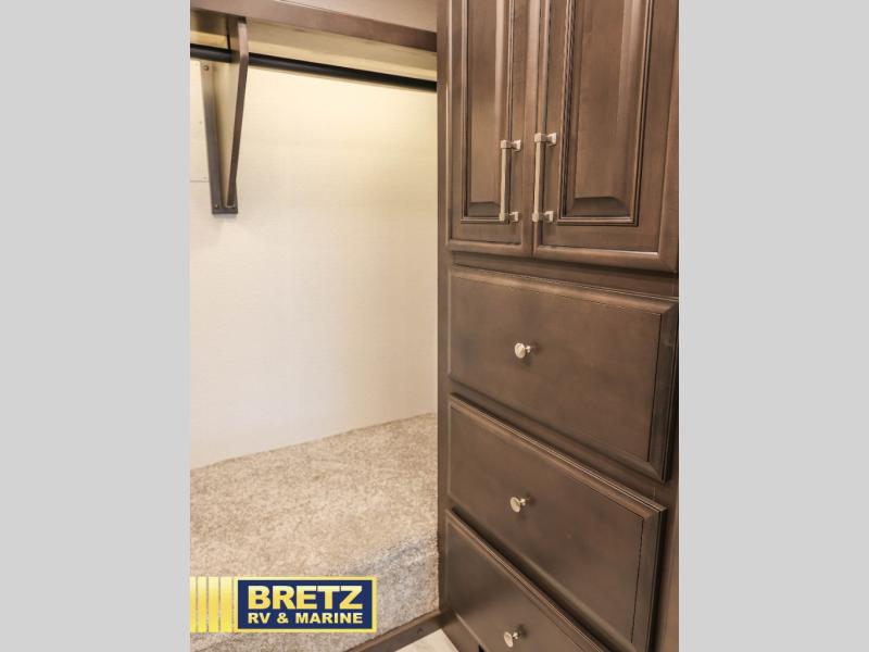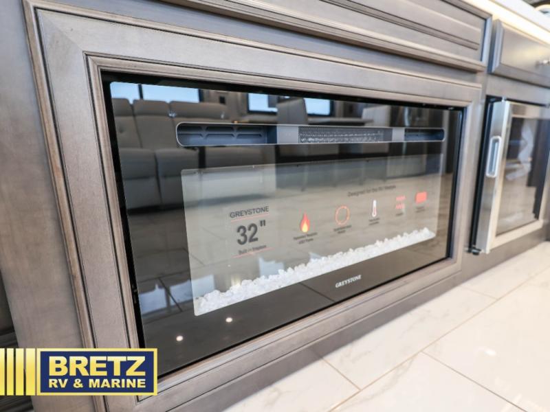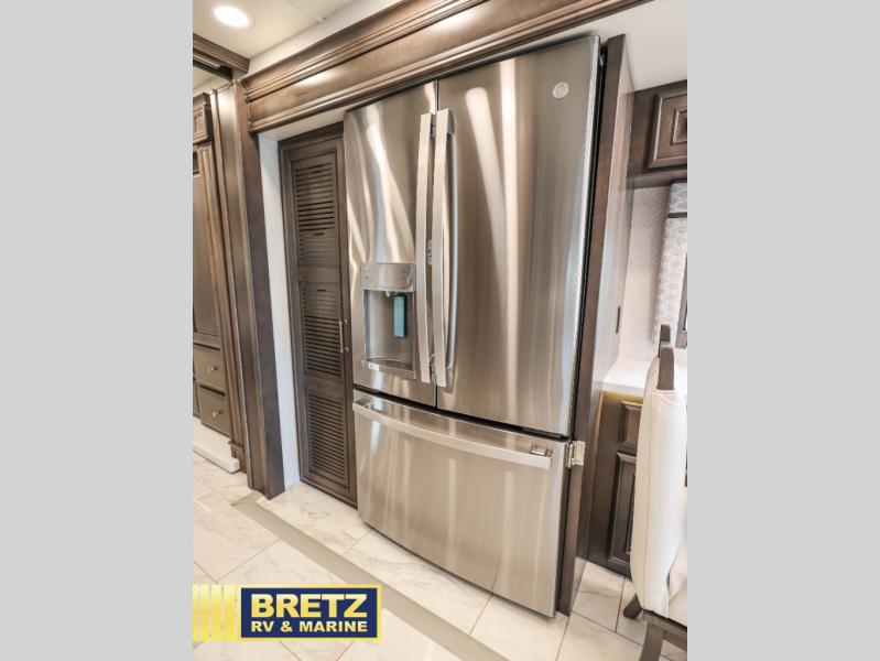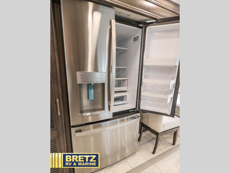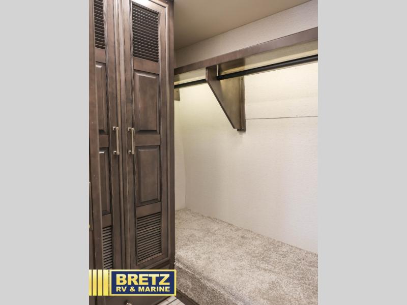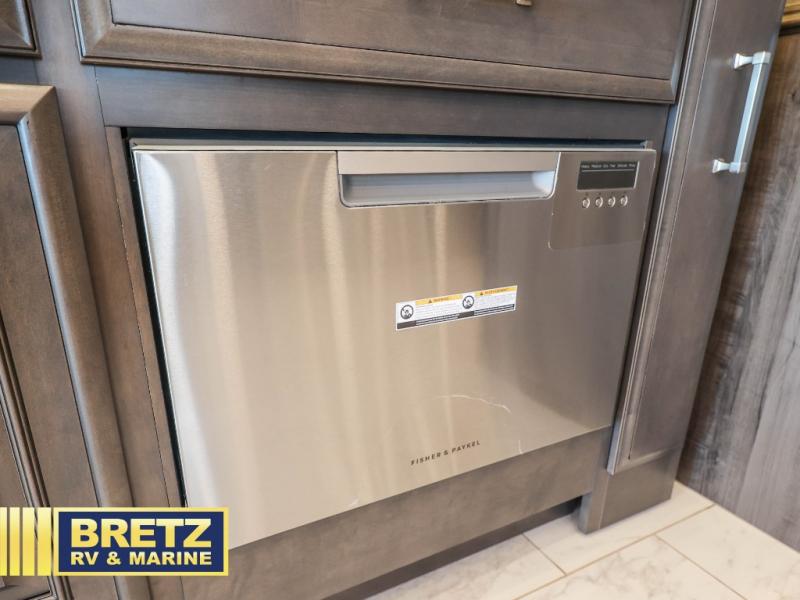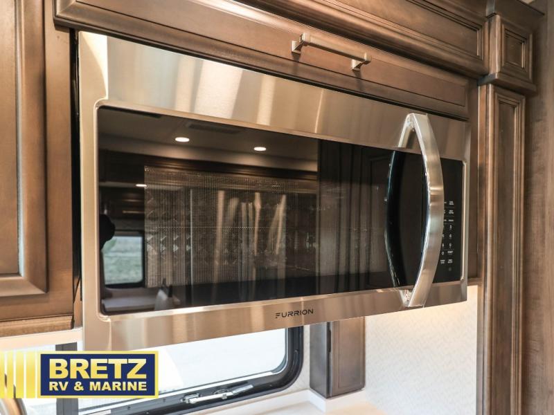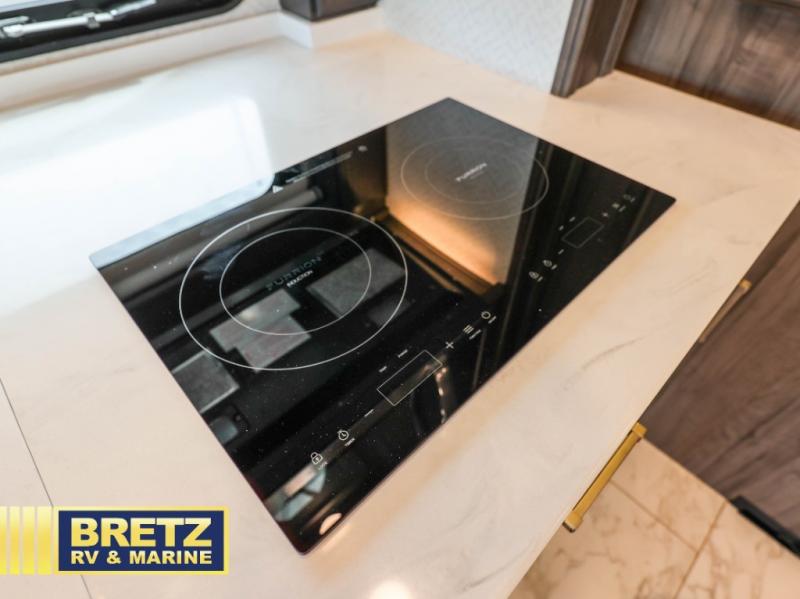 If you're looking for more space for your things, you're going to love this coach with a large walk-in closet in the rear bathroom! There are two storage cabinets in the closet, plus a Splendide stackable washer and dryer for convenience. The master bedroom includes a king bed slide out for comfort, and any guests you have can sleep on the hide-a-bed sofa in the main living area. You'll also find power theater seating here across from the 50" TV on lift, plus a free-standing dinette table. This Aspire kitchen includes everything you need to make home cooked meals each day, including a two burner induction cooktop, a convection microwave, plus a stainless steel residential refrigerator for perishables. After your meal is cleaned up, you may want to head outdoors to relax under the power awnings and enjoy the outside entertainment center with a 43" TV!