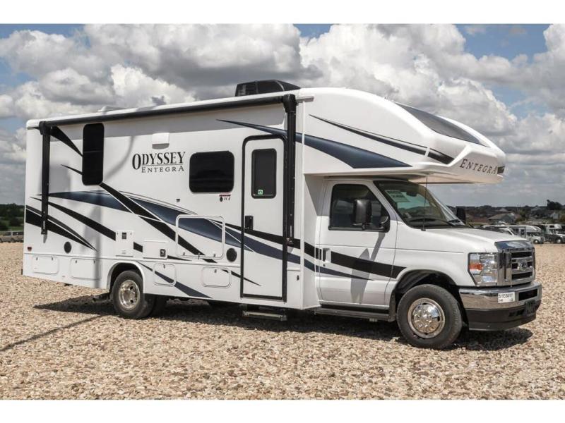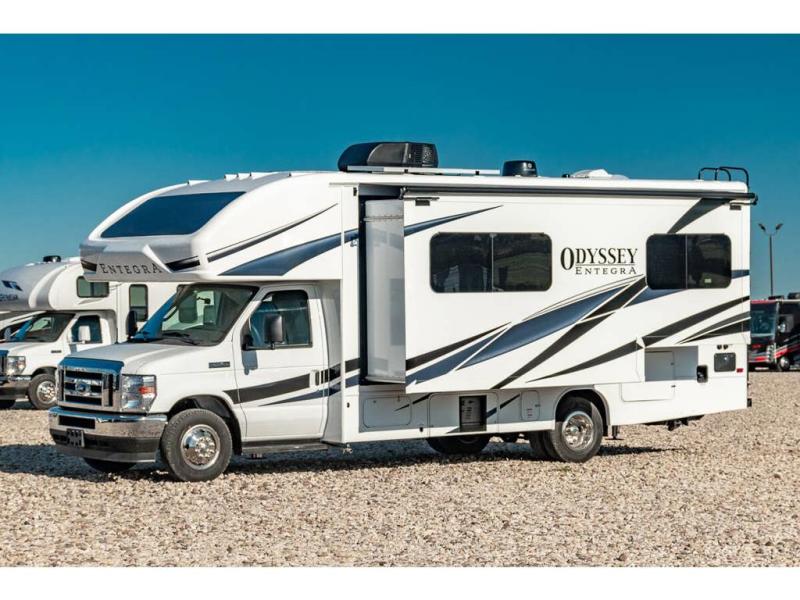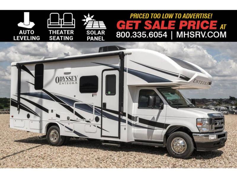 MSRP $172,360. New 2025 Entegra Odyssey 24B Luxury Class C RV. The Odyssey features a one-piece seamless fiberglass roof, front and rear stabilizer bars, Hellwig Helper springs, and the all-new Ford® V8 and E-450 chassis. You will also love the Entegra Coach Odyssey's amazing molded front fiberglass cap that distinguishes this class C from any other on the market today. The distinctive design also enables the front cab-over to feature a huge built-in skylight with power shade. Just push a button and let Mother Nature light up the beautiful interior décor and gaze at the stars at the end of a fun-filled day. New features for 2025 include upgrades to a JBL audio system, new decor options, and a new sony dash unit with tilt feature. Options include the theater seats, hydraulic leveling, sun folding windshield shade, solar panel with dual controller, second house battery, bedroom TV and the customer value package. For additional details on this unit and our entire inventory including brochures, window sticker, videos, photos, reviews & testimonials as well as additional information about Motor Home Specialist and our manufacturers please visit us at MHSRV.com or call 800-335-6054. At Motor Home Specialist, we DO NOT charge any prep or orientation fees like you will find at other dealerships. All sale prices include a 200-point inspection, interior & exterior wash, detail service and a fully automated high-pressure rain booth test and coach wash that is a standout service unlike that of any other in the industry. You will also receive a thorough coach orientation with an MHSRV technician, a night stay in our delivery park featuring landscaped and covered pads with full hook-ups and much more! Read Thousands upon Thousands of 5-Star Reviews at MHSRV.com and See What They Had to Say About Their Experience at Motor Home Specialist. WHY PAY MORE? WHY SETTLE FOR LESS?