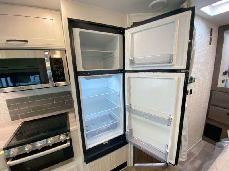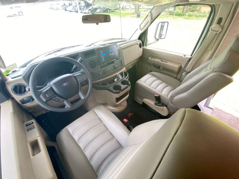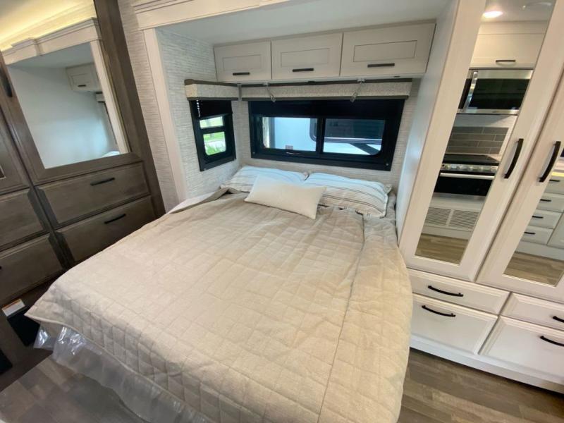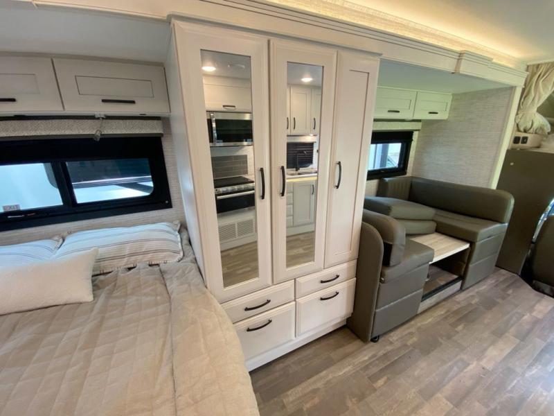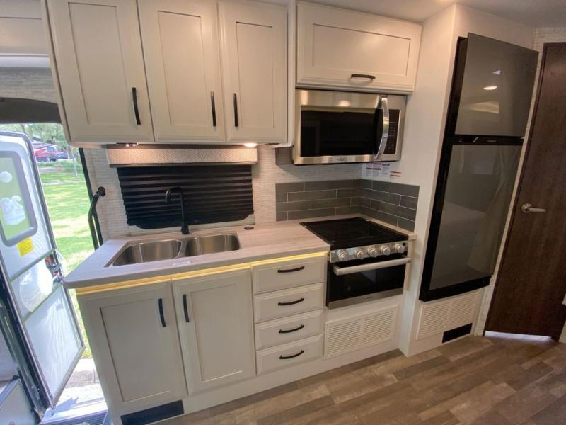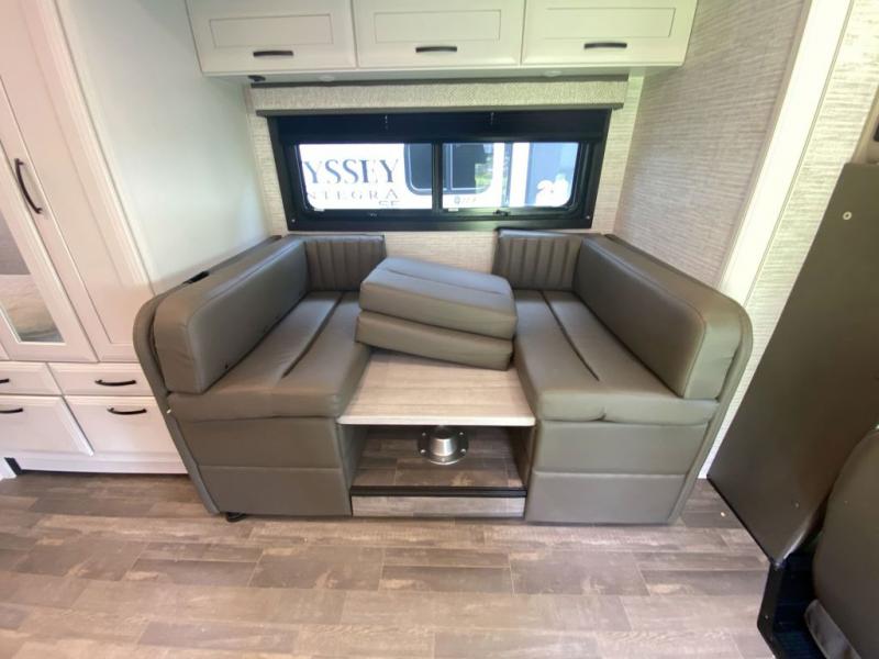 With any Odyssey Class C gas motorhome by Entegra Coach, the driver will appreciate the power from the 325 HP engine, the towing capacity from the 7,500 lb. hitch, the tire pressure monitoring system, the navigation from the Sony infotainment center with Apple CarPlay and Android Auto, plus the backup and side-view cameras when parking and driving down the highway. The kitchen offers full amenities including a recessed stainless steel sink with a cutting board sink cover, LED-lit countertops, a decorative backsplash, and a pop-up charging station with 110 outlet and USB plugs to keep your smart phones charged. Get ready for luxury in a Class C, choose your favorite today!