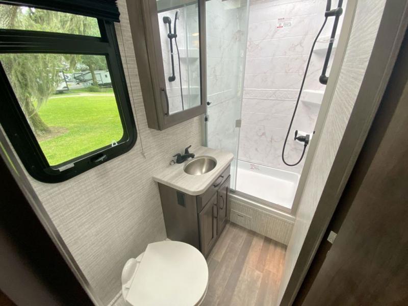 Looking to travel to see family and friends while stopping along the way to take in the scenery? Need comfortable accommodations for you and another plus extra sleeping space when you have overnight guests? This coach provides a full-wall slide for more interior floor space and includes a queen bed for a good night's sleep, a wardrobe for clothing, plus a U-shaped dinette and pantry. The dinette doubles as sleeping space, plus you have a cab-over bunk. The cook will have everything nearby to whip up meals including a residential-size microwave, and the full bathroom allows everyone to skip the public facilities along the way.