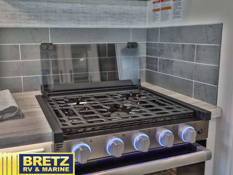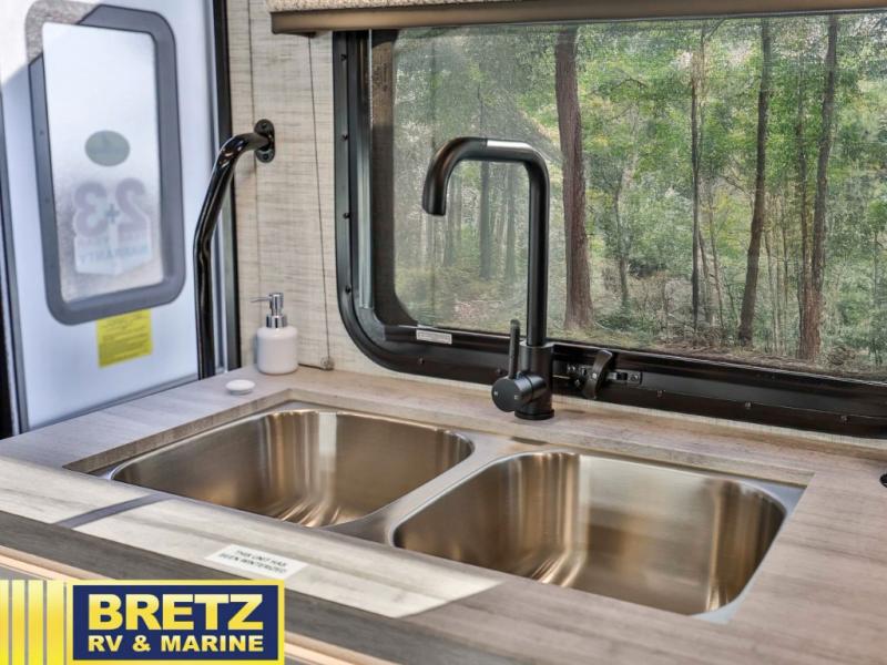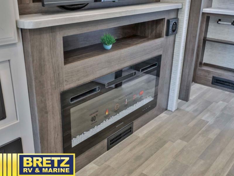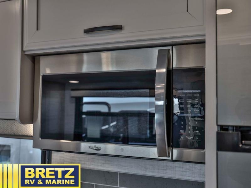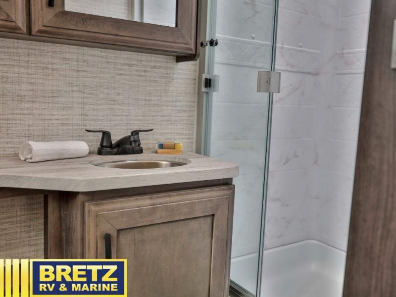 Enjoy a whole lot of comfort, fun and versatility in this coach! The queen Murphy bed and sofa combination allows you to convert between a living area and a bedroom, with a fireplace and an LED HD Smart TV. Outside, the exterior TV and 19' electric awning provide you an outdoor living space to enjoy nature and its beauty. The inside also provides a rear full bathroom including a space saving sliding door, linen storage, counter space for toiletries and a shower. You can dine at the U-shaped dinette or while sitting on the swivel captains chairs, and the cab-over bunk will be a perfect place to stay the night.