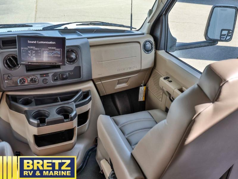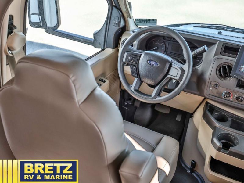 With any Odyssey Class C gas motorhome by Entegra Coach, the driver will appreciate the power from the 325 HP engine, the towing capacity from the 7,500 lb. hitch, the tire pressure monitoring system, the navigation from the Sony infotainment center with Apple CarPlay and Android Auto, plus the backup and side-view cameras when parking and driving down the highway. The kitchen offers full amenities including a recessed stainless steel sink with a cutting board sink cover, LED-lit pressed countertops, a decorative backsplash, and a pop-up charging station with 110 outlet and USB plugs to keep your smart phones charged. Get ready for luxury in a Class C, choose your favorite today!