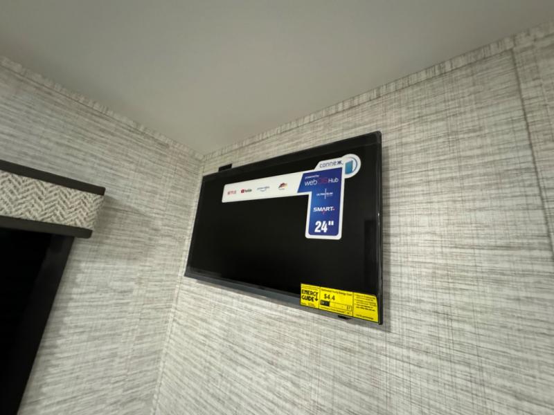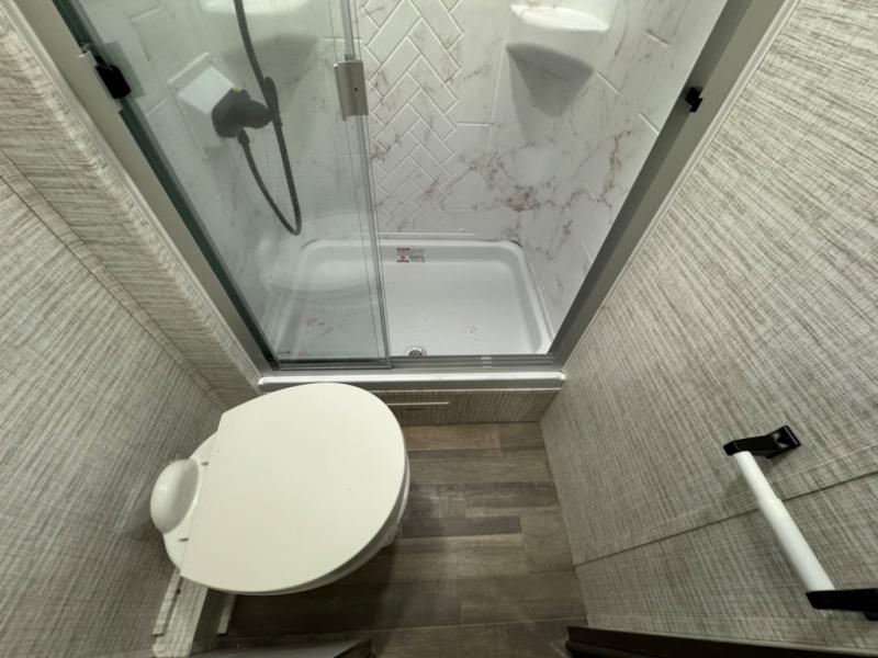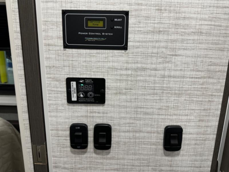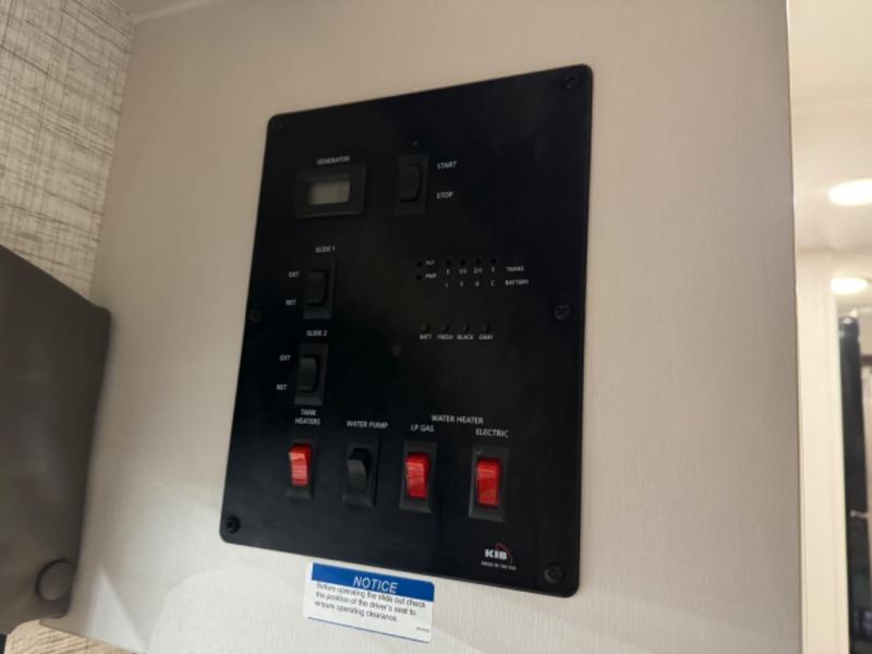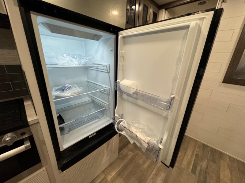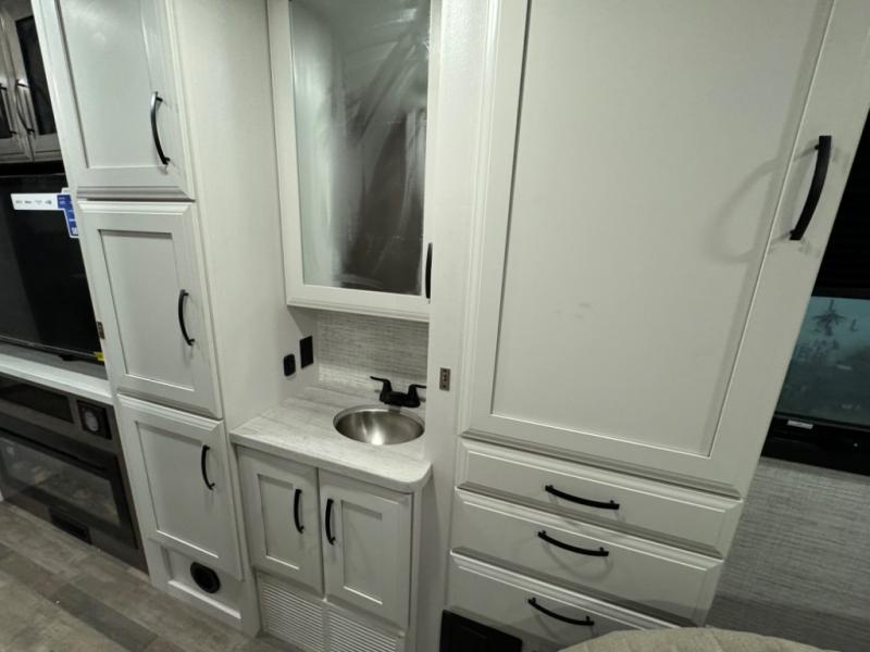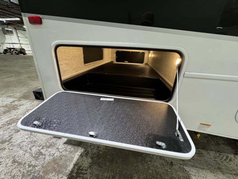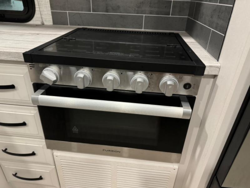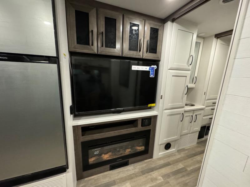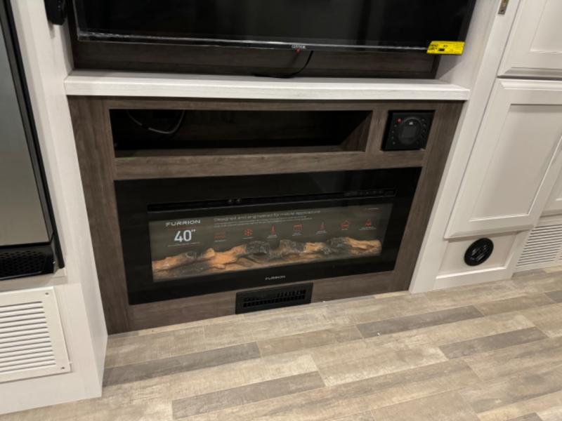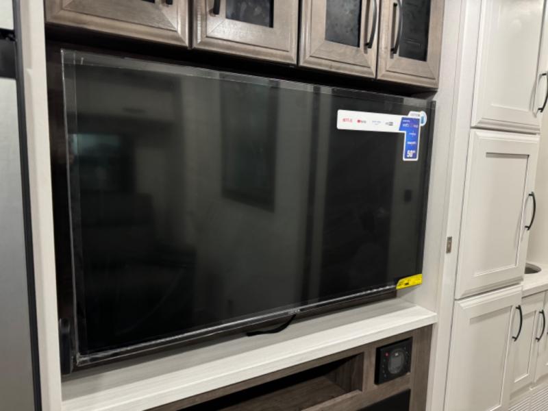 Relax inside while sitting on the sofa, at the booth dinette or on the swivel captains chairs while enjoying the fireplace and 50" TV, or unwind outside under the 18' electric awning while watching the exterior TV. After shopping in town or hiking the trails you can get cleaned up in the private toilet and shower room then brush your teeth in the bathroom sink a few steps outside the door. The private bedroom includes a space saving sliding door, a unique rear queen bed slide, plus storage. The cook will enjoy making meals using the residential-size microwave and Furrion all-in-one cooktop and oven, then storing leftovers in the 8 cu. ft. refrigerator. And the L-shaped counter with sink will come in handy.