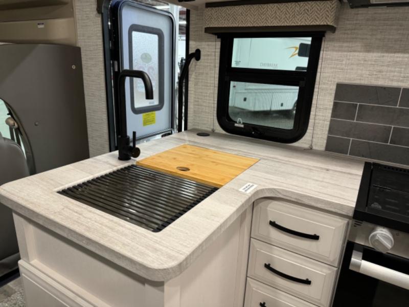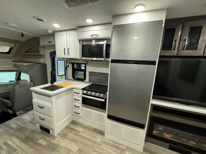 With any Odyssey Class C gas motorhome by Entegra Coach, the driver will appreciate the power from the 325 HP engine, the towing capacity from the 7,500 lb. hitch, the tire pressure monitoring system, the navigation from the Sony infotainment center with Apple CarPlay and Android Auto, plus the backup and side-view cameras when parking and driving down the highway. The kitchen offers full amenities including a recessed stainless steel sink with a cutting board sink cover, LED-lit pressed countertops, a decorative backsplash, and a pop-up charging station with 110 outlet and USB plugs to keep your smart phones charged. Get ready for luxury in a Class C, choose your favorite today!